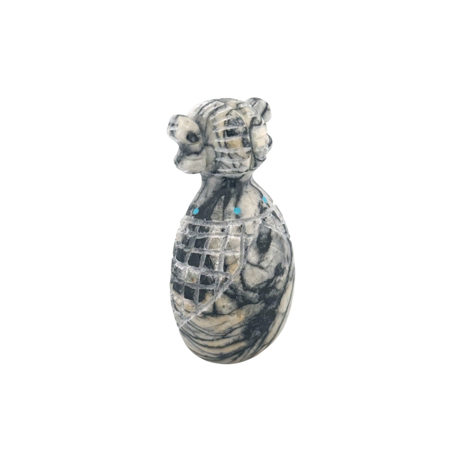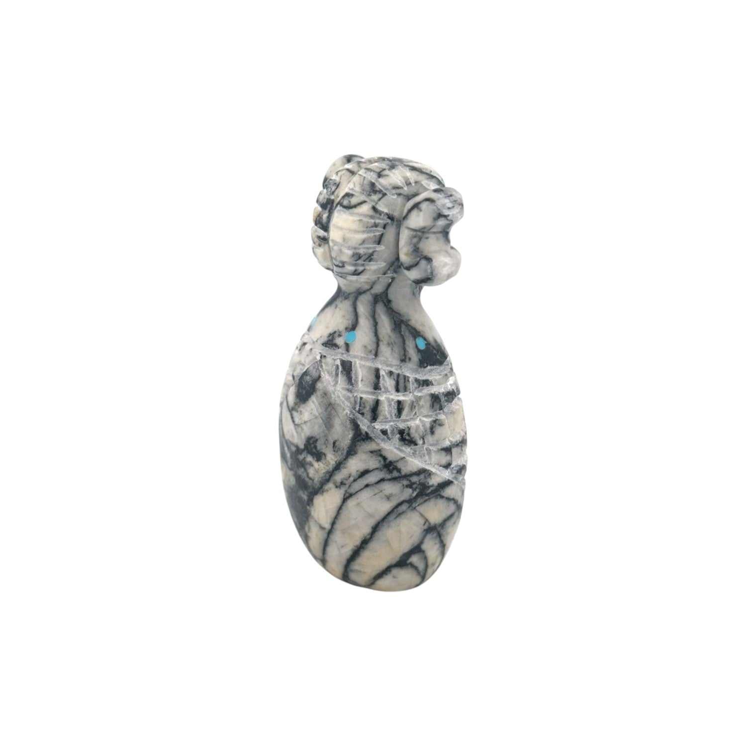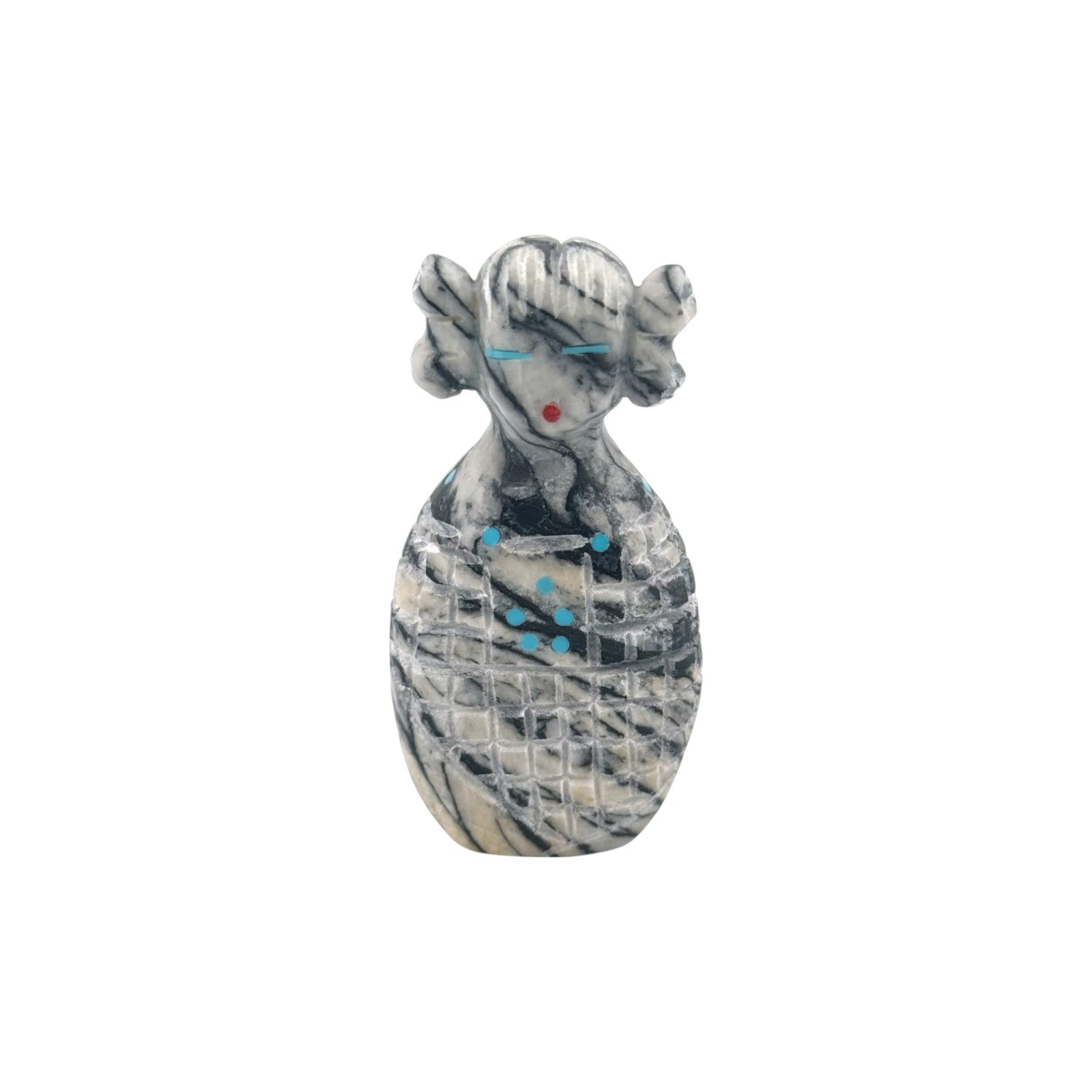 This Zuni hand-carved maiden fetish is beautifully shaped from zebra jasper, its striking black-and-white striations symbolizing balance and harmony. The figure is delicately detailed, with finely incised patterns across her dress and traditional hairstyle rendered with care. Inlaid turquoise accents form a necklace, adding a vivid touch of color that contrasts elegantly with the stone’s natural tones. Her serene expression, with inlaid jet eyes and a coral-painted mouth, reflects themes of nurturing, beauty, and cultural pride. In Zuni tradition, maiden fetishes are often associated with fertility, protection, and the continuation of tradition. The smooth polish and organic texture of the jasper make this piece both visually captivating and comforting to hold.