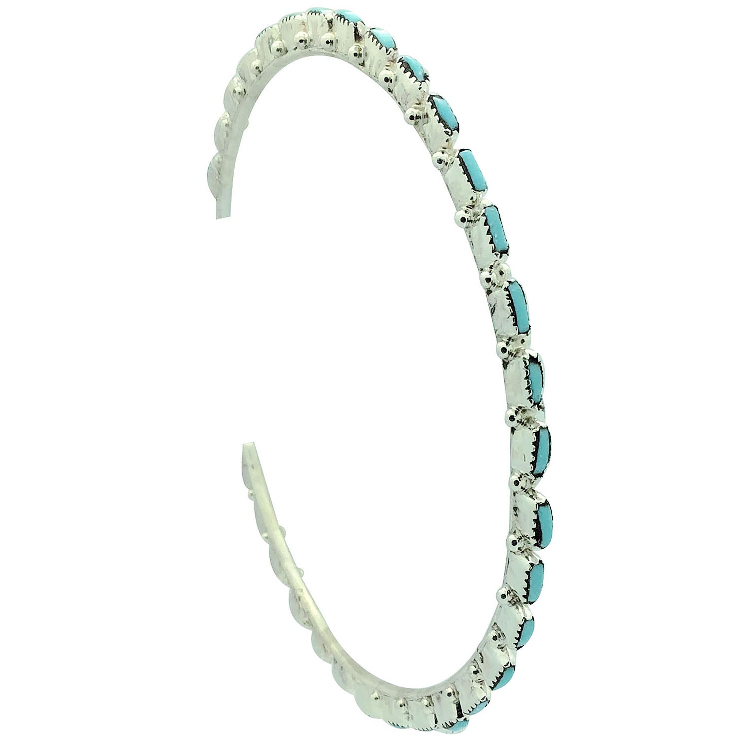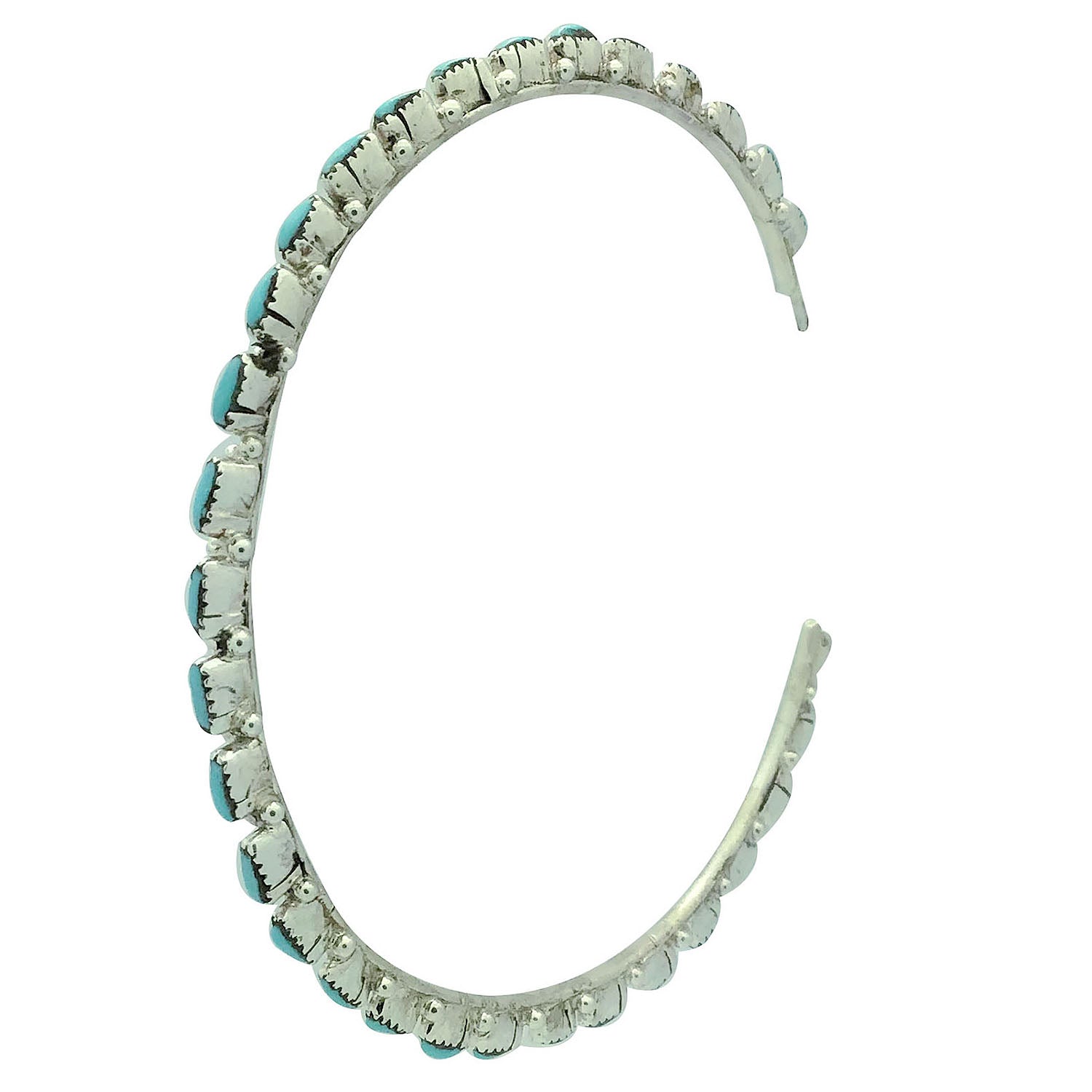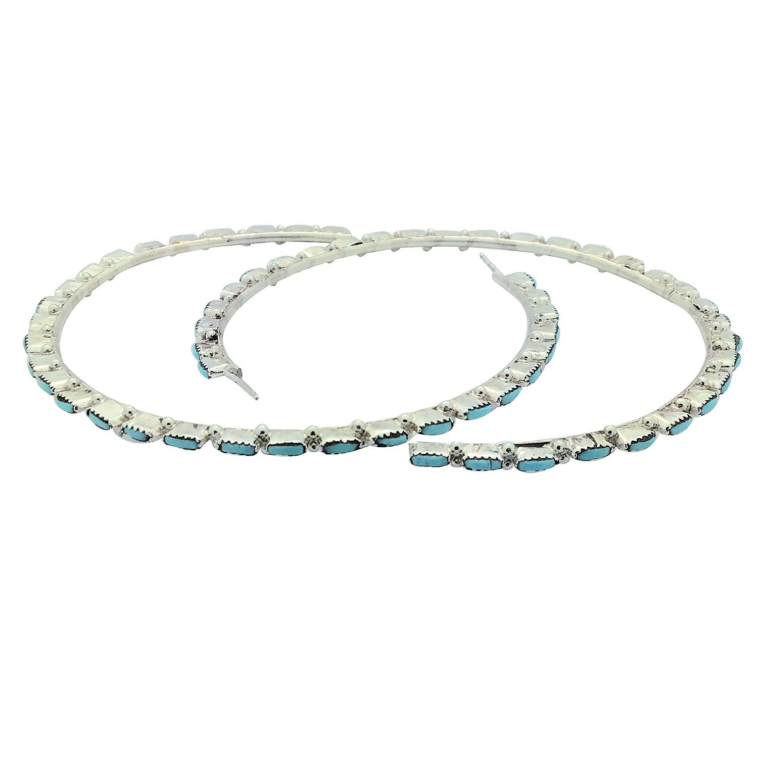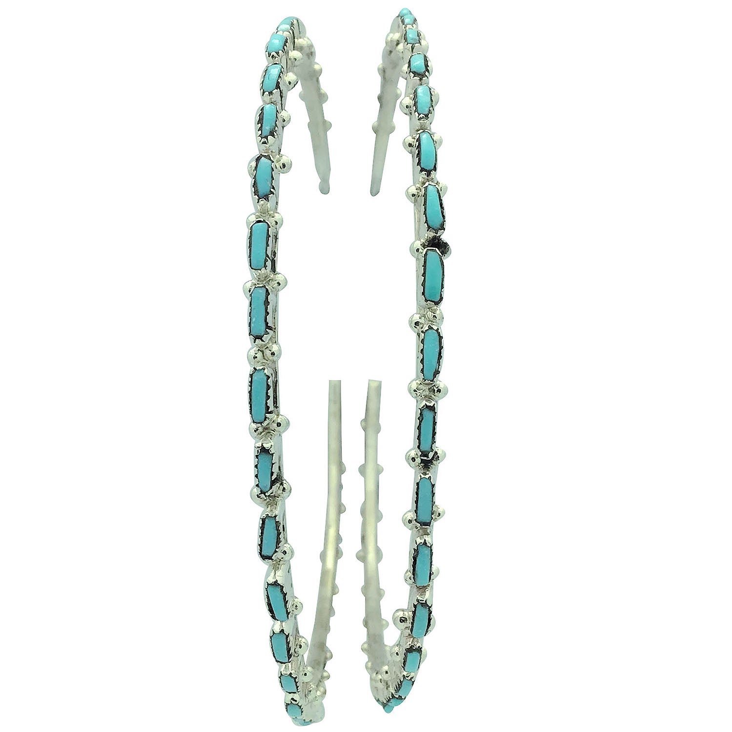 These amazing Zuni earrings are stunning. They are made in a signature Zuni style, needlepoint by Alvin & Aurelia Hughte. Small sky blue pieces of Sleeping Beauty Turquoise have been hand picked and shaped for these amazingly huge hoops. Each earring has thirty-one stones and small silver drops surround them. A great earring that will really give you your own style.