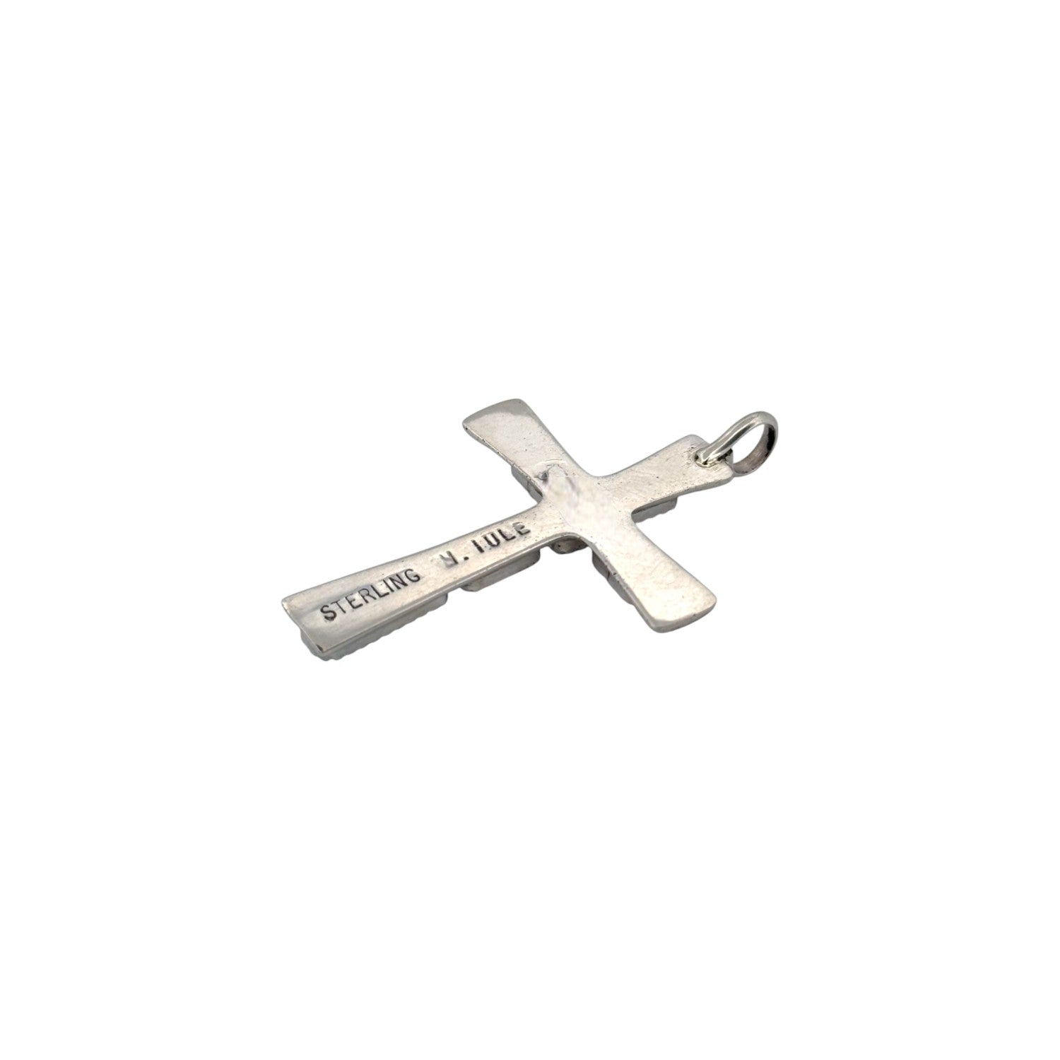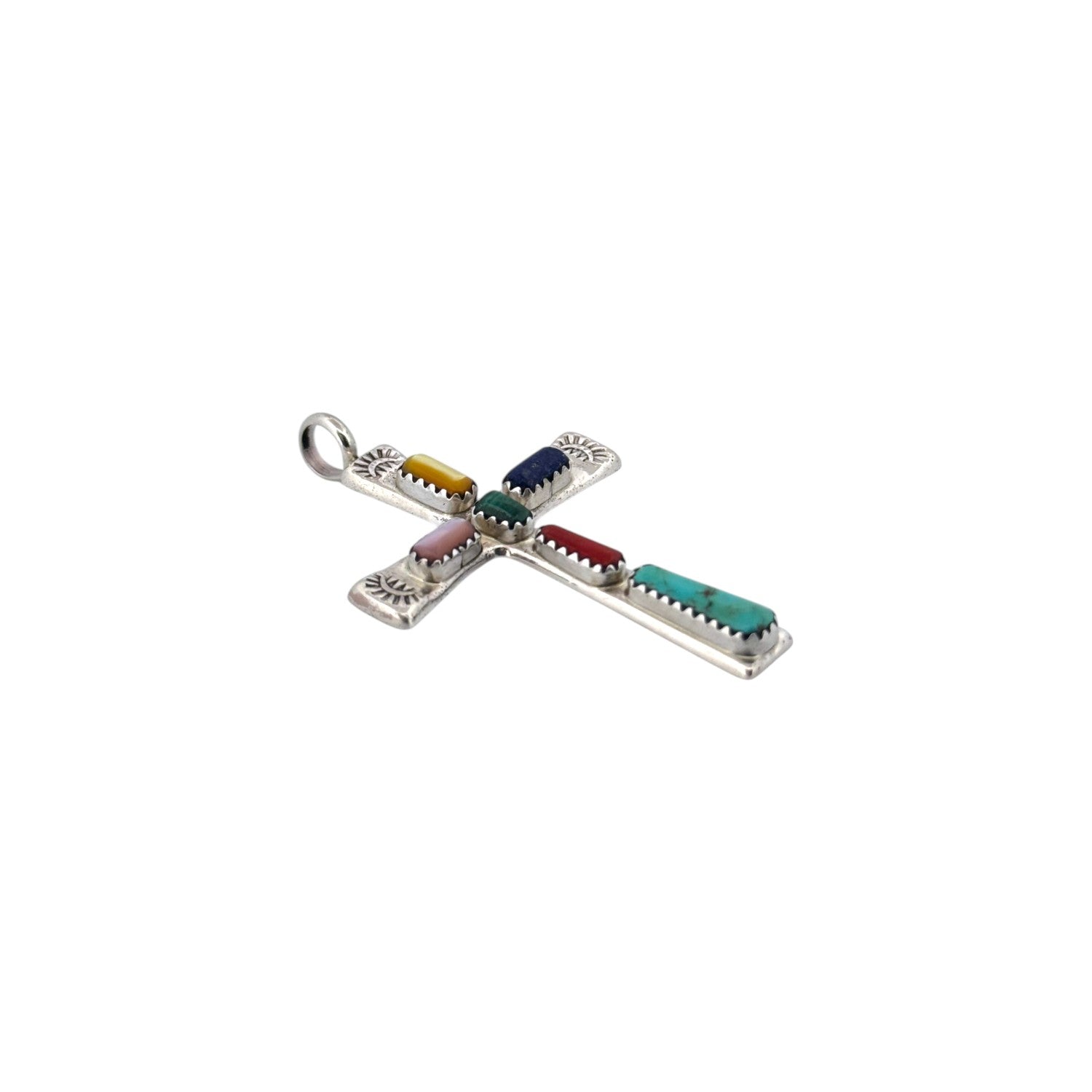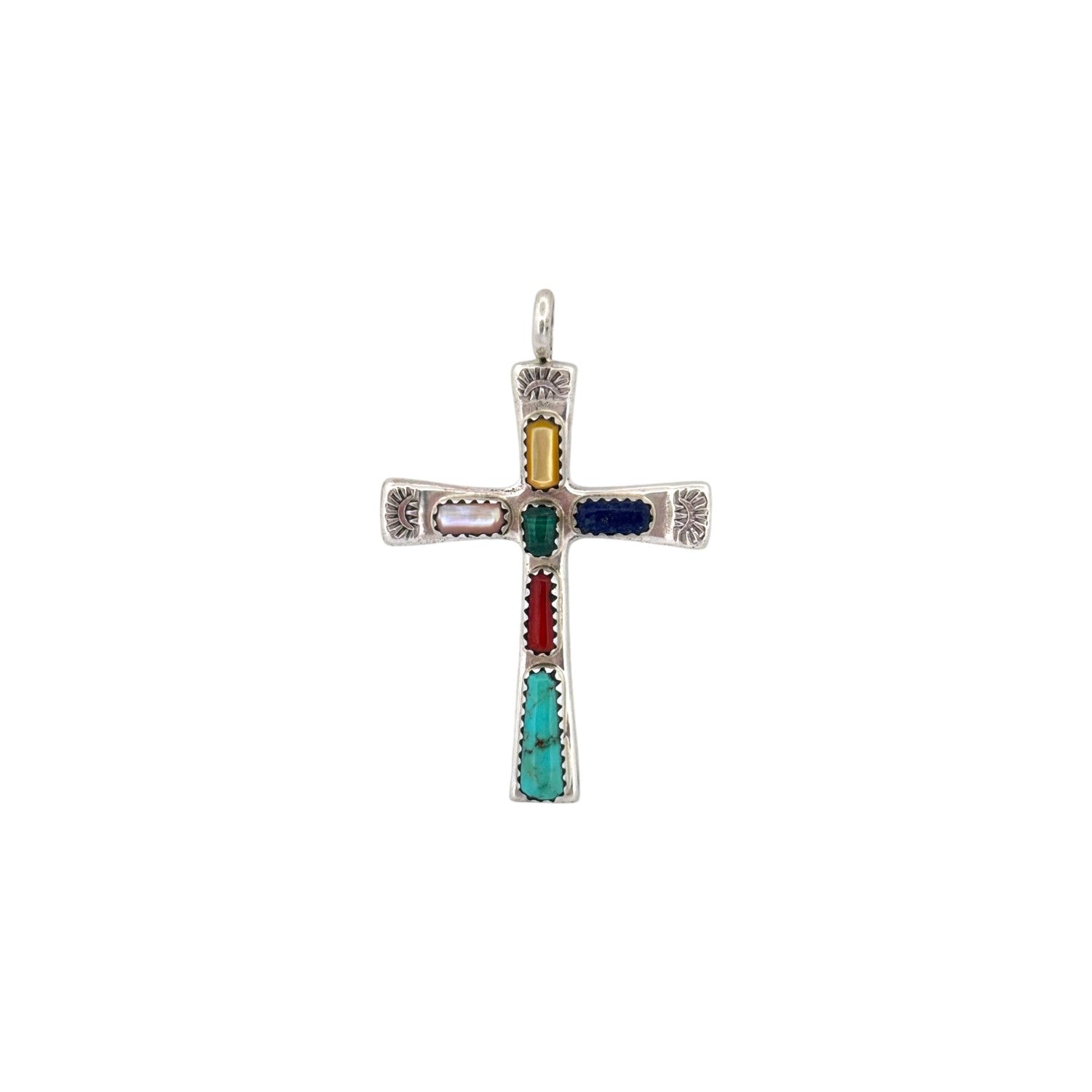 Wilbur Iule's masterful artistry shines through in this exquisite Zuni handmade multi-stone cross pendant. Crafted from sterling silver, this elegant piece features a vibrant array of stones including green Kingman turquoise, coral, lapis, pink shell, malachite, and yellow shell. Each stone is carefully handset, creating a colorful mosaic that symbolizes harmony and unity. The sterling silver frame is adorned with delicate hand-stamped designs, adding depth and texture to the piece. This cross pendant beautifully blends spiritual symbolism with traditional Zuni craftsmanship, making it a meaningful statement of faith and artistry.