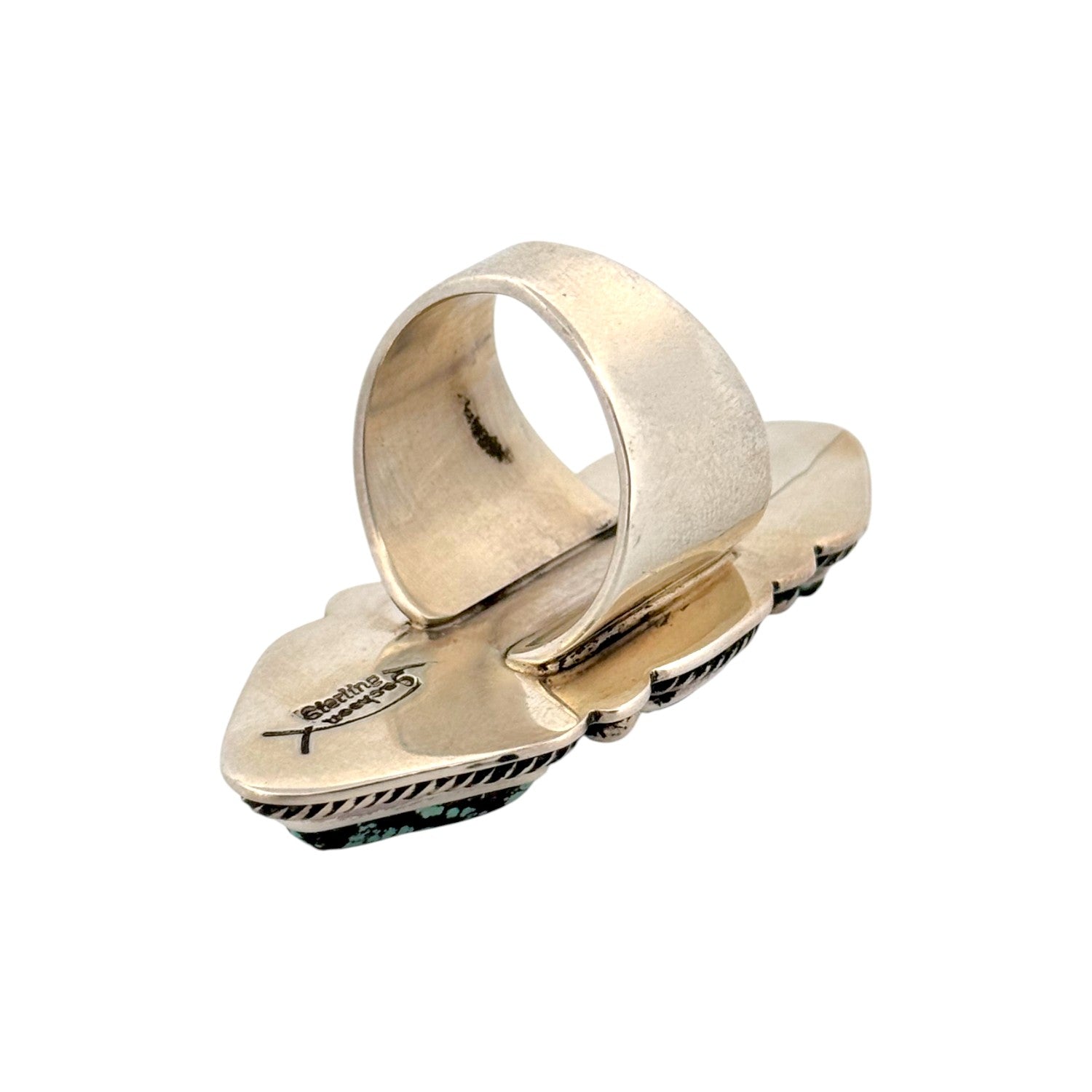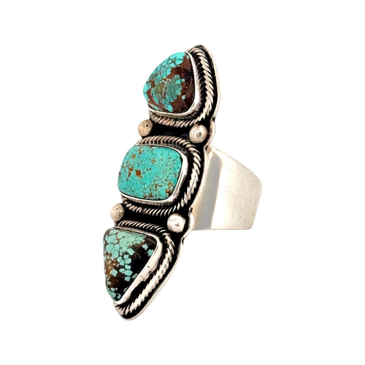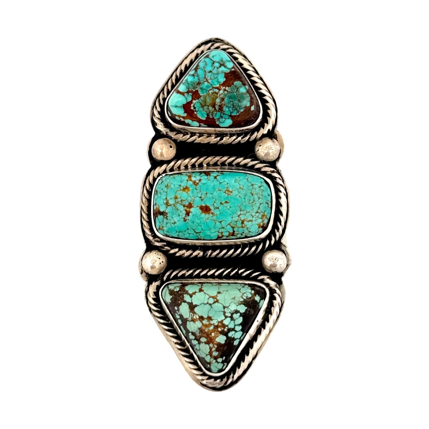 This vintage Navajo ring by Tommy Jackson, circa 2000s, is a striking example of traditional artistry paired with bold design. Handmade in sterling silver, the ring showcases three Royston Turquoise stones, each with a vibrant blue-green hue and rich brown matrix that adds natural depth and character. The stones are cut in geometric shapes; two triangular and one rectangular, arranged vertically to create a powerful elongated design. Each stone is framed in twisted rope bezels and accented with silver drops, adding dimension and balance to the composition. The oxidized background highlights the brilliance of the turquoise, while the wide silver band ensures durability and comfort. Known for his ability to blend contemporary elegance with Navajo tradition, Tommy Jackson’s craftsmanship is evident in the precision and harmony of this piece. Substantial in size, the ring makes a bold statement while celebrating the natural beauty of Royston Turquoise.