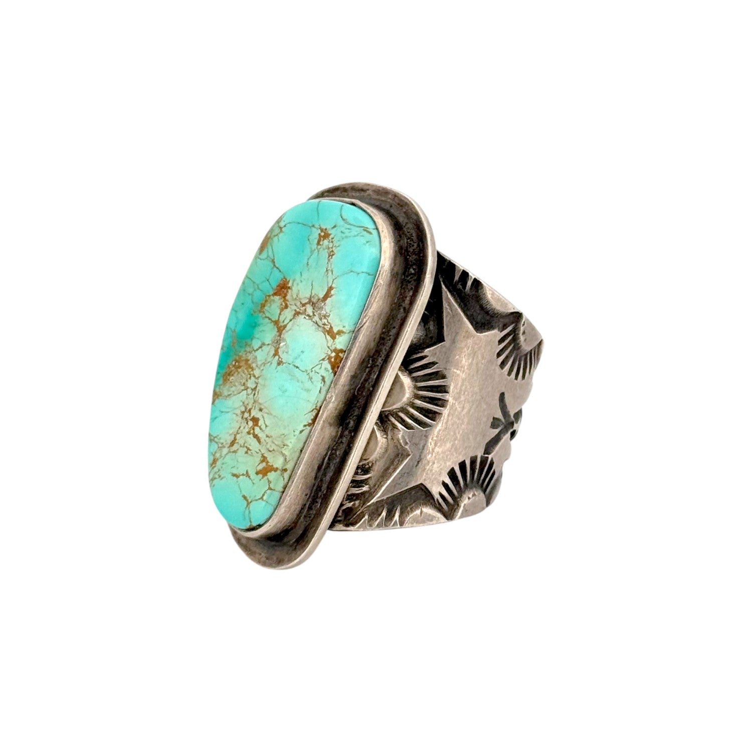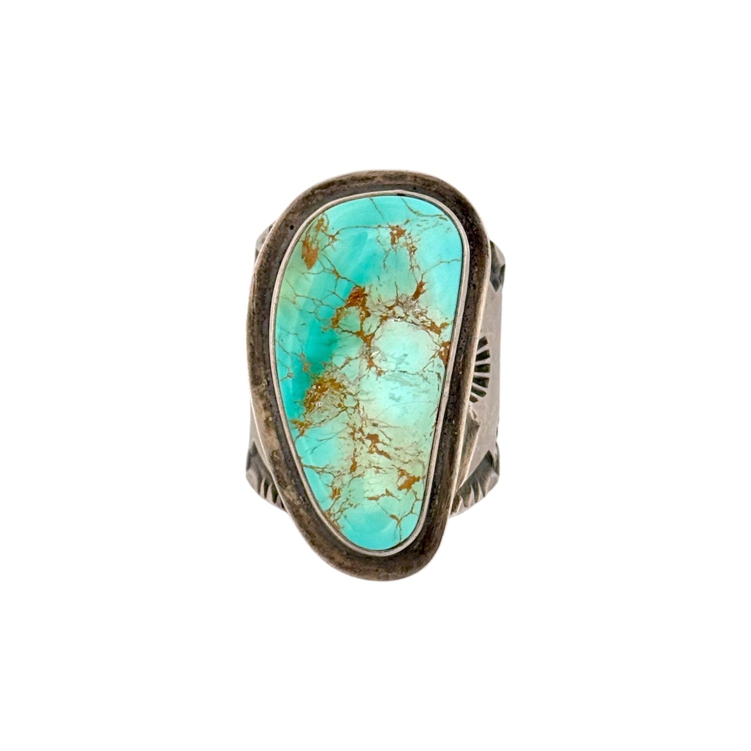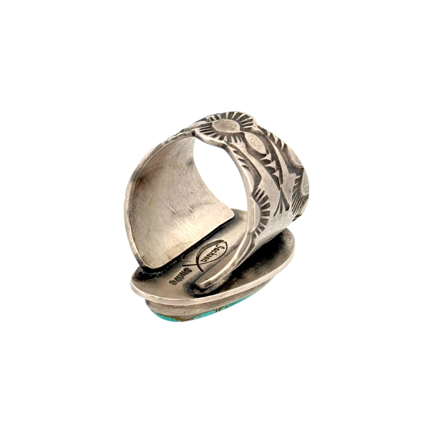 This vintage Navajo ring by Tommy Jackson, circa 2000s, is a bold and elegant showcase of Royston Turquoise. Handmade in sterling silver, the ring features a large freeform cabochon with vibrant blue-green hues accented by a striking golden-brown matrix, a hallmark of Royston stones. The turquoise is set in a smooth bezel that allows the natural beauty of the stone to shine as the focal point. The wide silver band is adorned with hand-stamped designs, adding texture and traditional Navajo character to the piece. Known for his ability to blend contemporary style with classic Navajo techniques, Tommy Jackson’s craftsmanship is evident in the balance of strength and refinement. Substantial in size and presence, this ring makes a powerful statement while maintaining timeless elegance. As a vintage work, it carries both collectible and cultural value, embodying the artistry of one of the Navajo Nation’s respected silversmiths.