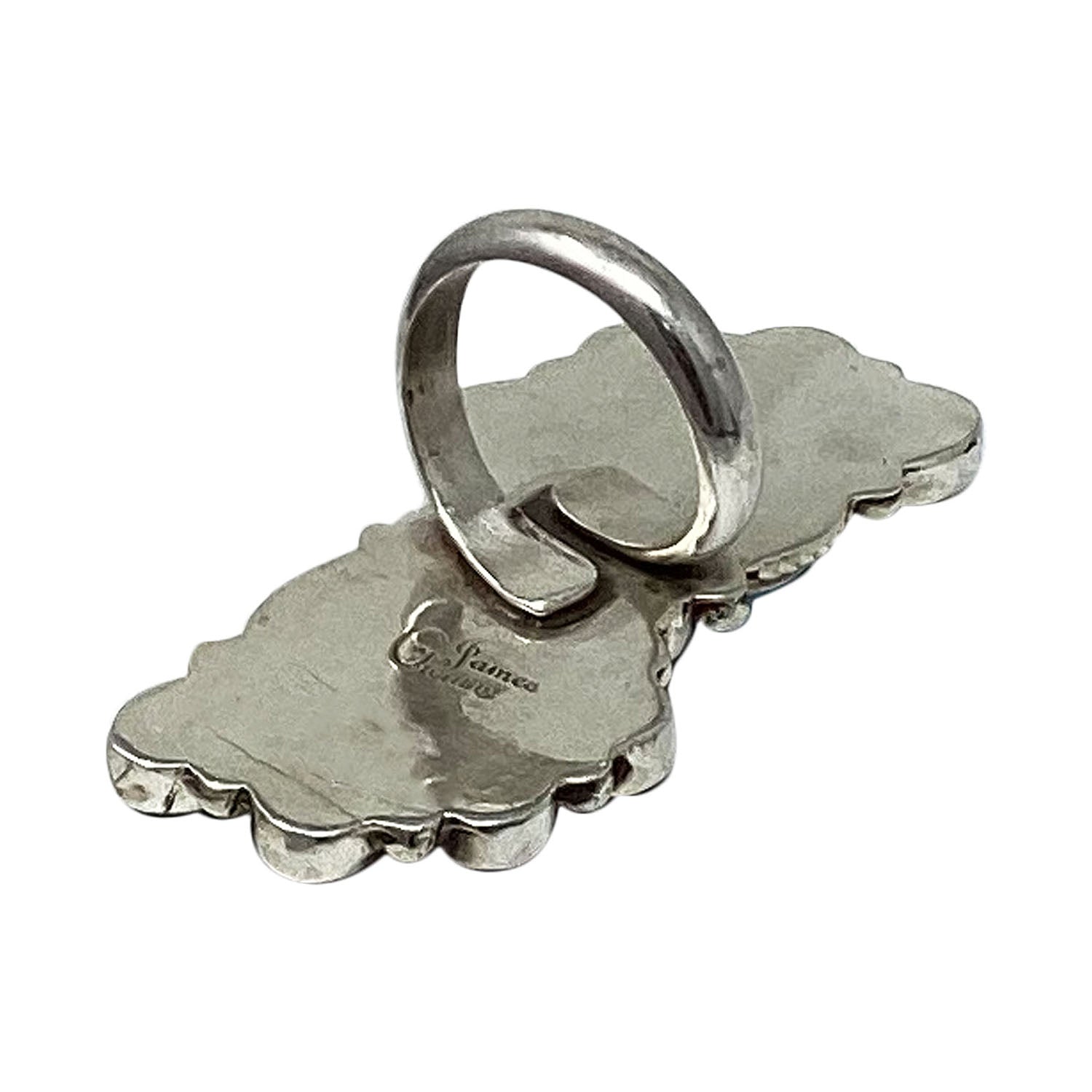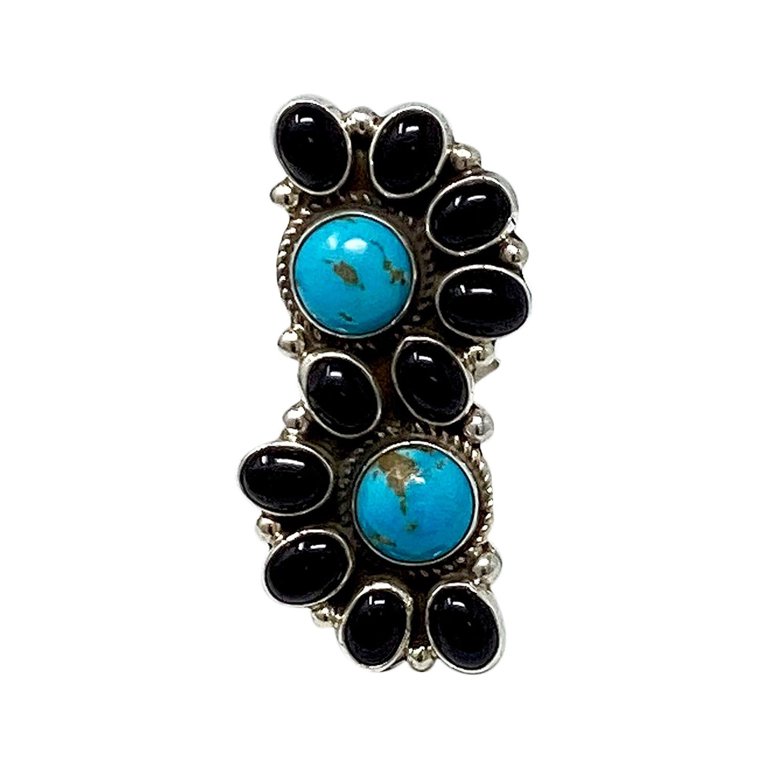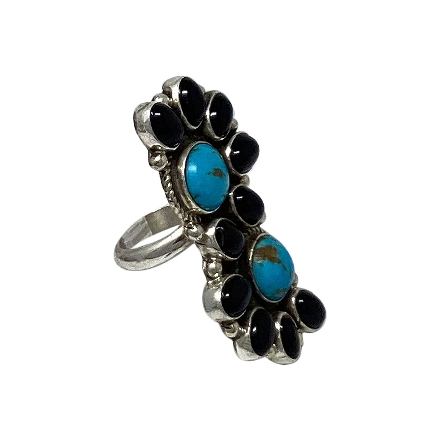 When you walk through the Trading Post you will be amazed by all of the beautiful turquoise that fills the showcases. This blue and black stone has always been the favorite of the Navajo people. Navajo silversmith Geraldine James has taken a collection of beautiful Kingman Turquoise and Onyx to make the stunning cluster ring with sterling silver. A mirror polish brings out the radiant beauty of the stones.