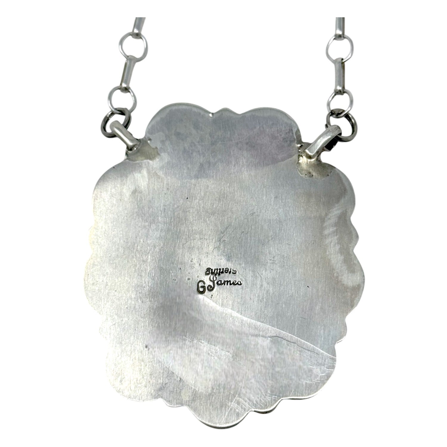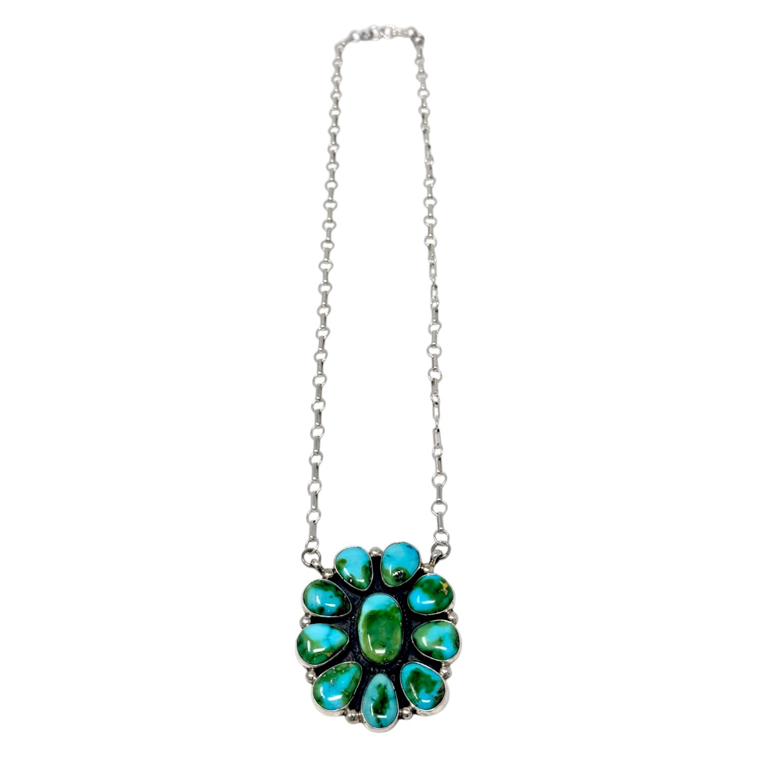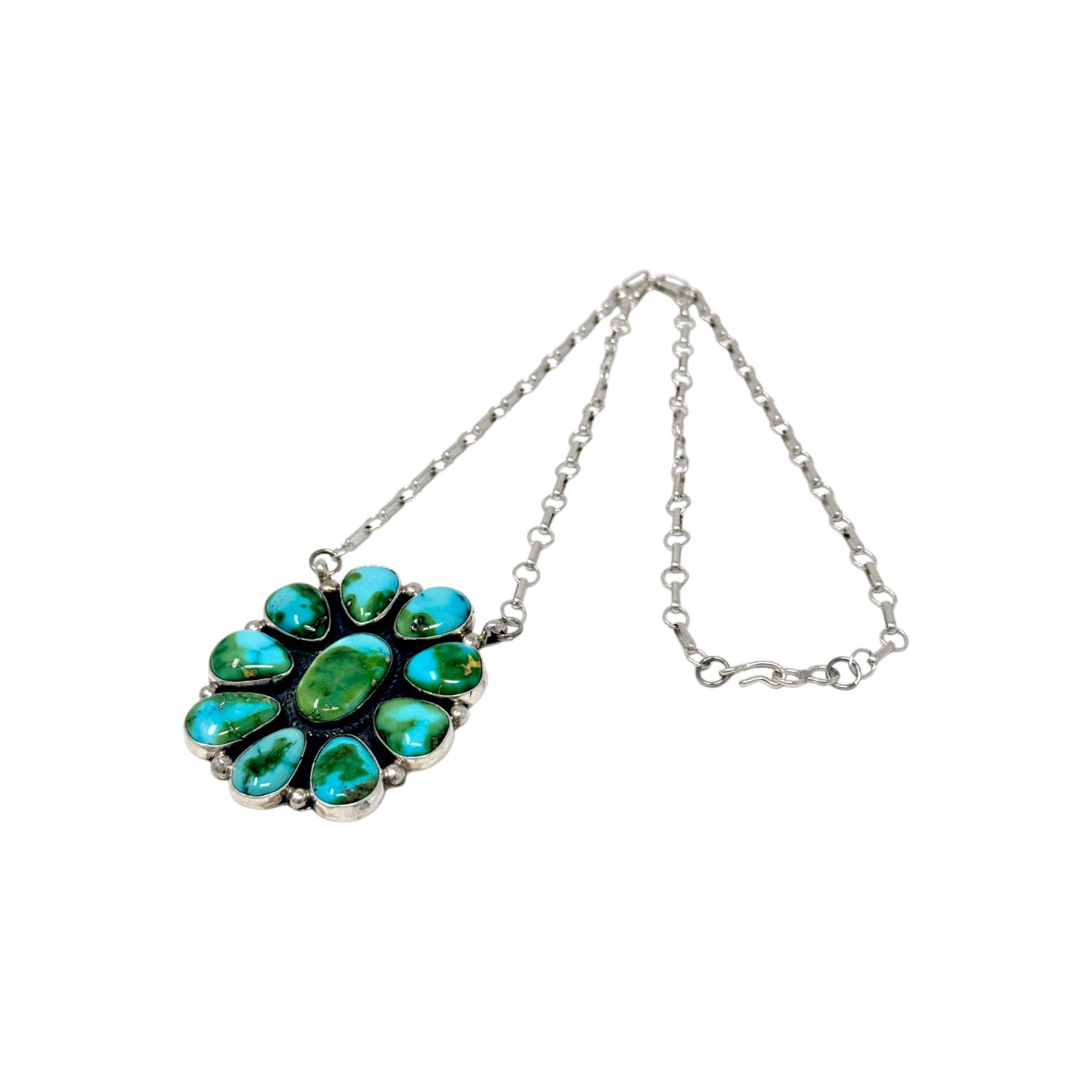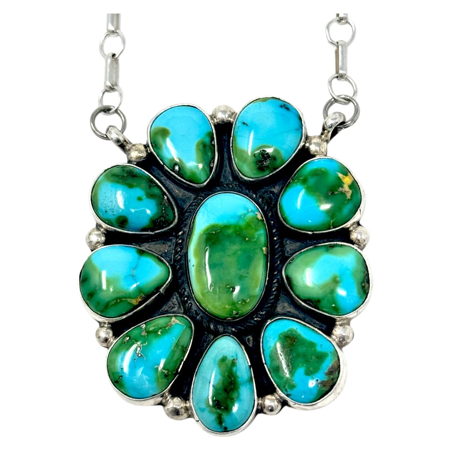 This Navajo handmade necklace by Geraldine James captures the radiant beauty of Sonoran Turquoise in a classic cluster design. The pendant features a central oval turquoise stone surrounded by teardrop cabochons, each displaying a range of vivid blue-green hues with natural matrix. Set in sterling silver bezels, the stones are arranged in perfect symmetry, creating a bold yet elegant centerpiece. The oxidized background enhances the brilliance of the turquoise, while the silverwork adds depth and contrast. A sterling silver chain completes the piece, providing both strength and balance to the design. The combination of vibrant turquoise and fine silversmithing reflects traditional Navajo artistry with timeless appeal. This necklace is versatile enough for everyday wear while bold enough to make a statement on special occasions.