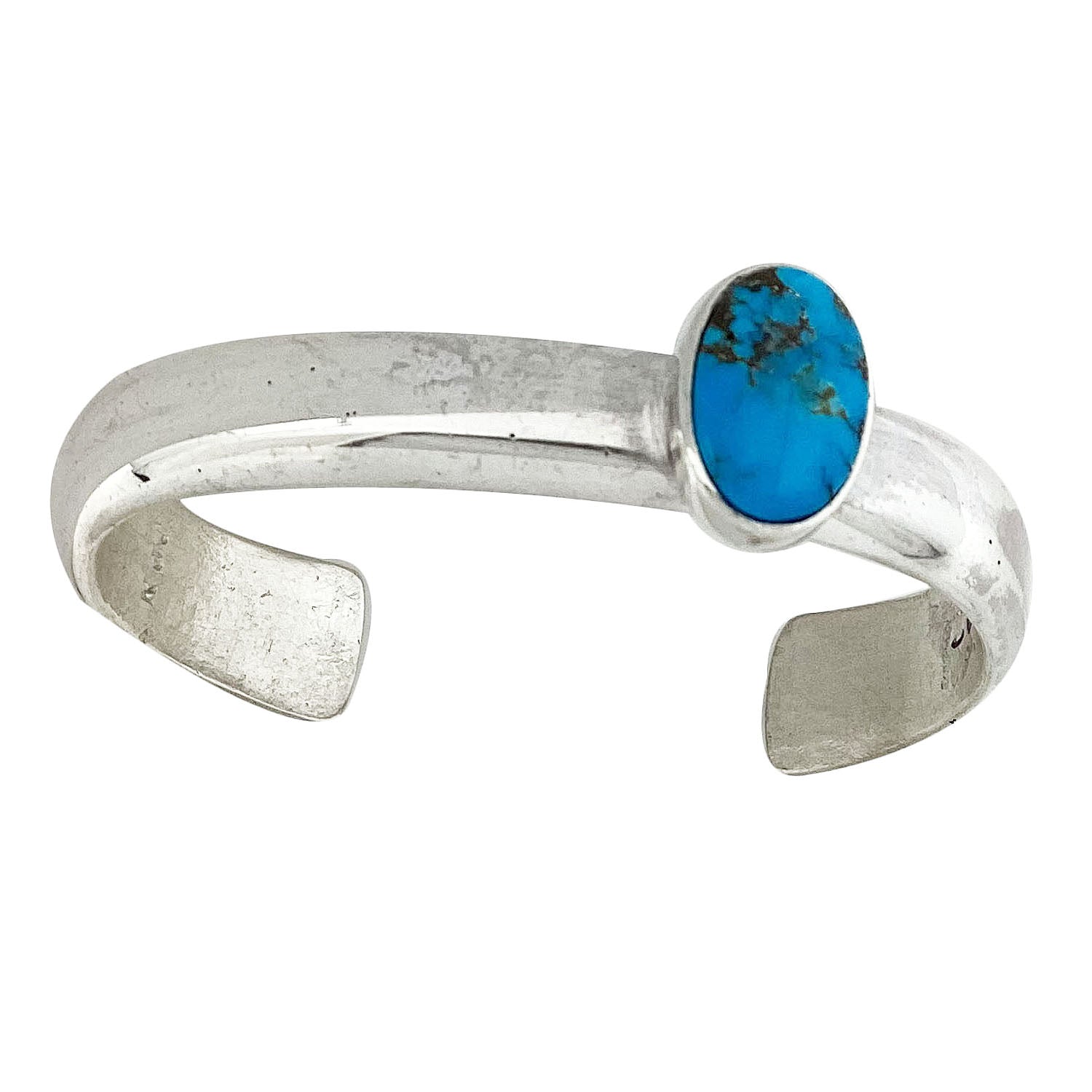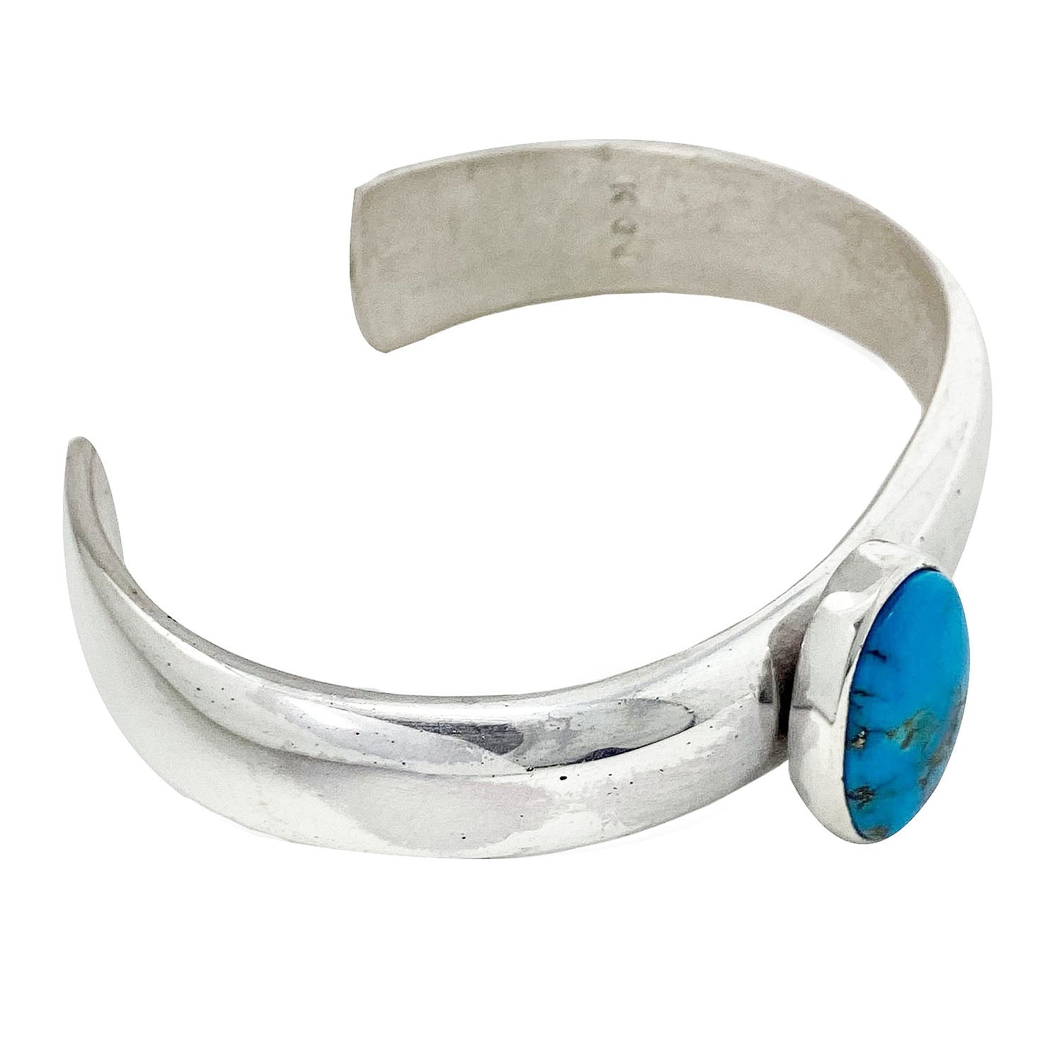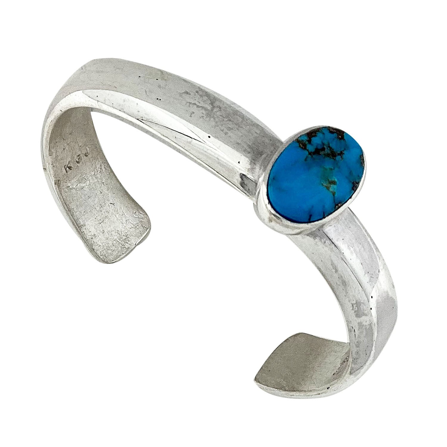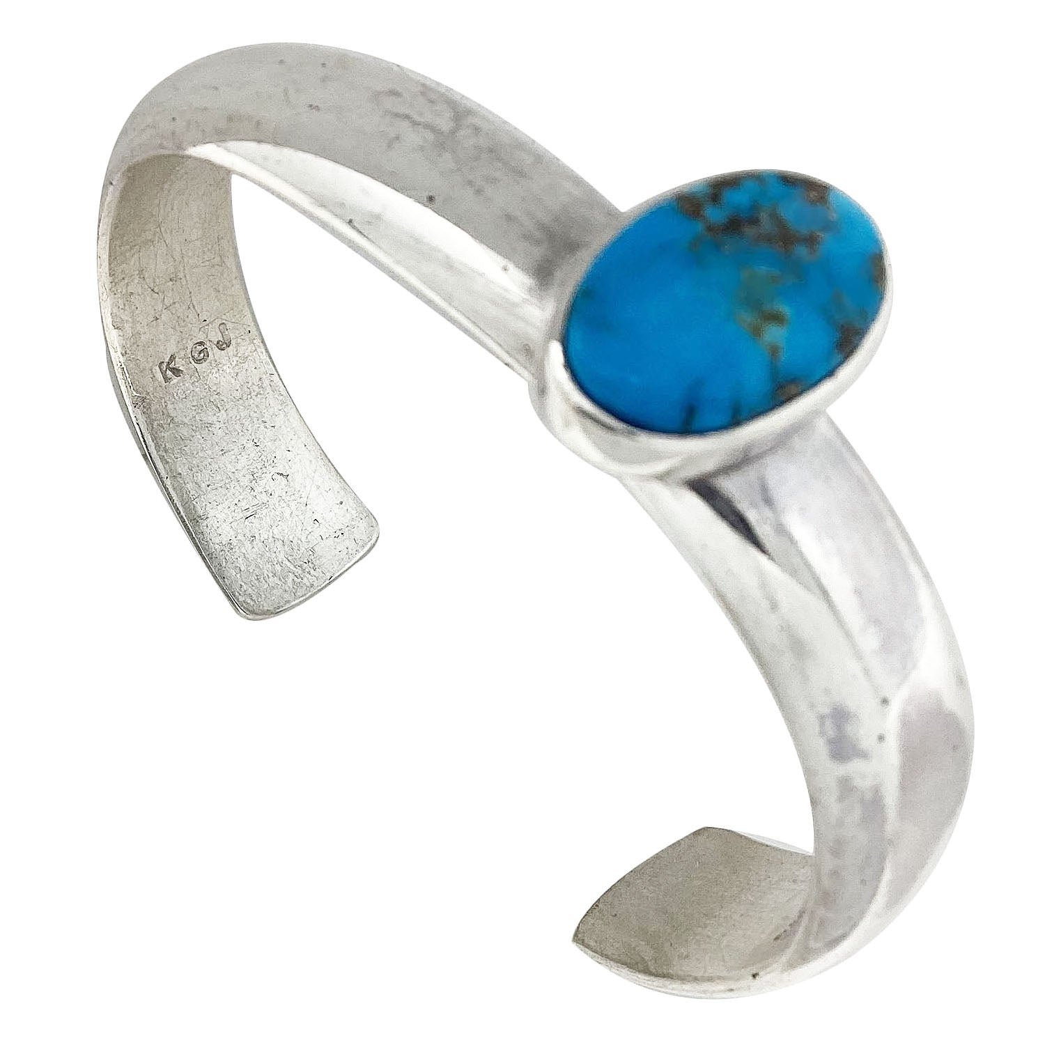 Navajo artist Kelsey Jimmie is always searching for that perfect piece of wearable art. Something that captures art along with simplicity and comfort. This easy to wear bracelet might be that creation. It begins with a piece of Kingman Turquoise that is a little wider than the carved bracelet and sits slightly off-center. This stone shows off a deep blue that has a distinct matrix. Kelsey carves the solid silver bracelet in the style of a half-round wire with a widened end. You will appreciate the narrow design that will allow you to wear this one daily. It was made with a great feel and perfect polish. We have a few of these creations online, different turquoise.