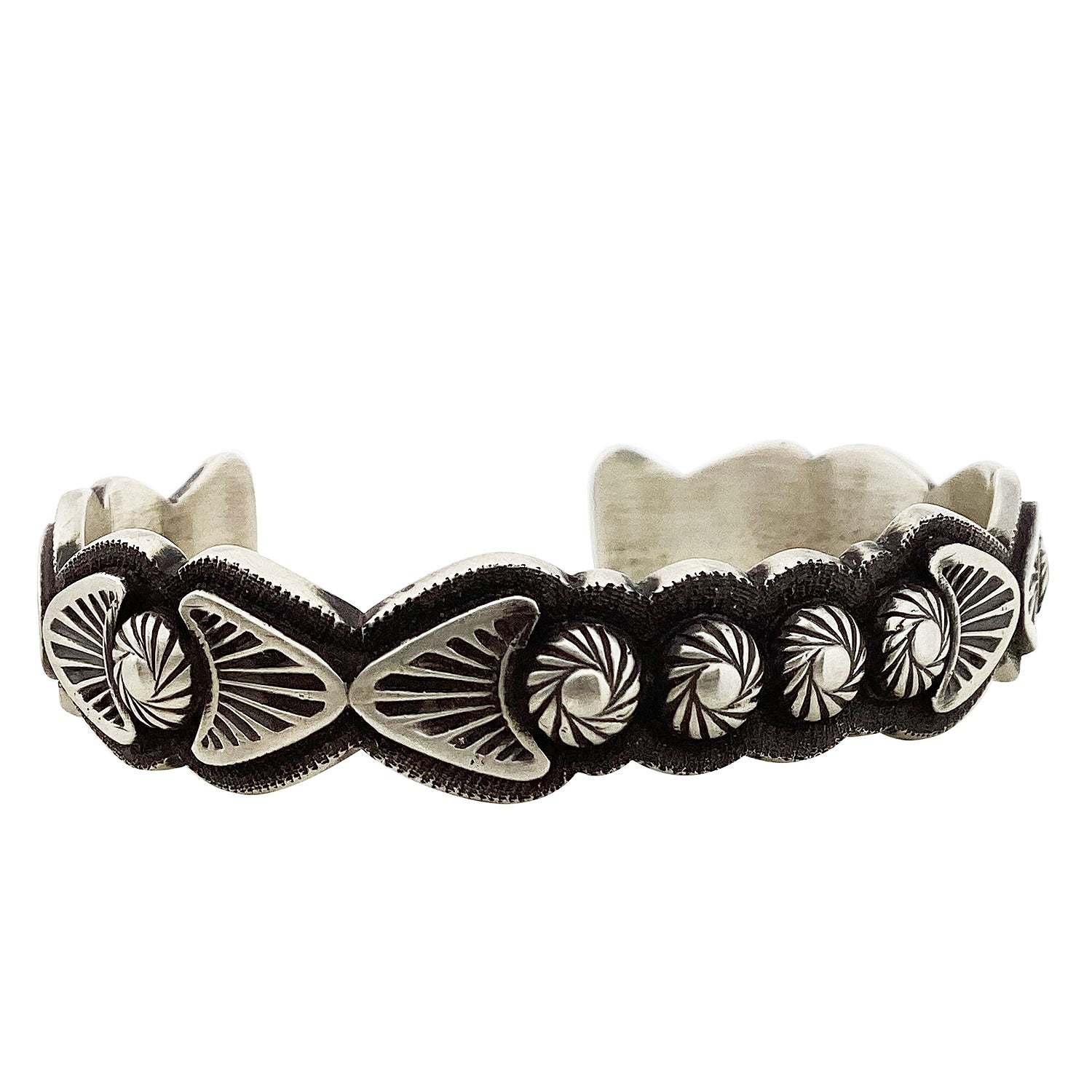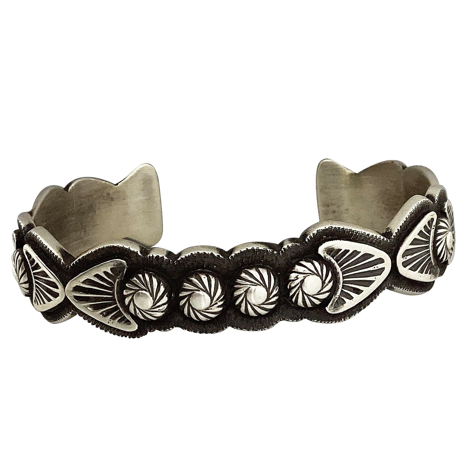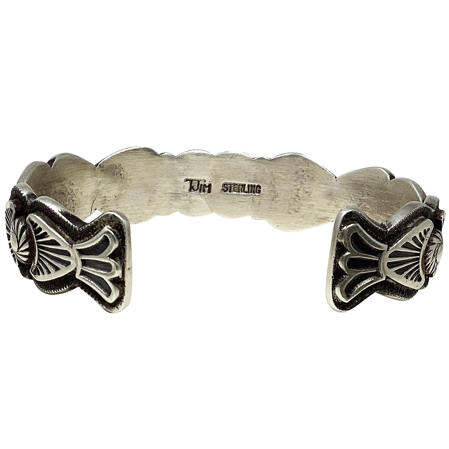 Navajo silversmith Thomas Jim is really into his craft. He has spent decades perfecting his techniques, and today his work is recognized by Native American art enthusiasts from around the world. Most collectors know him for his impressive sterling silver cluster creations. However, some of his small detail work is just as amazing. He has taken the time to work some narrow bracelets with lots of silver stamped cutouts, textured silver, and a rustic brushed finish that turns them into pieces you just want in your collection. We have several of these and will attempt to keep them up in the online Trading Post. Remember to check them all out and add a couple to your shopping cart.