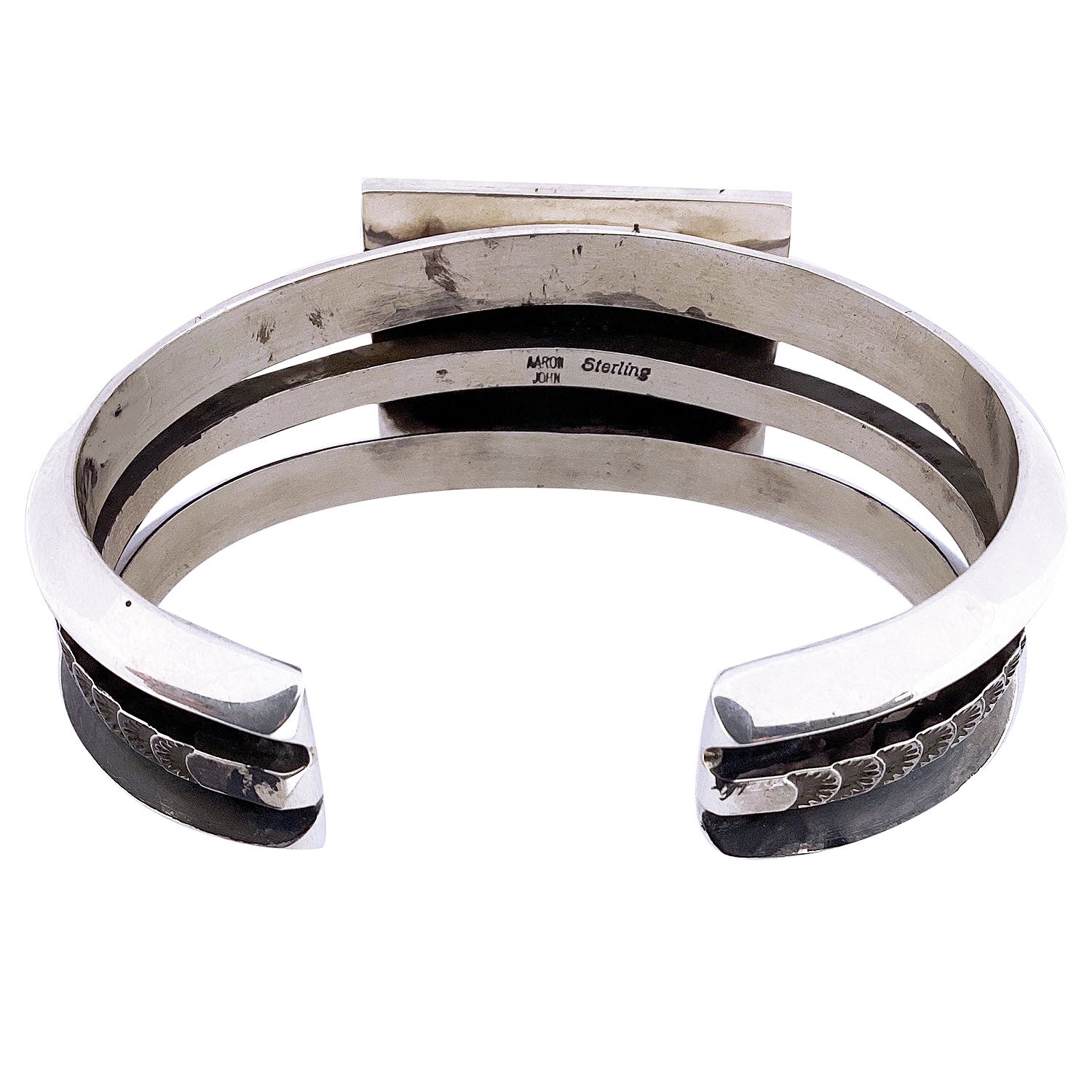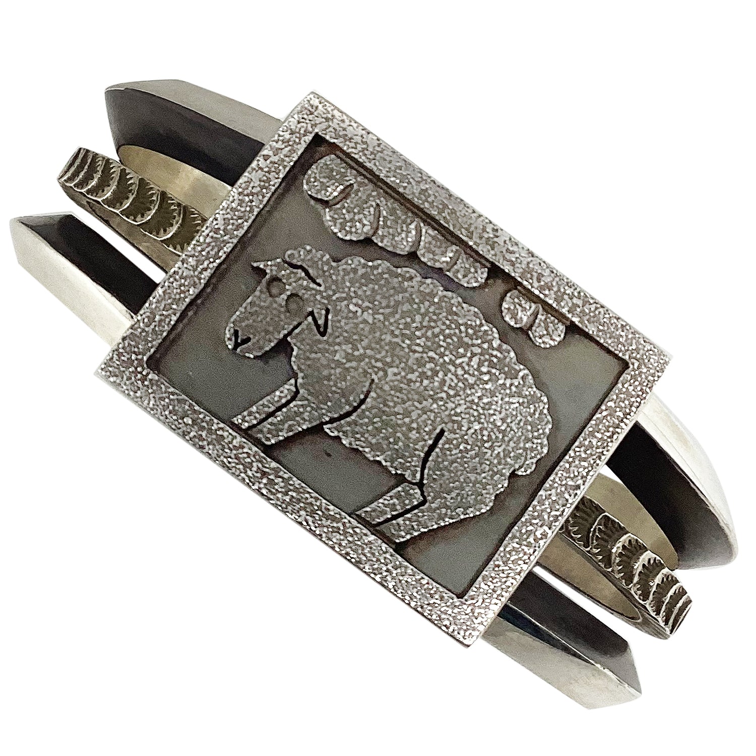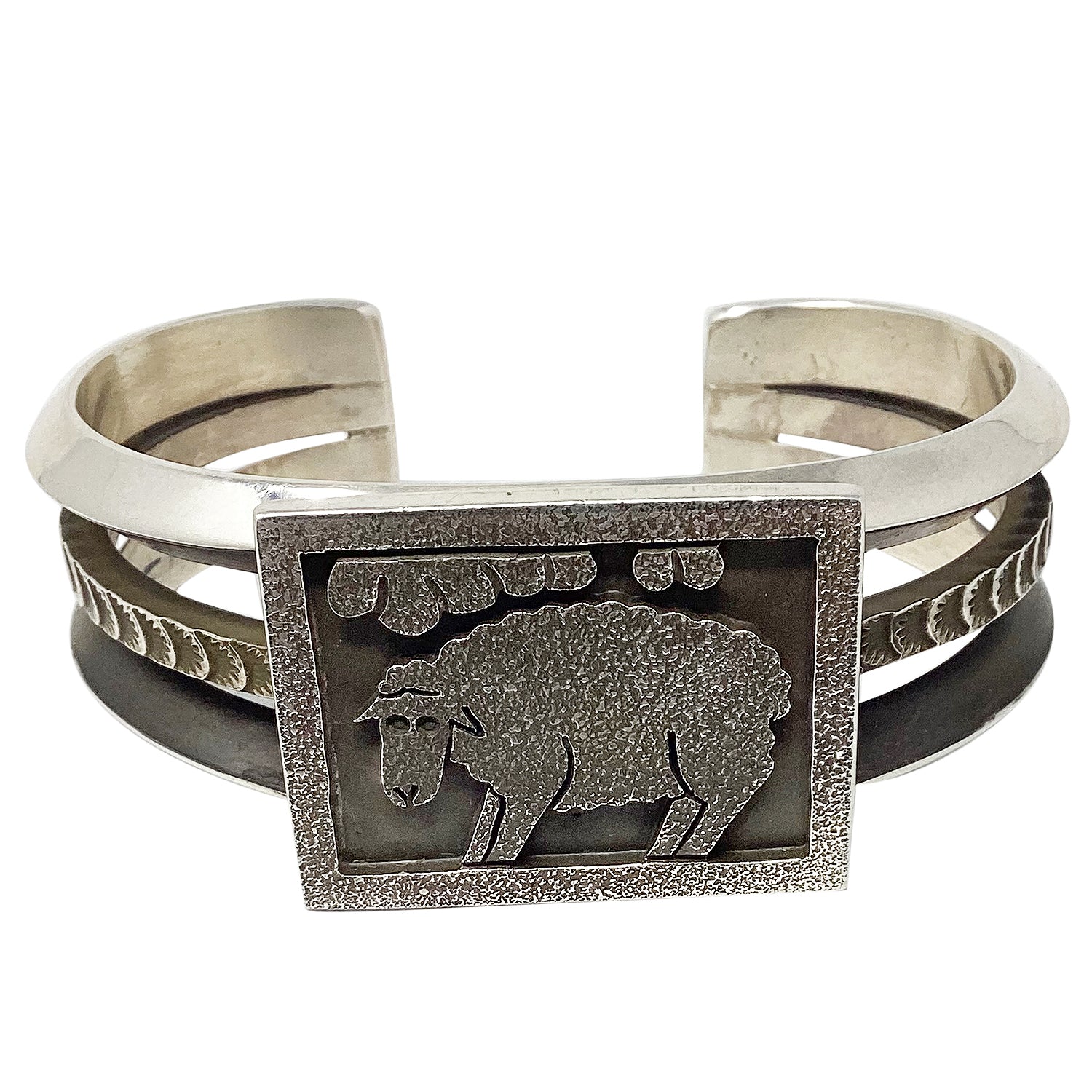 This is a beautiful bracelet that captures one of the Four Corner's most popular residents. Drive across this part of the country and you won't go long before you come across a flock of sheep, and many times you are lucky enough to see grandma tending to them. Navajo artist Aaron John celebrates the wooly sheep with this incredible cuff. He uses a big silver frame to bring out the detail of the character. Plus, the bracelet shank is a solid construction of three heavy wires that translate into a very comfortable fit. Enjoy this unique piece of handmade Native American art.