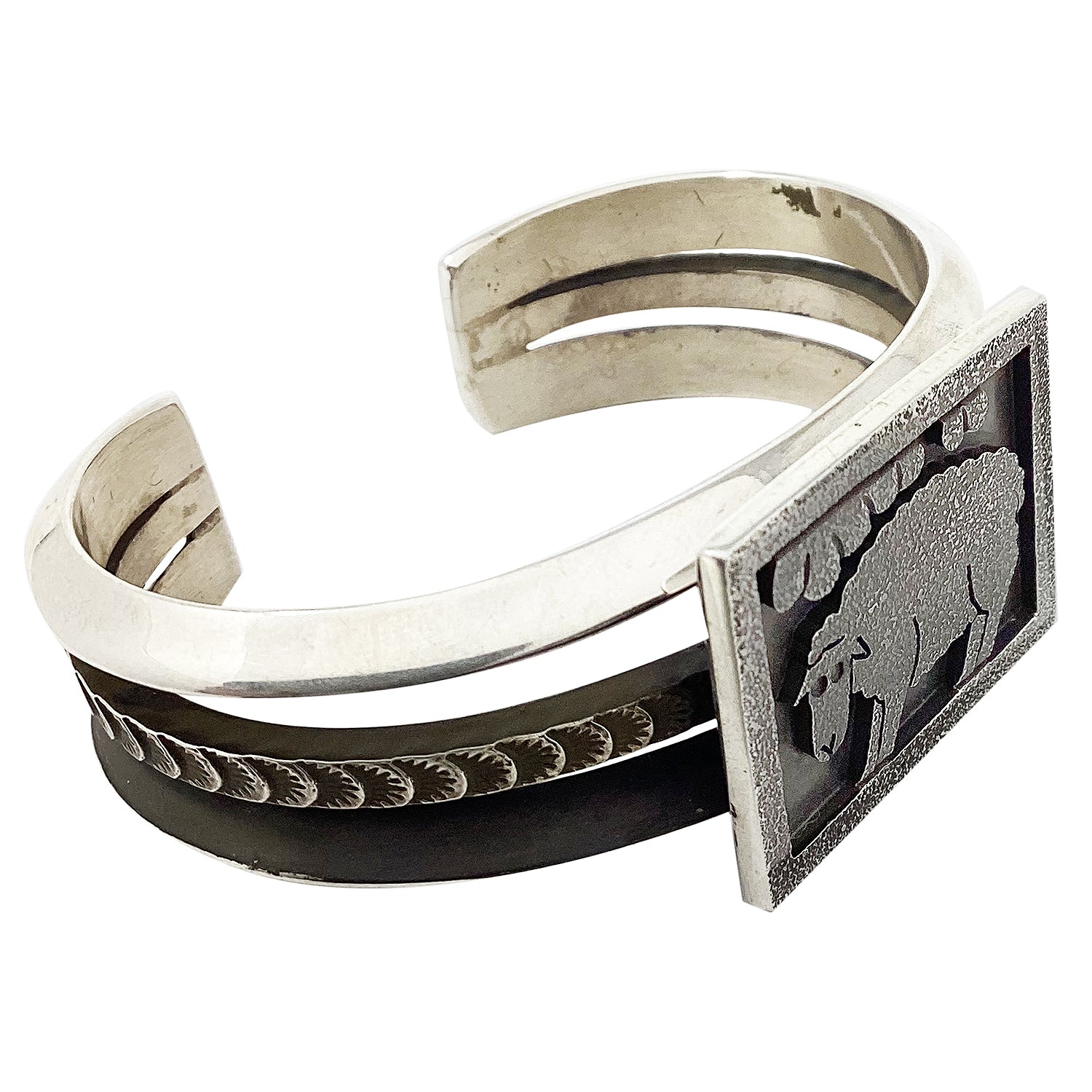 Aaron John, Bracelet, Sheep, Sterling Silver Overlay, Navajo Handmade, 6 1/2