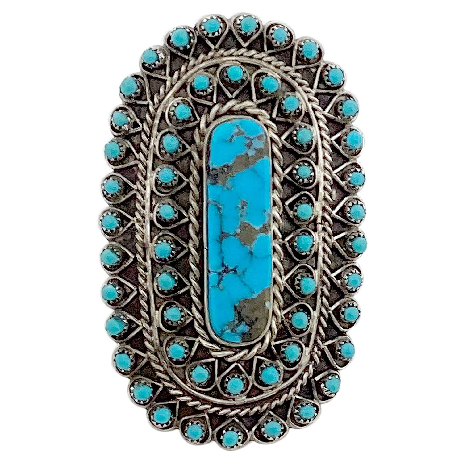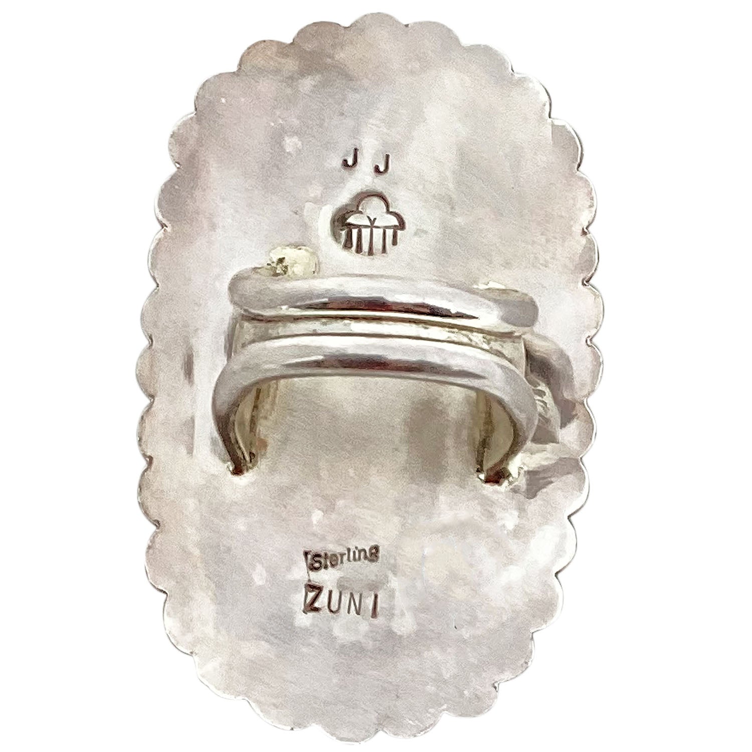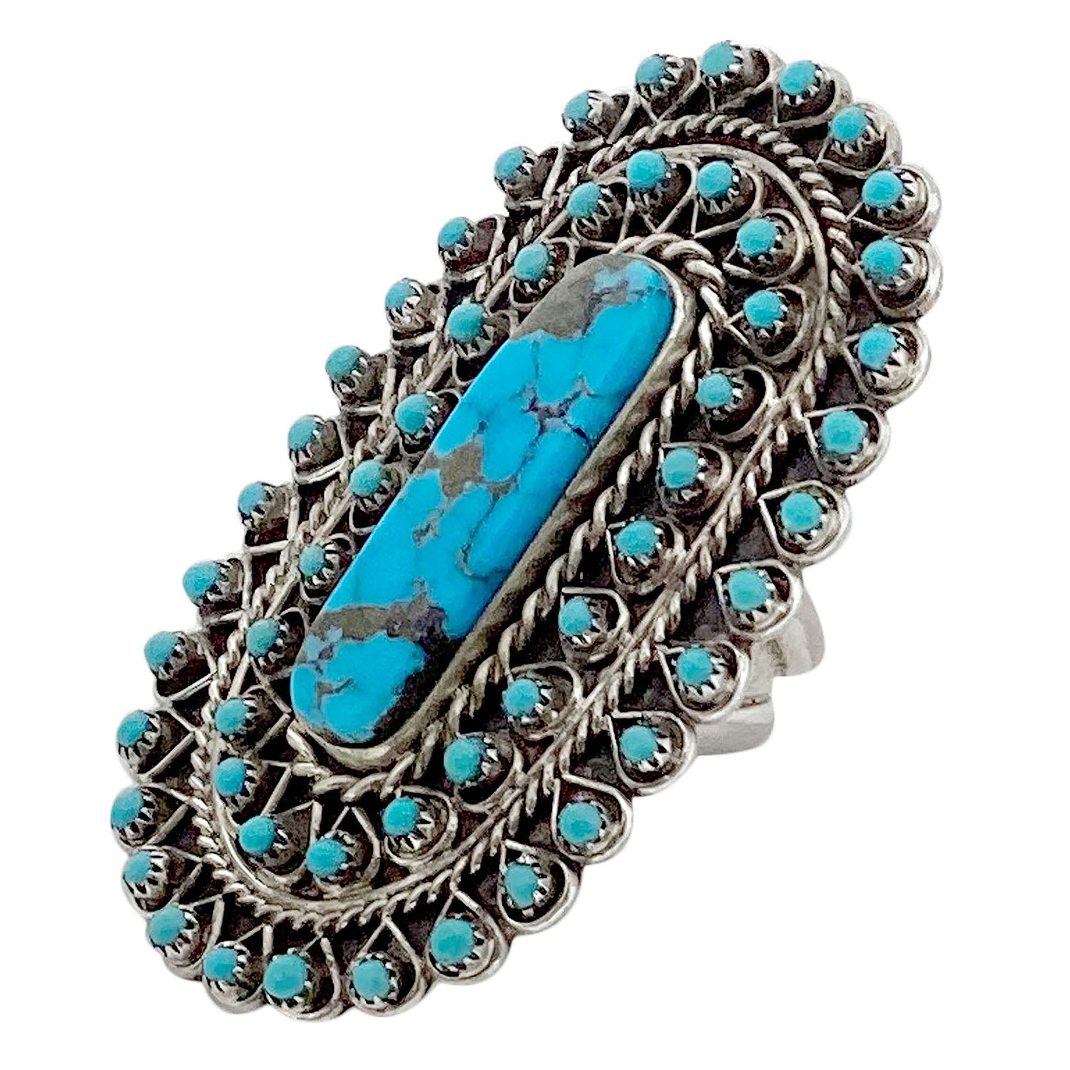 Zuni artist Jesse Johnson made this amazing cluster turquoise ring. This talented silversmith has combined two classic Zuni stone techniques along with creativity to make the fabulous piece. You will love the combination stone setting and petit point stone settings. Jesse uses sky blue pieces of Kingman and Sleeping Beauty Turquoise. Just as impressive as the stone work is the silver work. You are going to love wearing this big cluster ring.