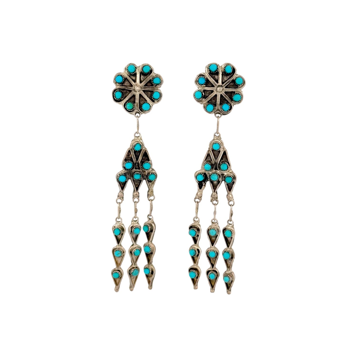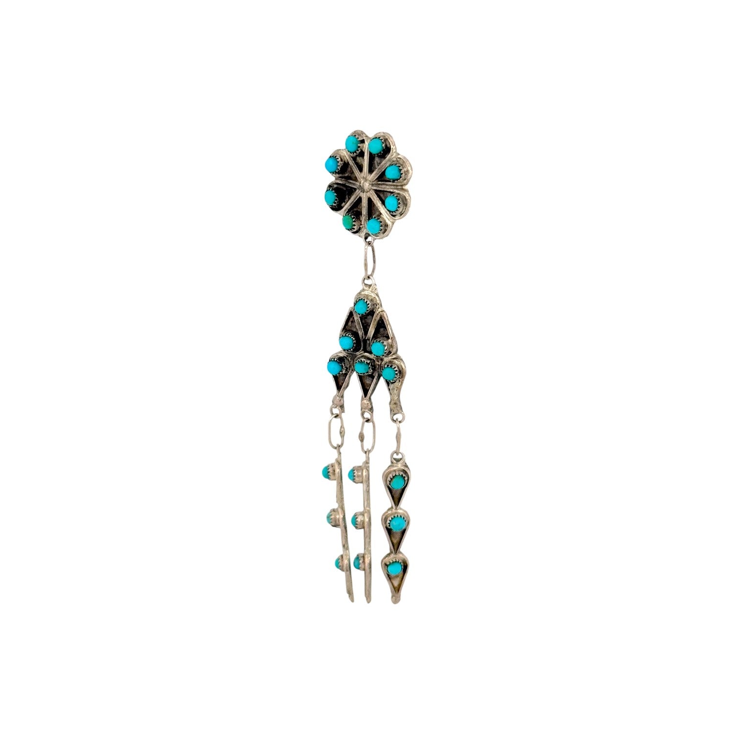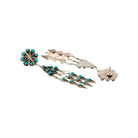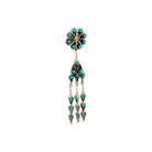 Waylon Johnson’s Navajo handmade earrings feature vibrant Kingman turquoise set in sterling silver with striking, traditional detail. The design begins with a classic round cluster stud, where bright turquoise stones radiate in a balanced floral pattern. Below, a tiered drop showcases additional turquoise accents arranged in symmetrical, fan-like segments. Oxidized sterling silver enhances the depth of the setting, highlighting the intricate handwork and dimensional design. Elegant and full of movement, these earrings beautifully reflect the heritage and enduring artistry of Navajo jewelry craftsmanship.