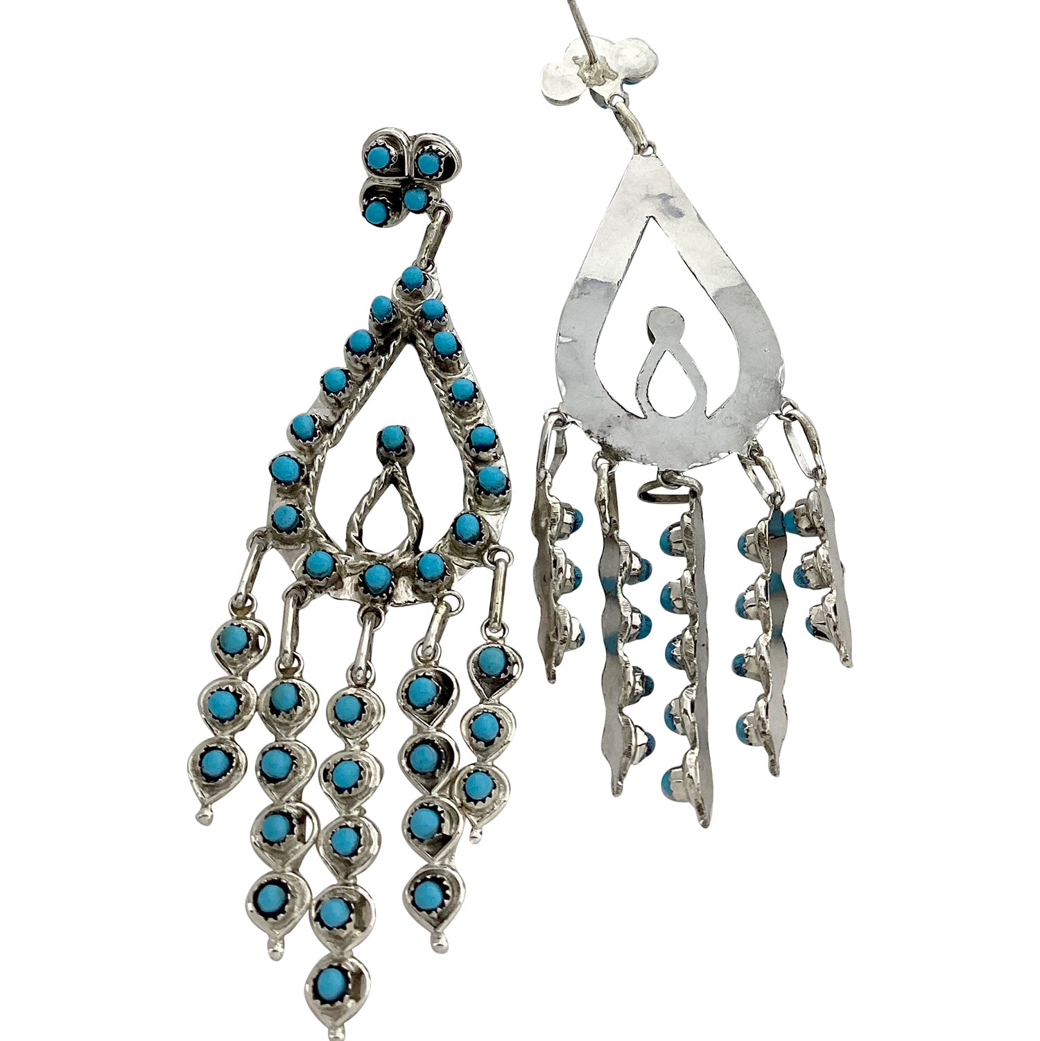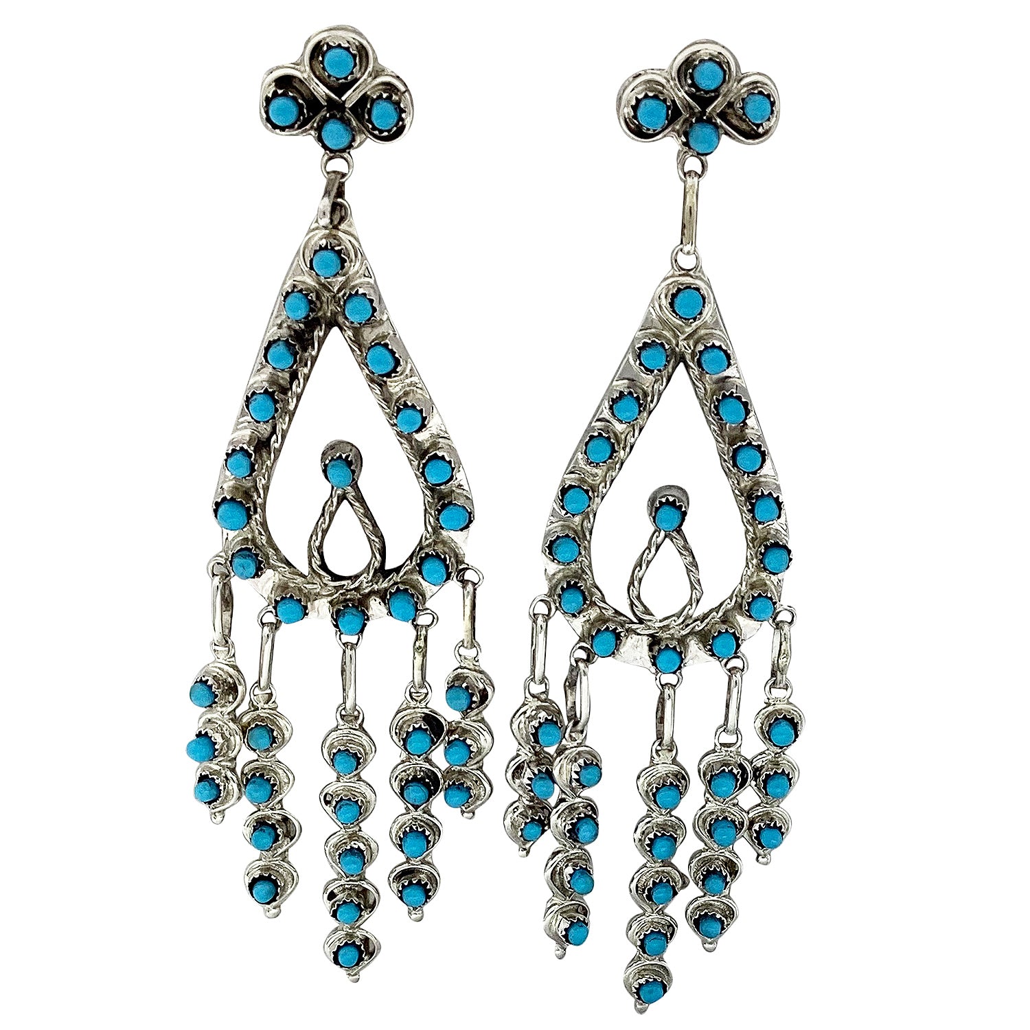 Petit point turquoise is a Zuni tradition. This Northern New Mexico Pueblo has been shaping stones for centuries. Zuni artist Wayne Johnson Jr. takes his lapidary skills and turns them into a cluster dangle earring. Small cuts of Sleeping Beauty Turquoise fill the fascinating design. Wayne has used wires to wrap around the stones and really make the stones stand out. Lovely dangles finish the earring.