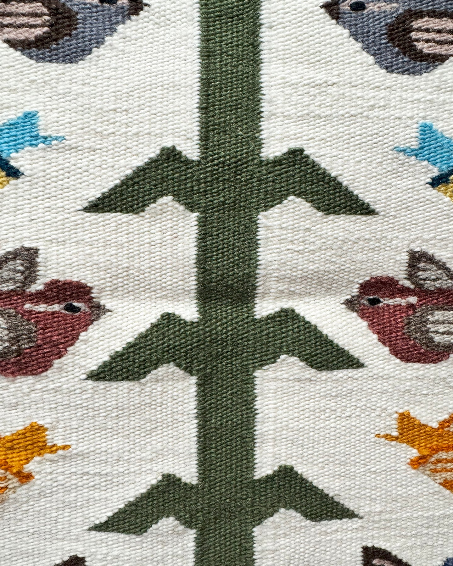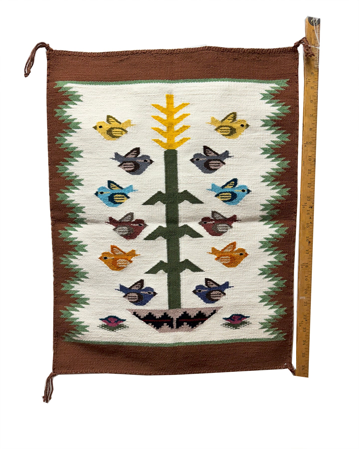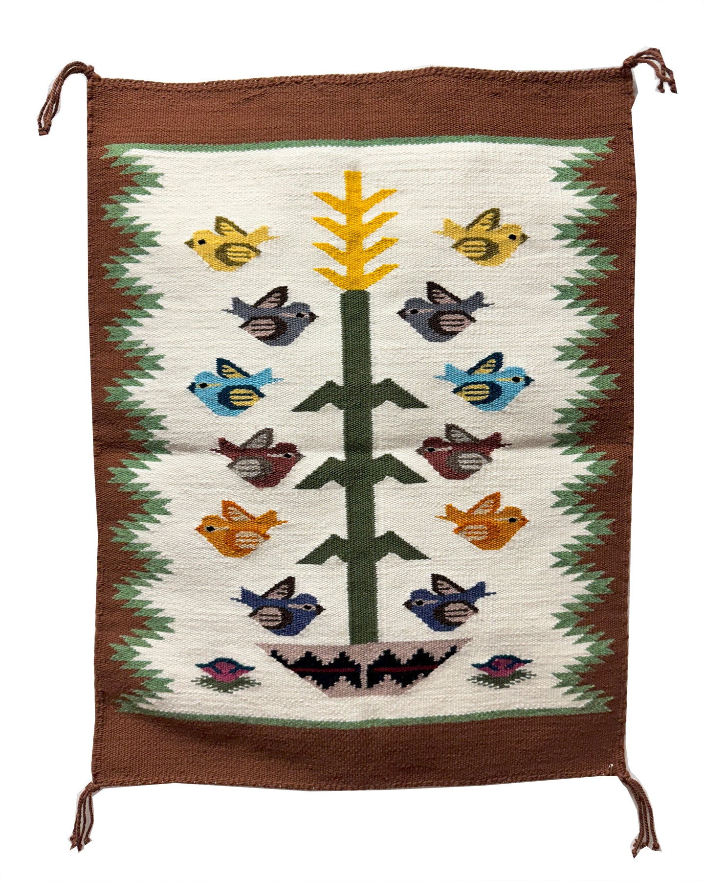 The Navajo Tree of Life is a colorful rug style usually depicting a central corn plant emerging from a Navajo Wedding basket, with birds, feathers and rainbow bars enhancing the design. For the Navajo, corn is sacred, corn is life. “Walking under the corn leaf is the Beauty Way,” a Navajo elder said. Thus, everything that is good, life affirming and positive is embodied in a Tree of Life rug.