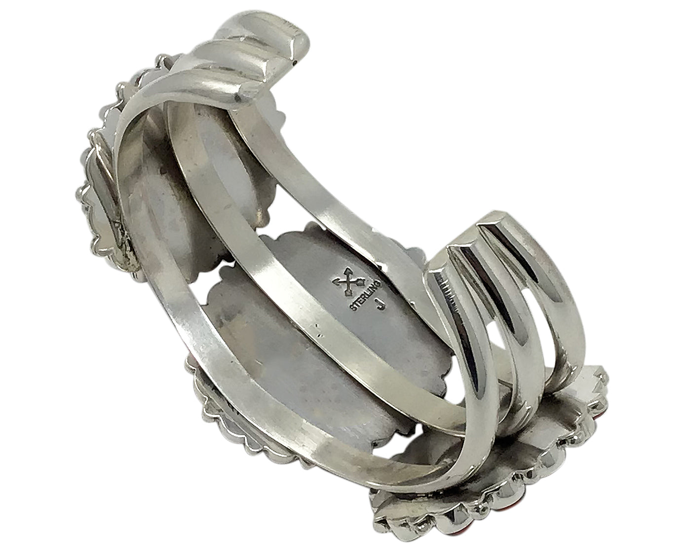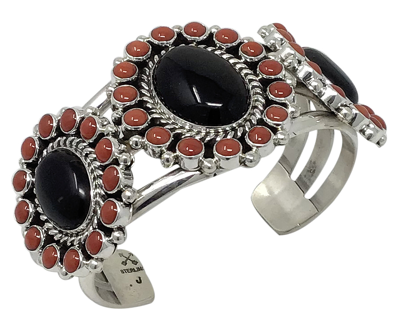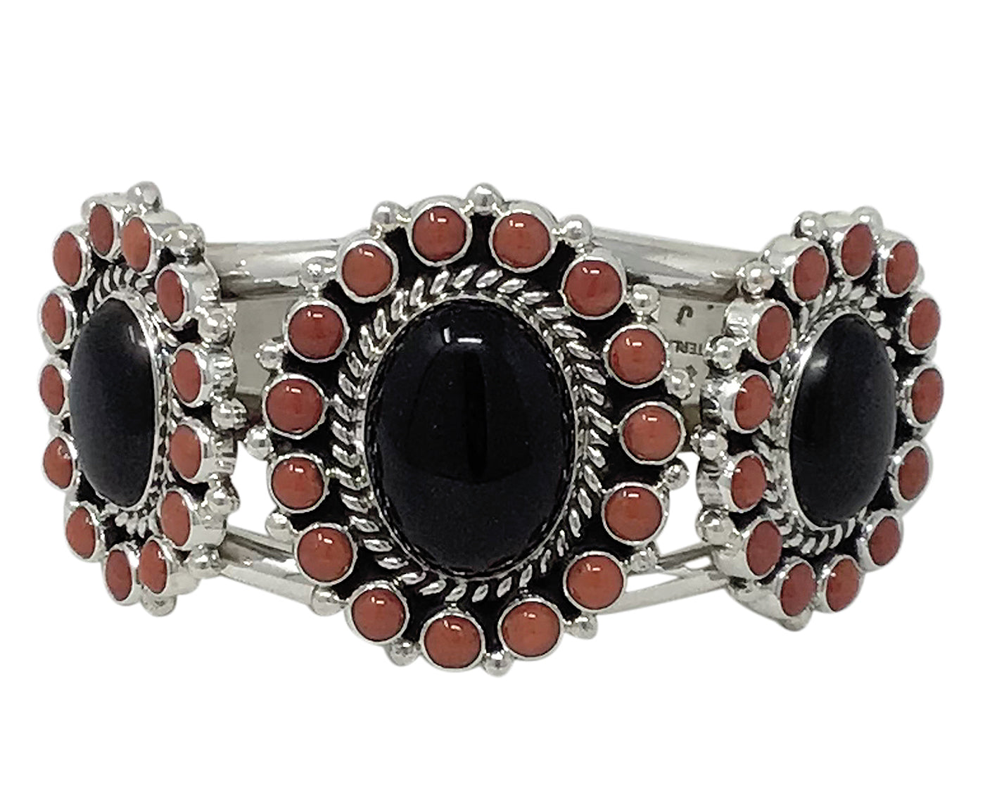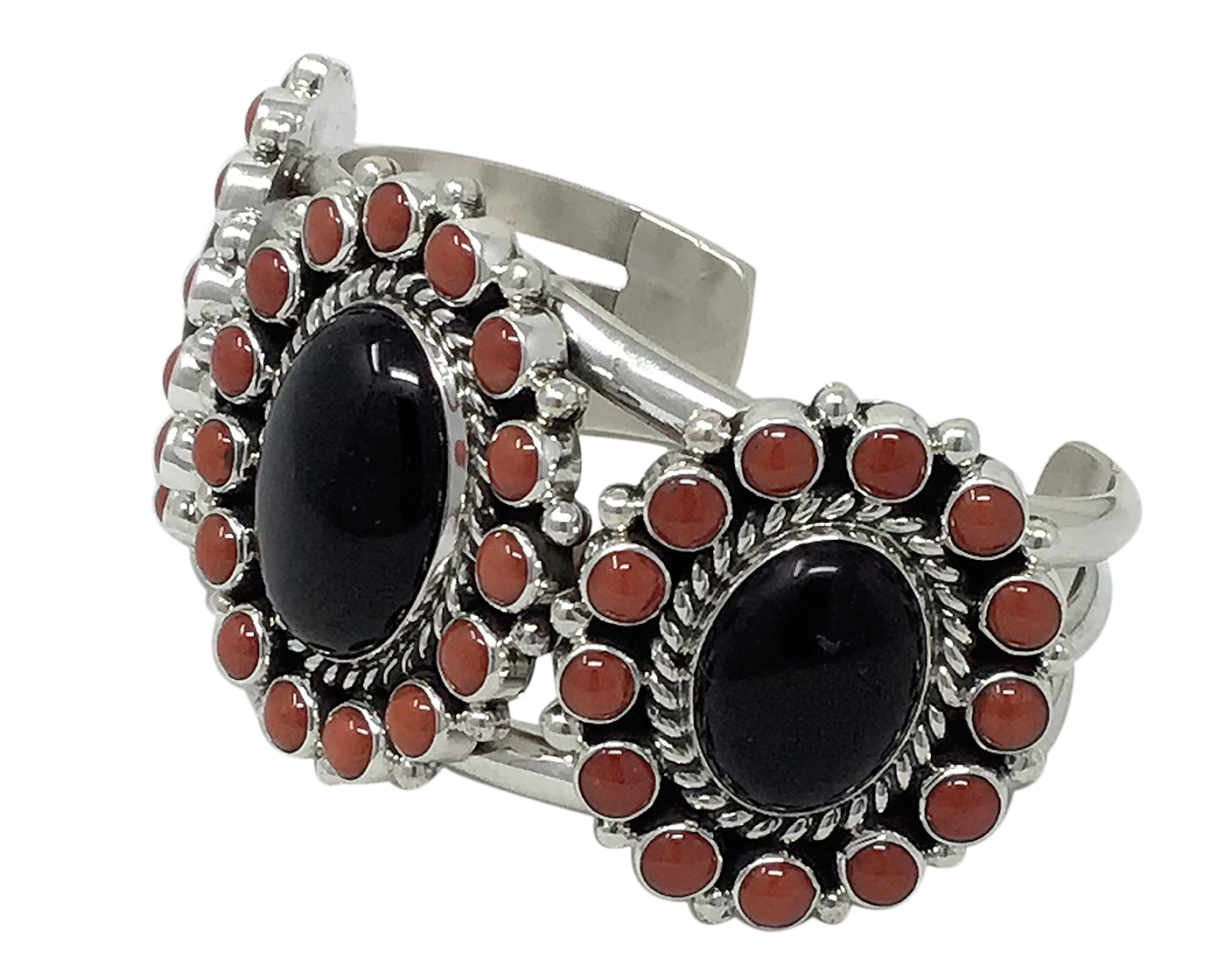 You are going to be blown away by the size and richness of the stones found in this cluster cuff. A combination of black onyx and dark red Mediterranean Coral stones look perfect together. All forty-four vibrant stones radiate off the sterling silver creation. Twisted wire and silver drops dress up the cluster design and give you a classic look. Finished with a comfortable three-wire bracelet shank that will have this magnificent piece on your wrist all day. Navajo silversmiths Melvin and Tiffany Jones made this oversized colorful piece. This husband and wife team continues a tradition started by Kenneth Jones.