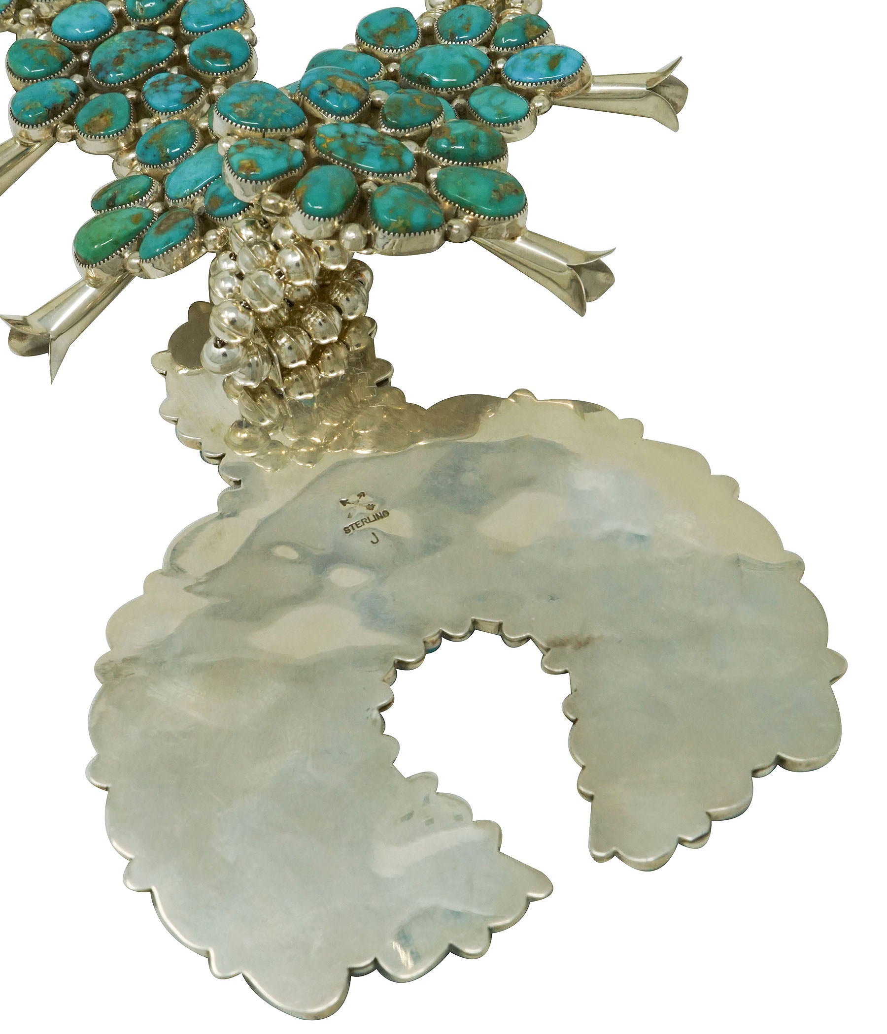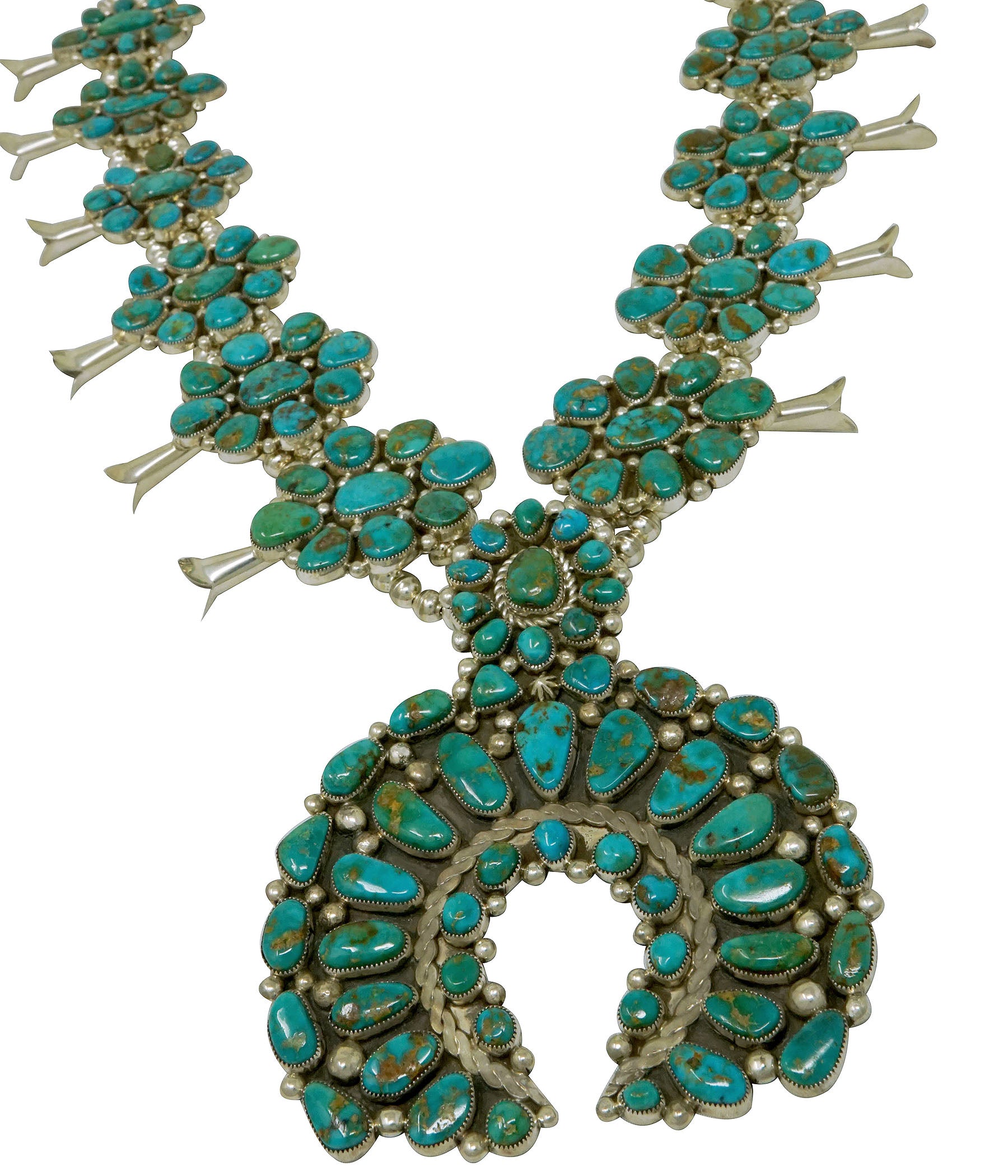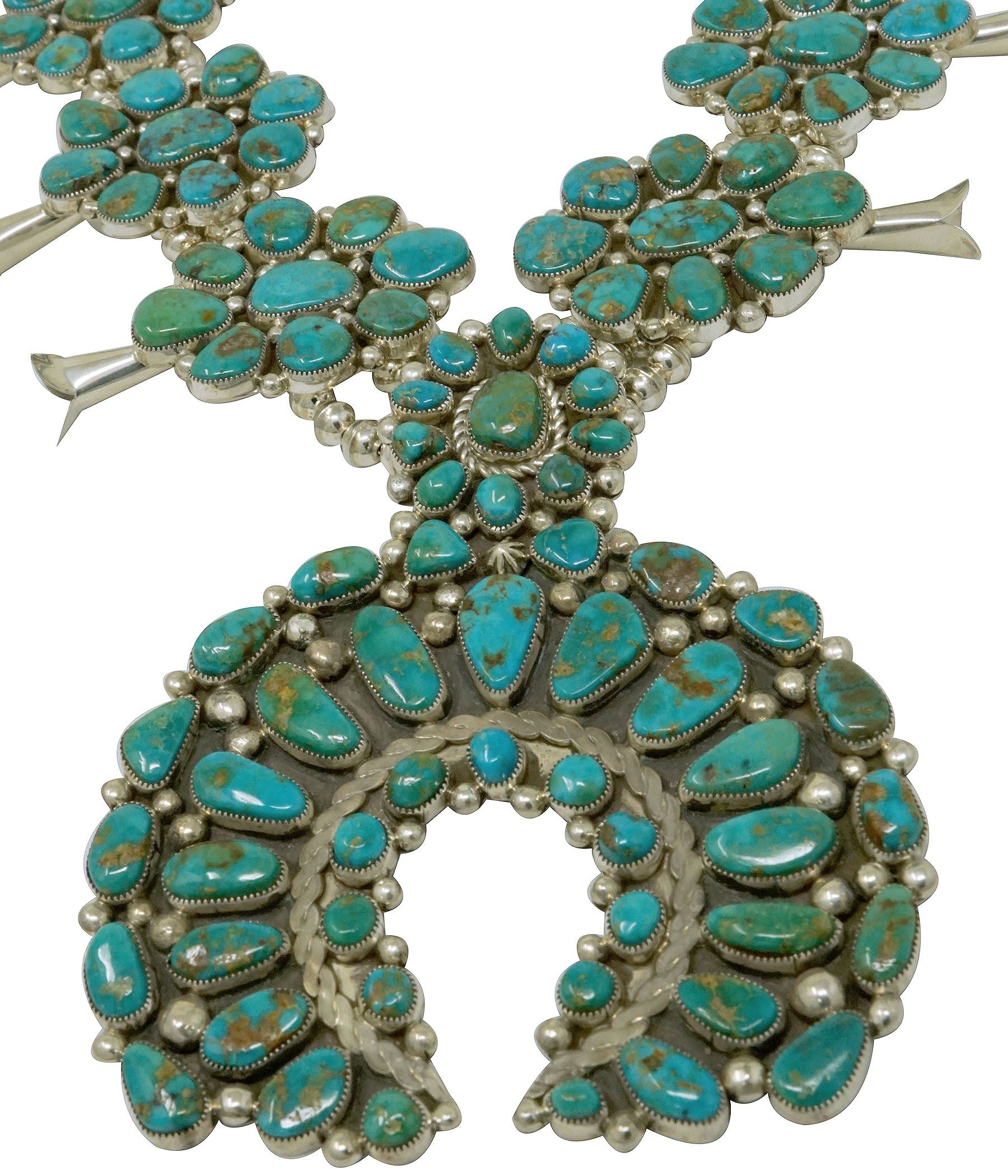 Navajo artists Melvin & Tiffany Jones have finally brought the Trading Post this incredible turquoise squash blossom necklace. The impressive piece consists of 12 blossoms and a large cluster naja. Melvin & Tiffany carry on a tradition of jewelry making they learned from Kevin Jones. You are going to be blown away by the amount of Blue Gem Turquoise on this piece. The necklace is filled with almost 160 pieces of beautiful green and blue tinted legendary Blue Gem Turquoise. All of the stones are dressed up with silver drops and a dark unpolished background. Spectacular pieces like this are hard to find, and this one would be a great addition to your collection.