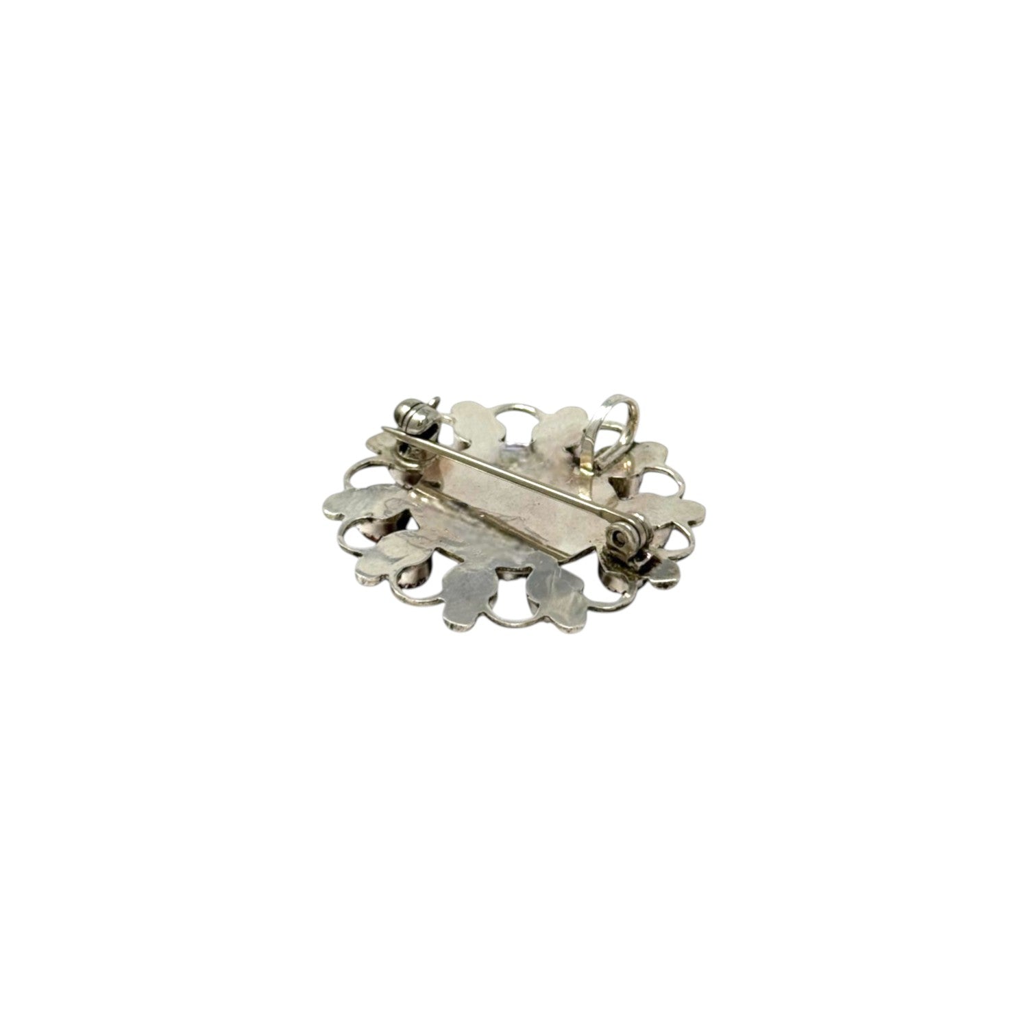 This radiant pin and pendant by Zuni artist Yvette Kaamasee are a celebration of traditional elegance and timeless craftsmanship. Handcrafted in sterling silver, the piece features a floral-inspired design set with vivid coral cabochons arranged in concentric circles. Each coral stone is carefully hand-cut and bezel-set, framed by delicate silver loops and accented with polished silver drops that add movement and sparkle. The fiery red of the coral symbolizes vitality and protection, deeply rooted in Zuni tradition. Its dual functionality as both a pin and pendant offer versatile wear, making it perfect for both everyday adornment and special occasions.