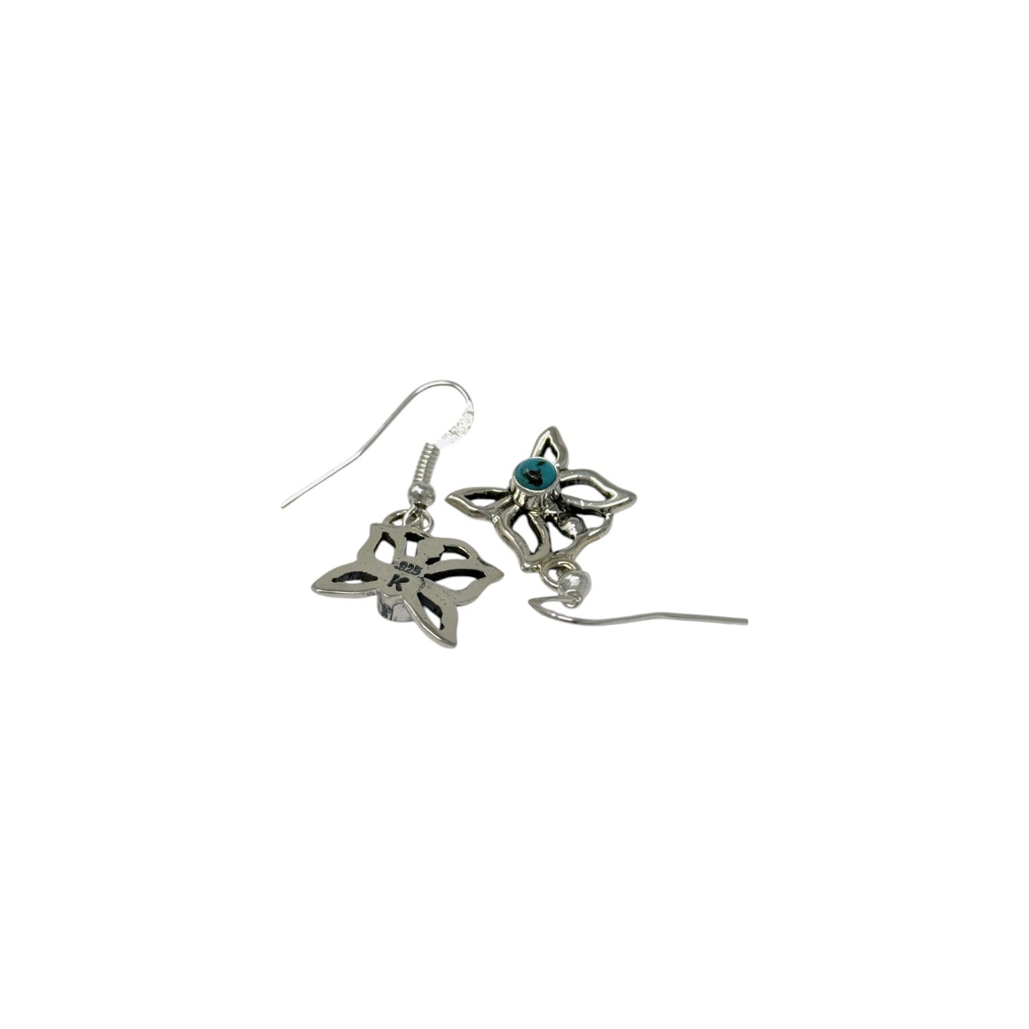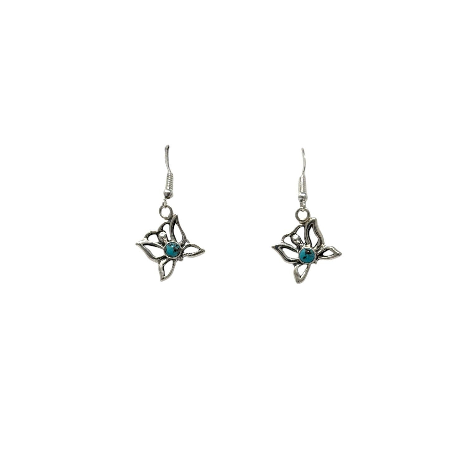 Delicately handcrafted by Navajo artist Edith Kee, these sterling silver earrings feature a graceful floral motif centered around vivid Kingman Turquoise cabochons. The openwork petals create an airy, feminine silhouette, allowing the natural beauty of the turquoise to stand out in a design that is both elegant and lightweight. The turquoise, sourced from Arizona’s renowned Kingman mine, offers a vibrant blue hue that symbolizes protection and tranquility in Native tradition. These earrings reflect Edith Kee’s talent for combining traditional materials with soft, contemporary forms.