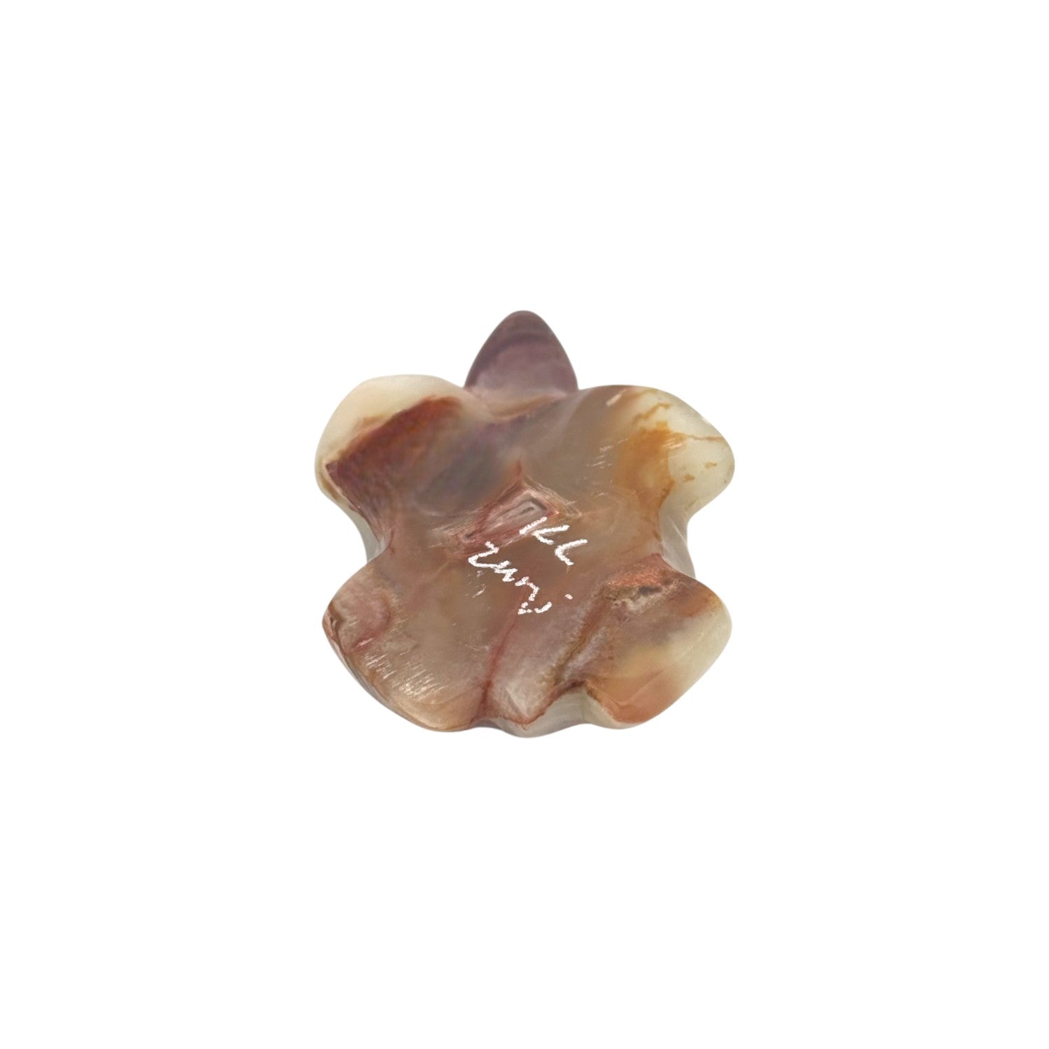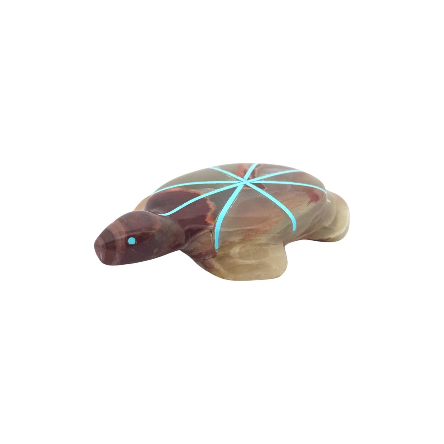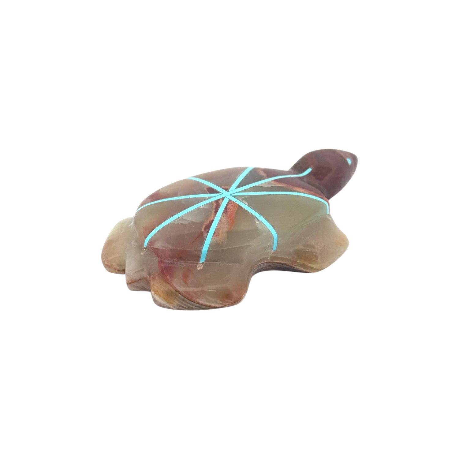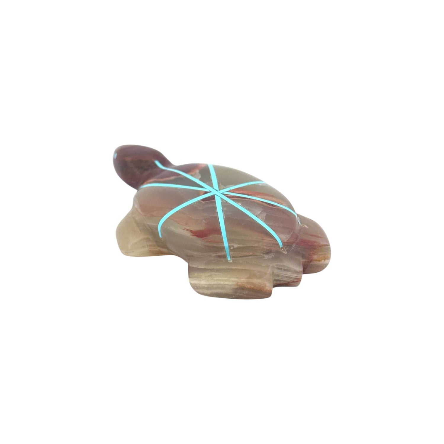 This exquisite Zuni hand-carved turtle fetish is skillfully crafted from richly patterned onyx, showcasing natural tones of deep russet, cream, and golden brown. The turtle, a revered symbol in Zuni culture, represents longevity, protection, and Mother Earth’s enduring strength. Its smoothly polished shell features a striking turquoise inlay starburst design, adding vibrant contrast and cultural significance. Delicate turquoise inlay eyes bring the carving to life, giving it a watchful and serene presence. The graceful curves of the shell and limbs reflect the artisan’s mastery in both form and detail. Onyx’s natural translucence and layered color variations enhance the piece’s depth and beauty from every angle.