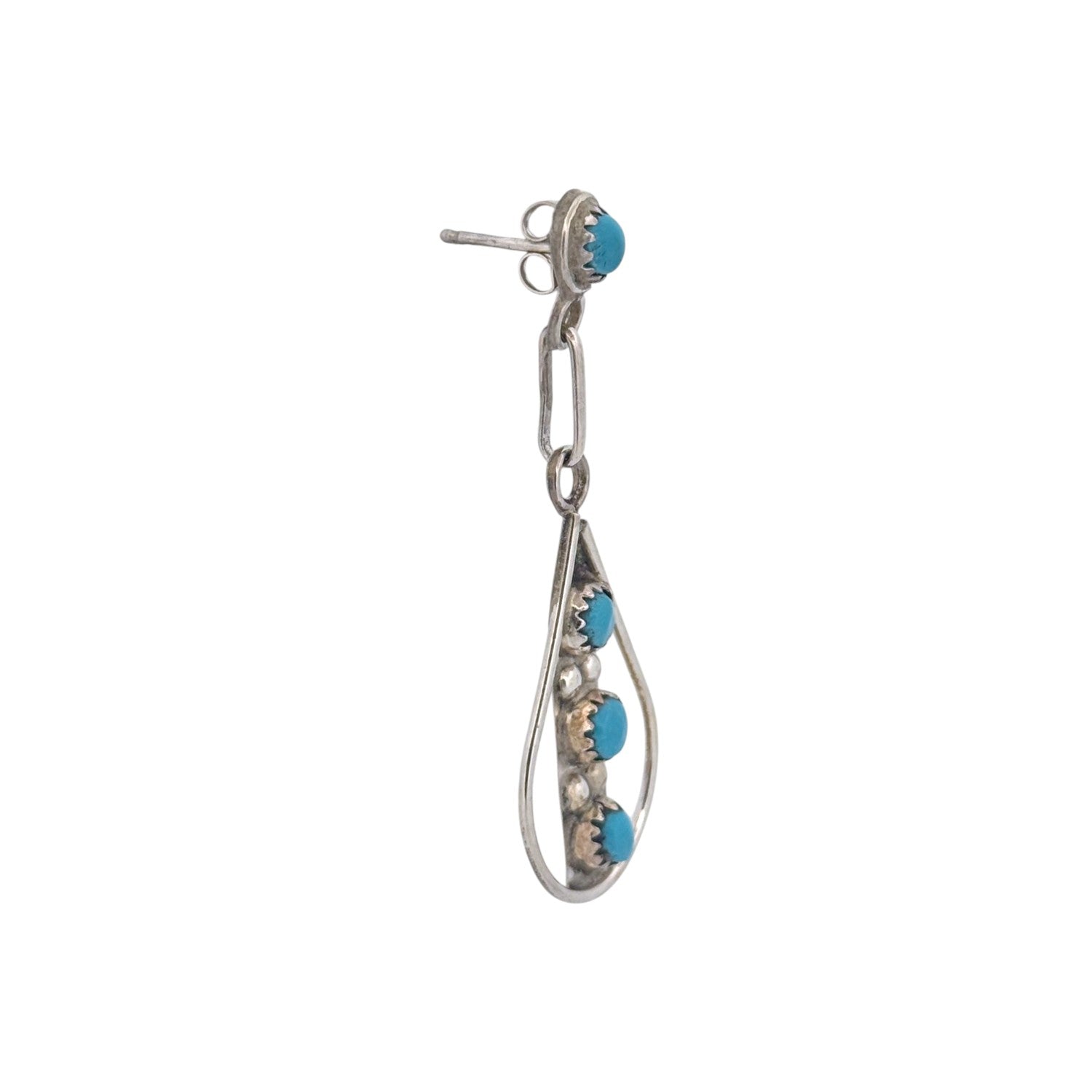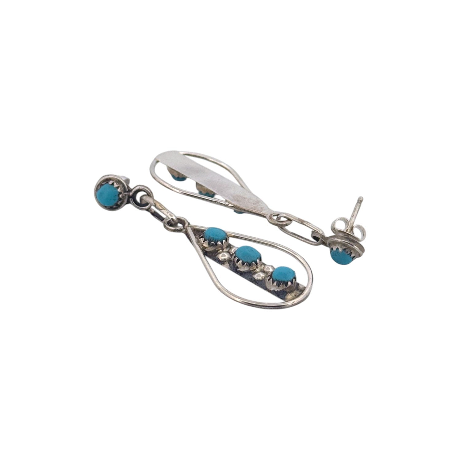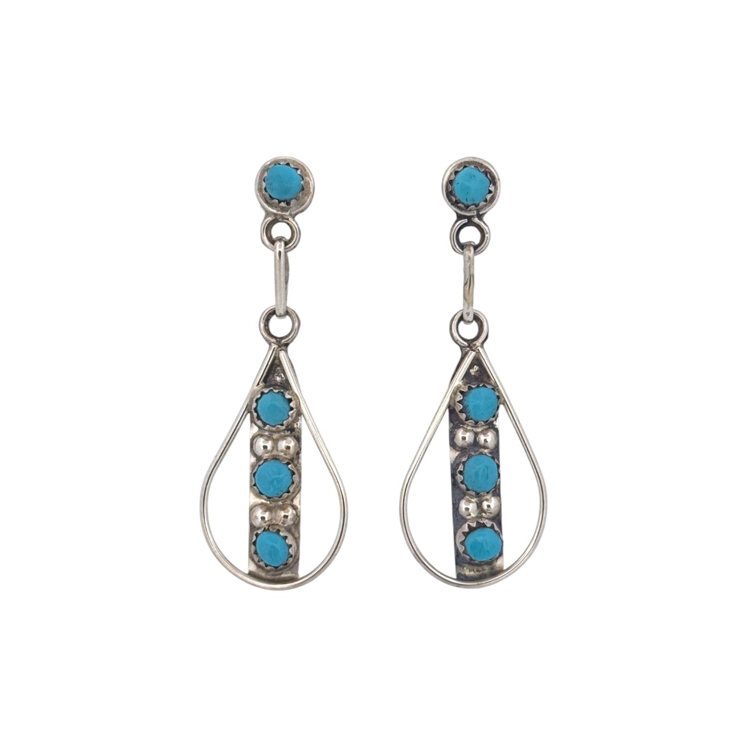 These graceful earrings by Navajo artist Gloria Lonasee highlight the timeless beauty of Sleeping Beauty Turquoise. Handcrafted in sterling silver, the design features an elegant teardrop shape, framing a vertical row of three vibrant turquoise stones accented with silver beads. The soft sky-blue color of the turquoise stands out brilliantly against the polished silver, embodying the purity and clarity for which Sleeping Beauty is so highly prized. Delicate yet eye-catching, the drop style creates gentle movement, enhancing their natural charm. The top stud adds balance, set with a single turquoise stone for a cohesive design. Both modern and traditional, these earrings are versatile enough for everyday wear while maintaining the artistry of authentic Navajo silversmithing.