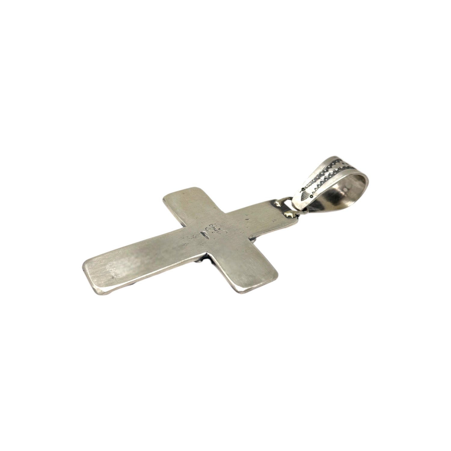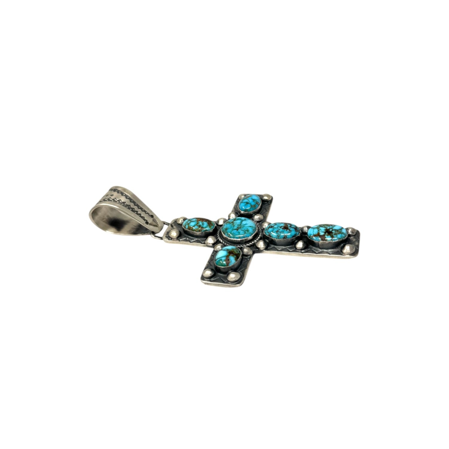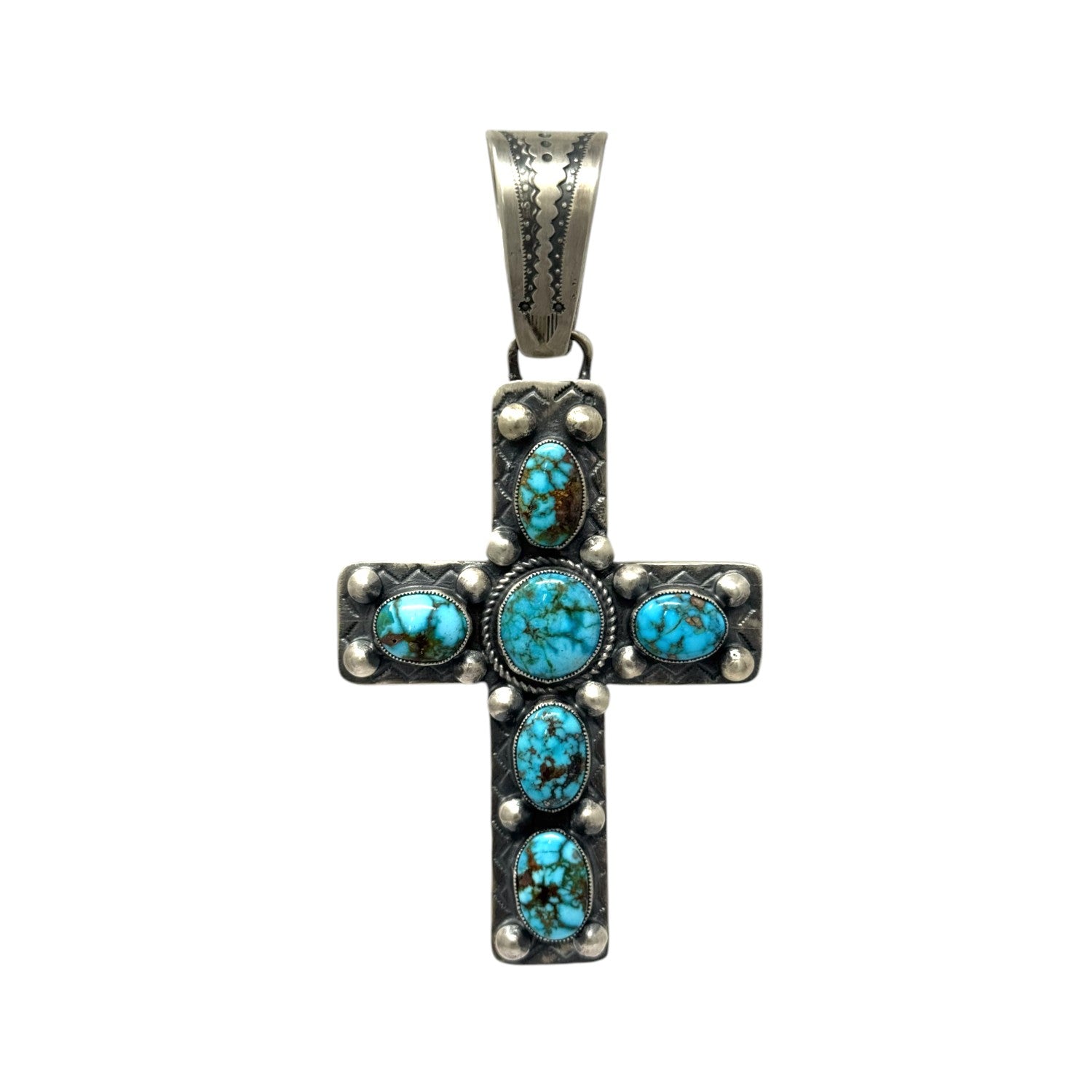 This striking pendant by renowned Navajo silversmith Dexter Martinez is a bold expression of spiritual symbolism and masterful craftsmanship. Hand-forged in sterling silver, the cross features seven captivating water web Kingman turquoise stones, each exhibiting a vivid blue hue with delicate webbing that adds depth and character. The stones are individually bezel-set and arranged in a balanced, sacred design that radiates harmony and strength. Intricate hand-stamped detailing across the silver surface enhances the visual depth, while the substantial bail, adorned with traditional motifs, allows for effortless pairing with a wide range of chains or necklaces.