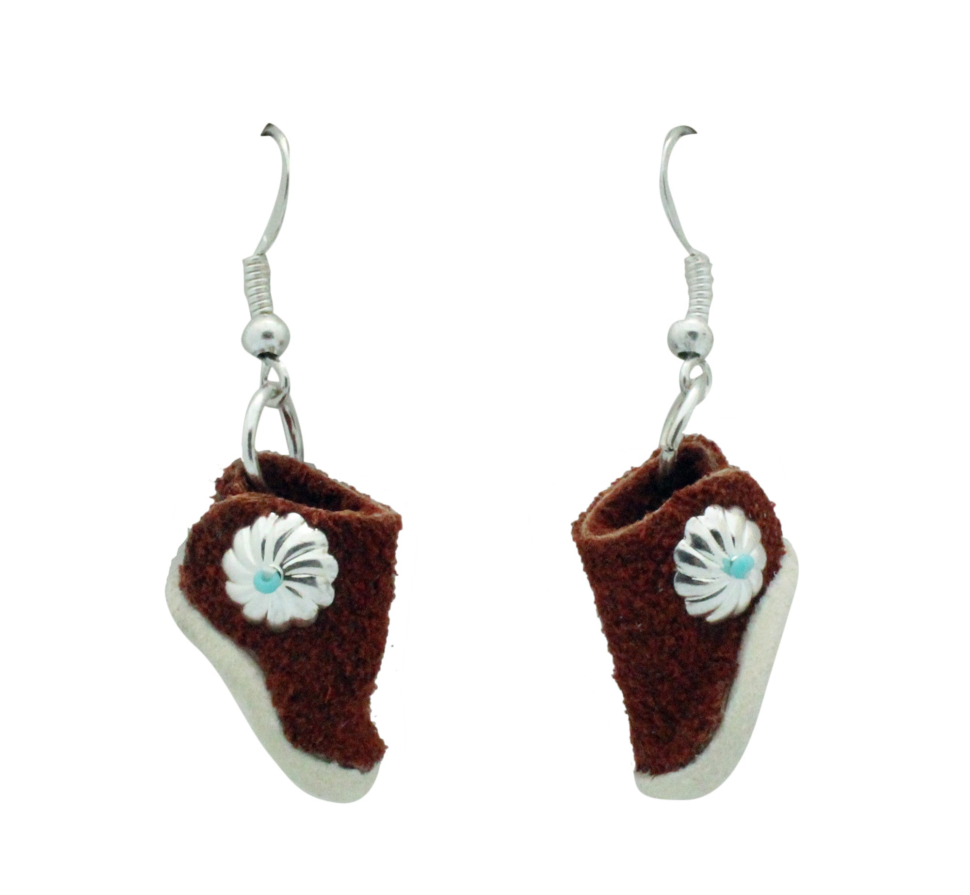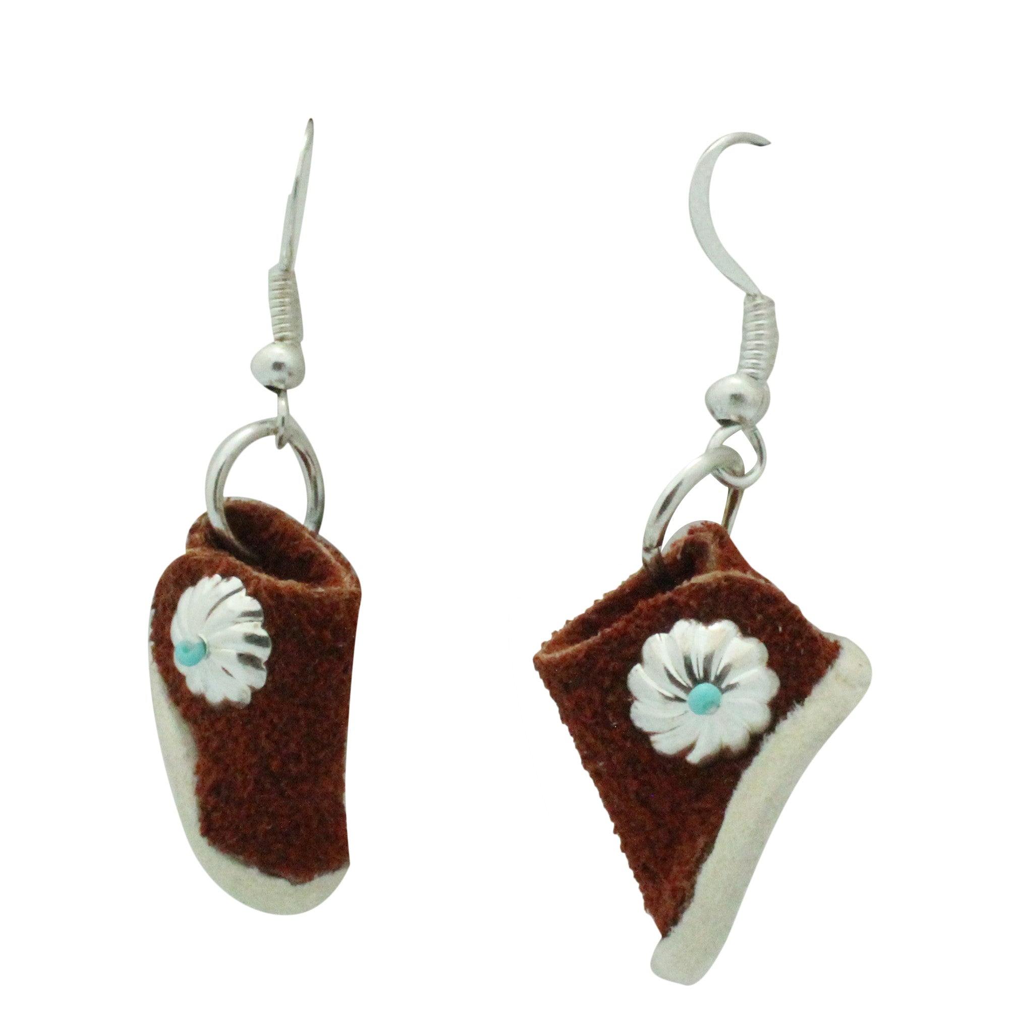 Deer skin moccasins are always a part of traditional Navajo dress. These gorgeous and fun to wear earrings are made to honor that tradition. You will find a small silver and turquoise button on the side. These earrings are a miniature of a regular size moccasin, a creative way to show moccasins as earrings. Which will go with any ward robe you wear for the day. It expresses fun and creative way earrings can be made in a pair of moccasins. A great collection to have with your other earrings.