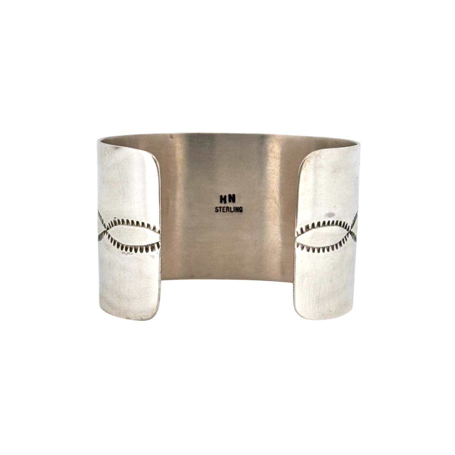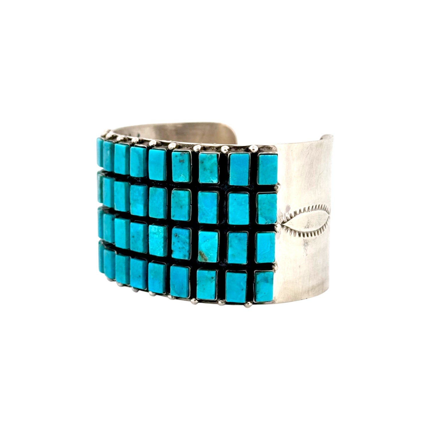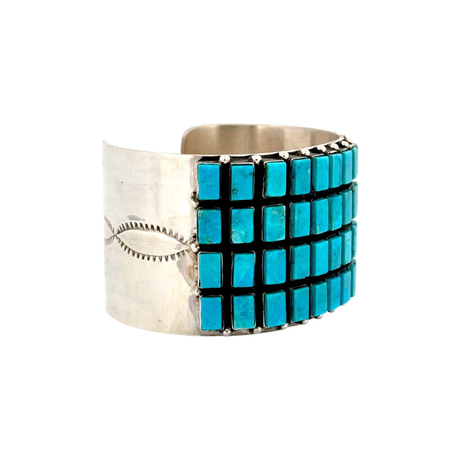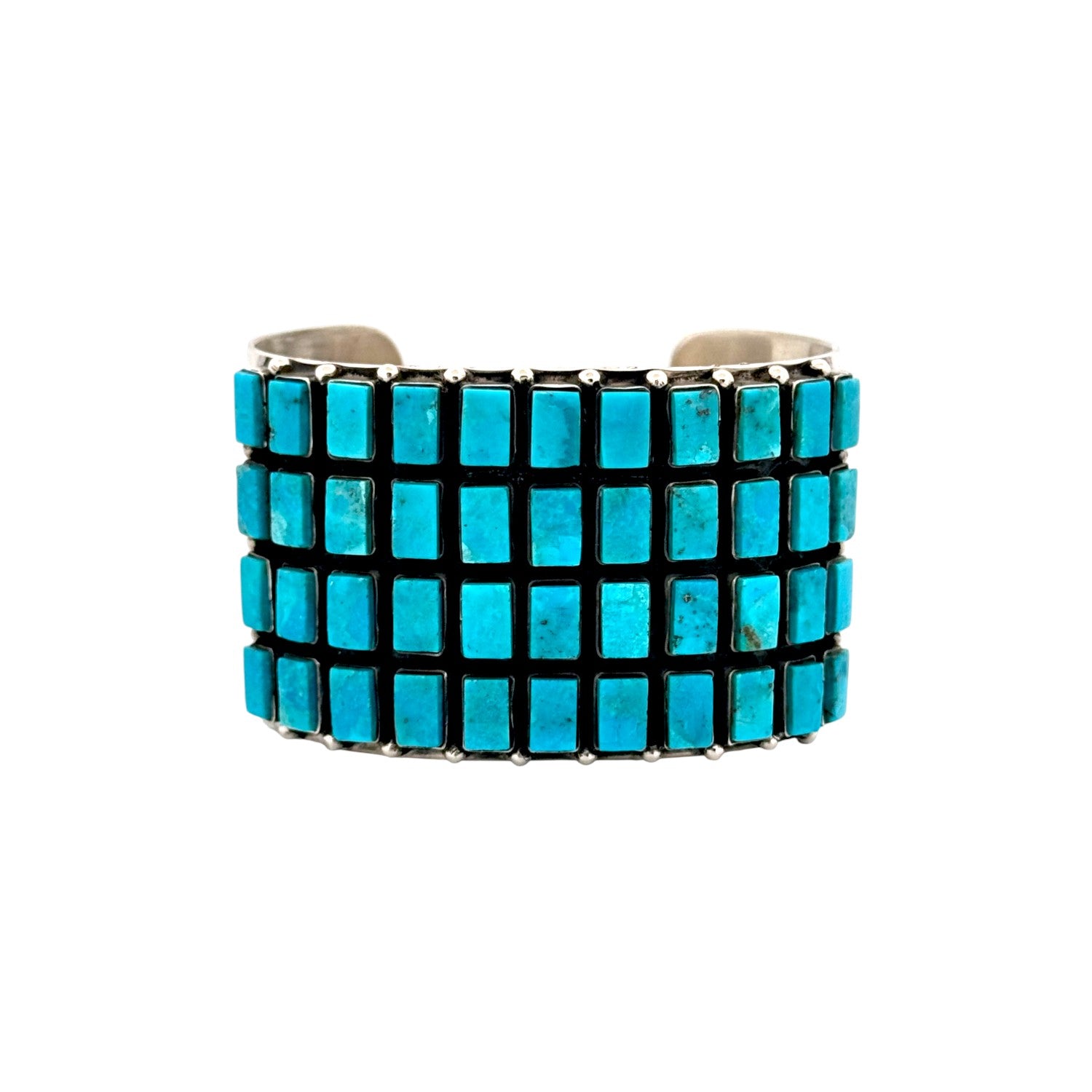This sterling silver bracelet by Herman Nez is a bold and masterful display of Navajo handmade artistry. The wide cuff features a striking grid of hand-cut Kingman Turquoise stones, each meticulously set to create a seamless mosaic of vivid blue. The stones’ natural variations in hue and matrix add depth and character, showcasing the beauty of authentic turquoise. The dark oxidized background provides contrast, making the vibrant stones stand out with even greater brilliance. Strong and substantial, this bracelet reflects both traditional Navajo craftsmanship and a contemporary geometric design. Its bold style makes it a true statement piece, perfect for collectors and admirers of fine Native jewelry.