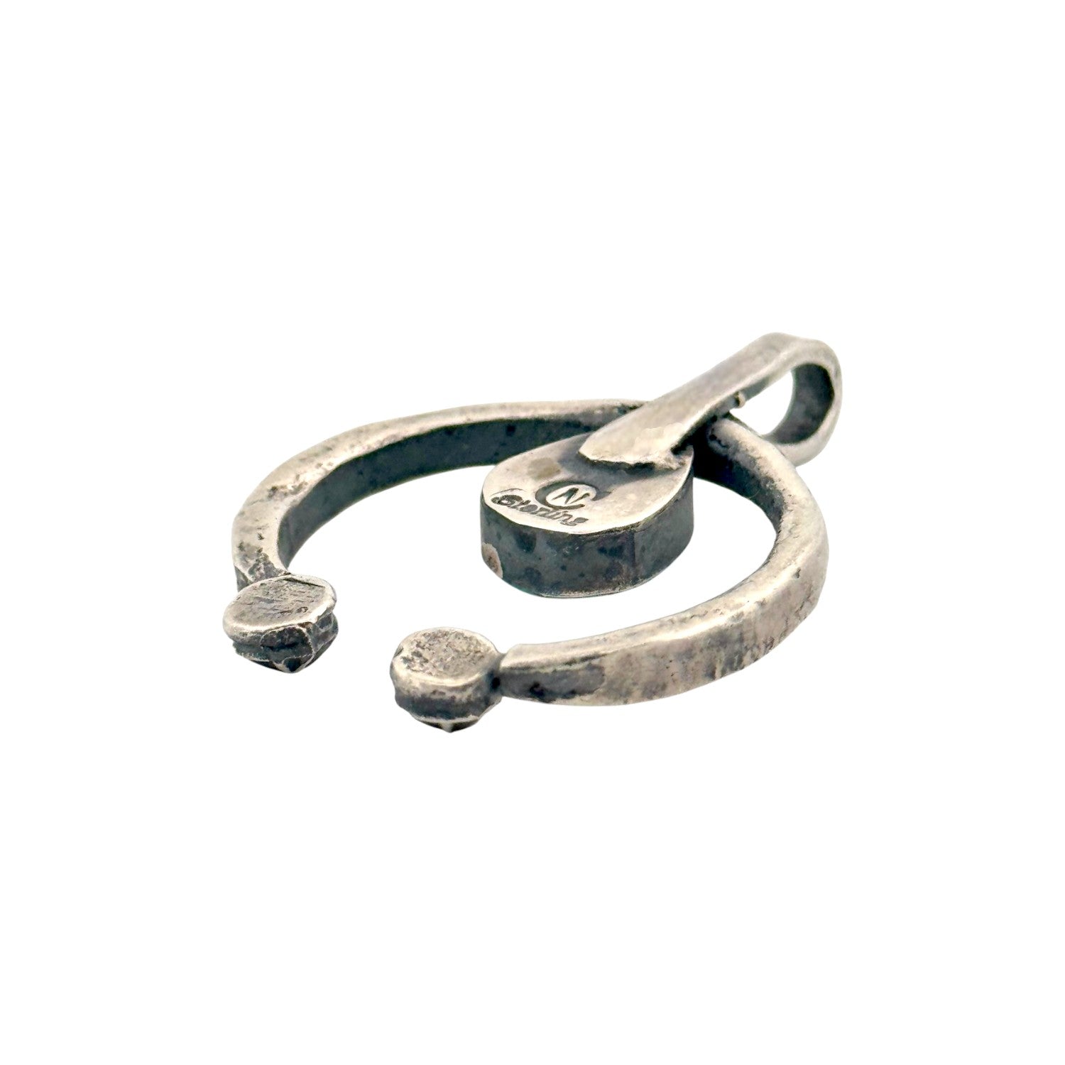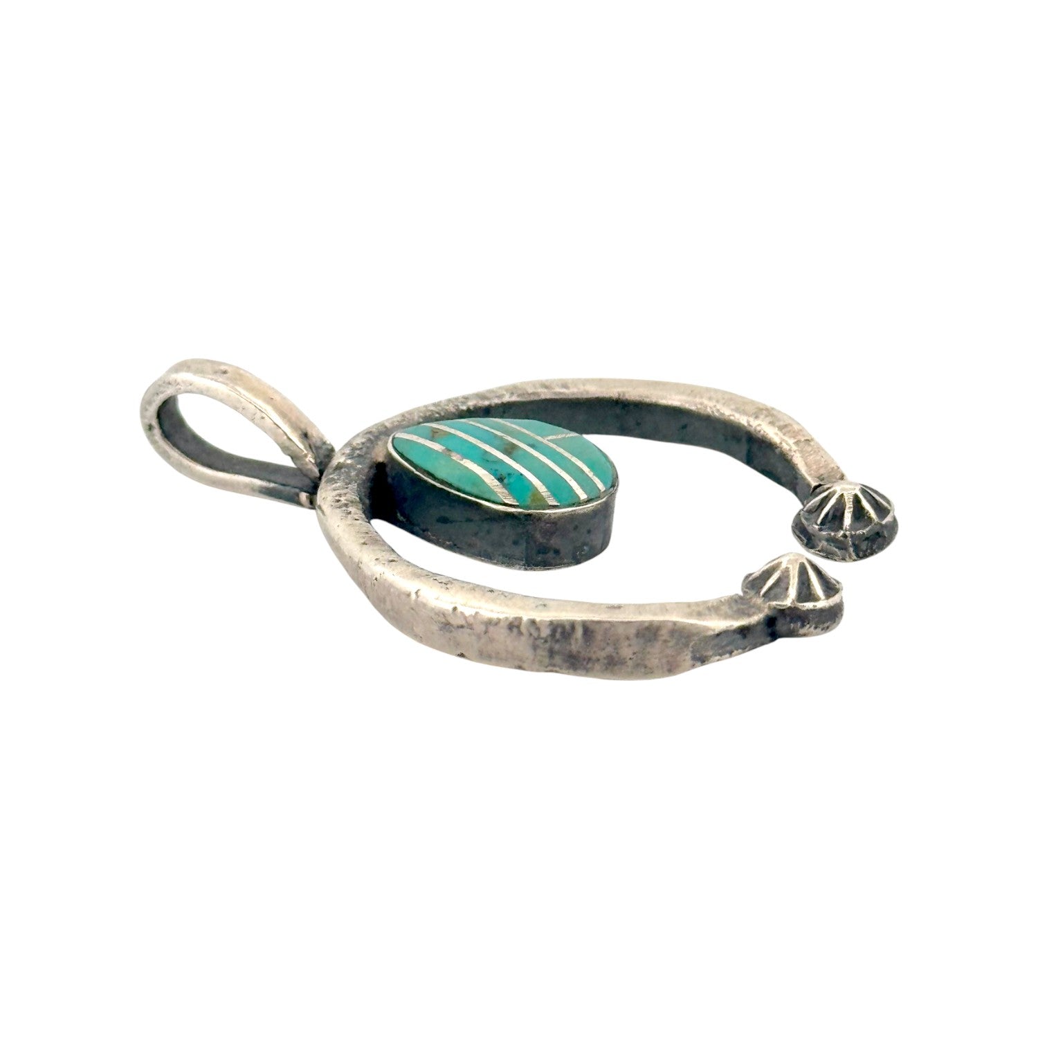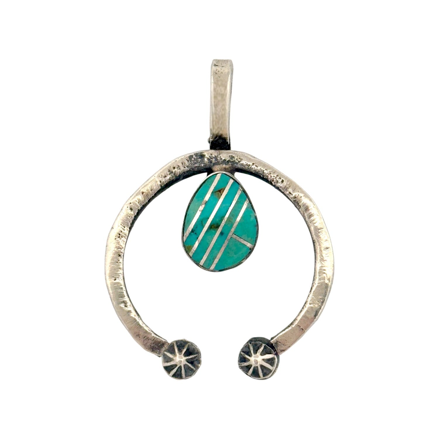 This Navajo handmade pendant by Cody Noble features a striking Kingman turquoise stone, inlaid with sleek sterling silver channels for a bold, contemporary touch. The turquoise teardrop rests within a classic naja-shaped silver frame, a traditional Navajo symbol often seen in squash blossom necklaces. The frame has a hand-forged, slightly textured finish, giving it an earthy and authentic character. At the base of the naja, two stamped starburst accents add balance and symmetry to the design. The vivid turquoise, sourced from the famed Kingman mine in Arizona, is celebrated for its bright blue hue and subtle matrix. Blending traditional Navajo symbolism with a modern inlay style, this piece reflects both heritage and innovation in Native silversmithing.