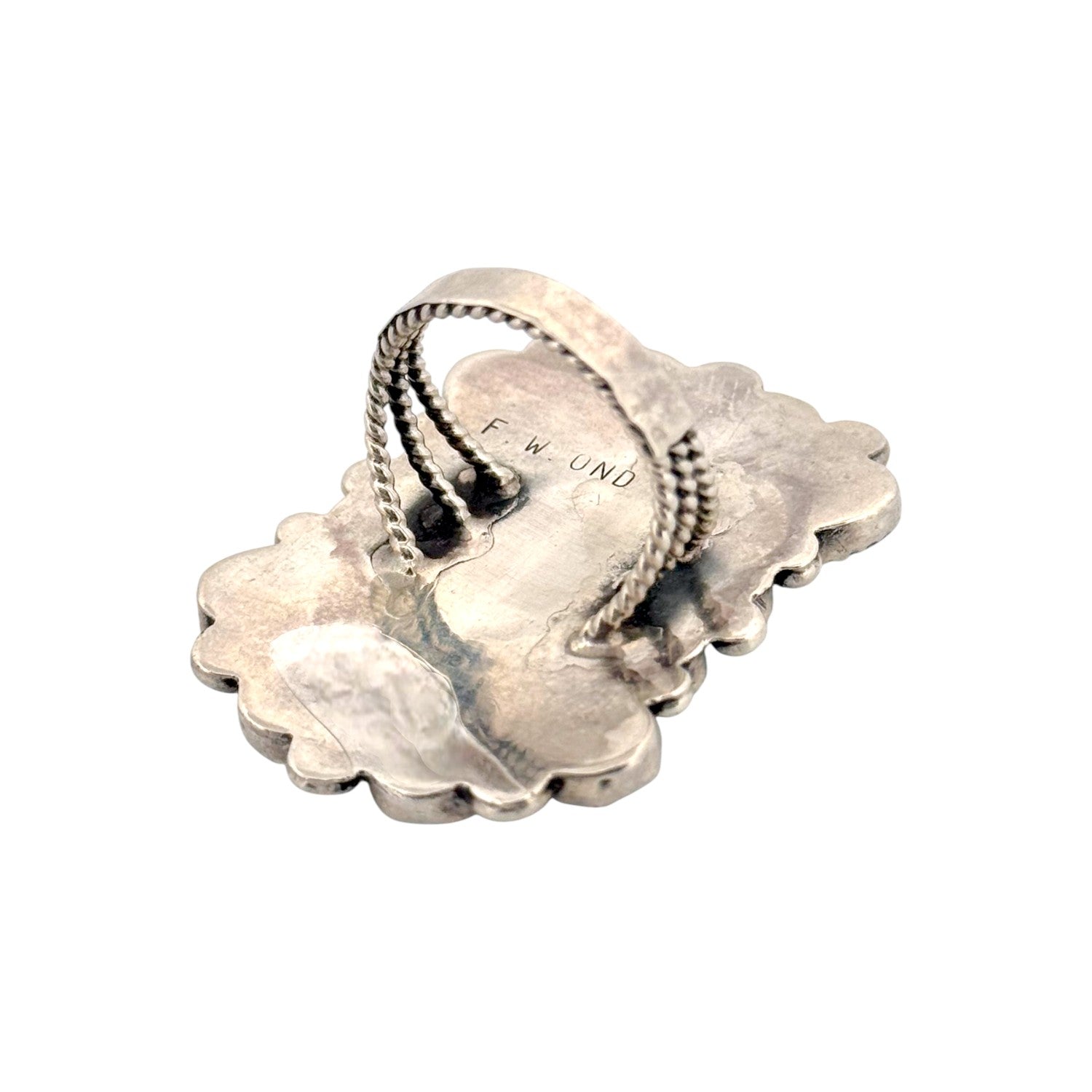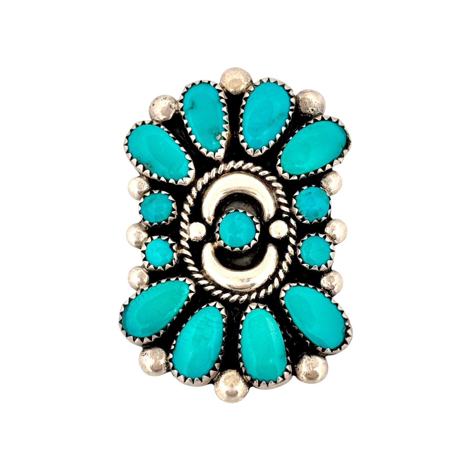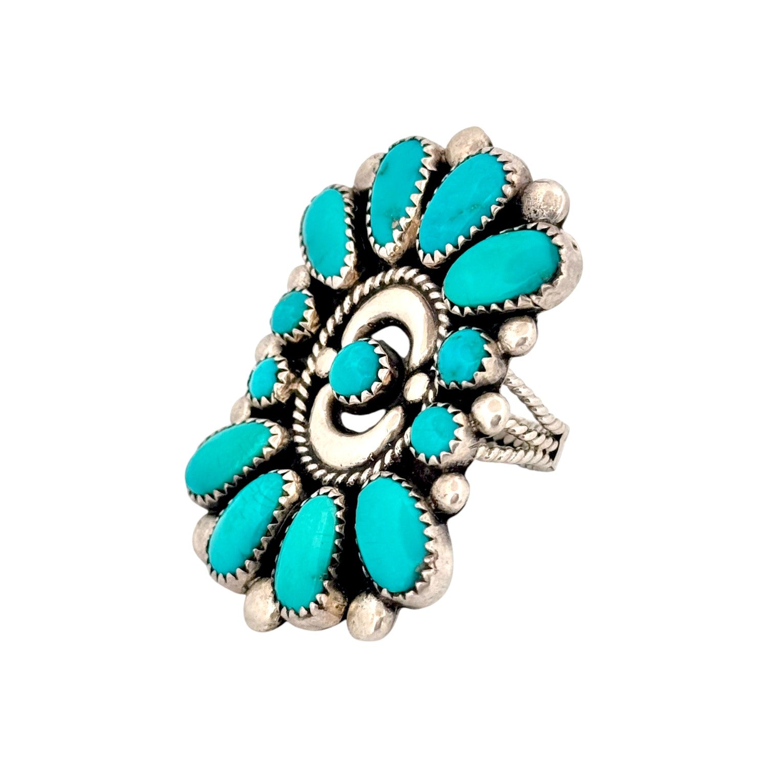 This vintage Zuni ring by Fannie Weebothee Ondelacy, circa 2000s, is a vibrant cluster design that highlights the beauty of Kingman Turquoise. Handmade in sterling silver, the piece features an arrangement of both oval and round cabochons in vivid sky-blue tones, each set in fine sawtooth bezels. The turquoise stones are framed by twisted rope accents and silver drops, creating depth and balance in the overall composition. At the center, a crescent-shaped silver motif adds a distinctive focal point, showcasing the artist’s attention to traditional Zuni design elements. The oxidized background enhances the brilliance of the turquoise, making the colors stand out boldly. Known for her skilled craftsmanship, Ondelacy’s work is celebrated for its precision and cultural authenticity. Substantial and eye-catching, this ring embodies the artistry and heritage of Zuni silversmithing.