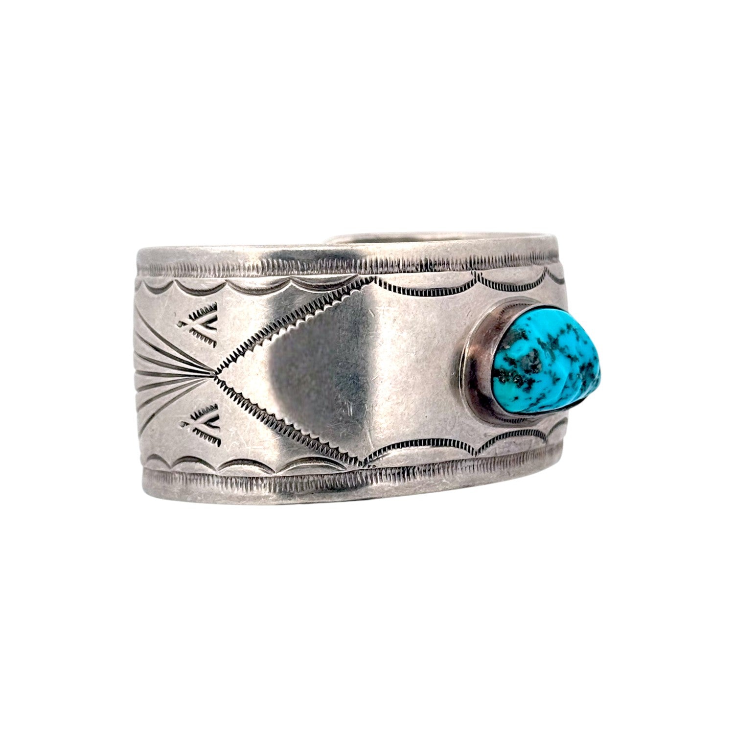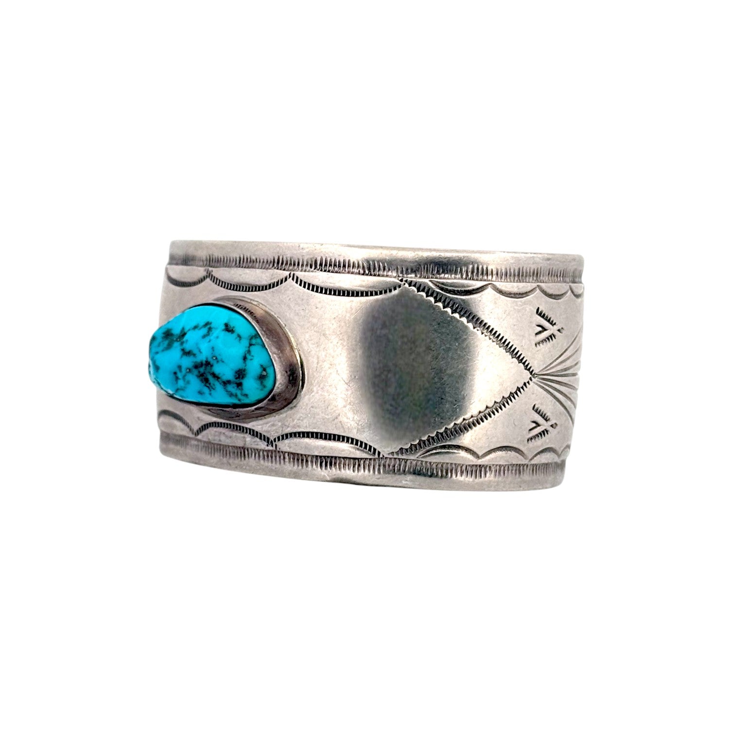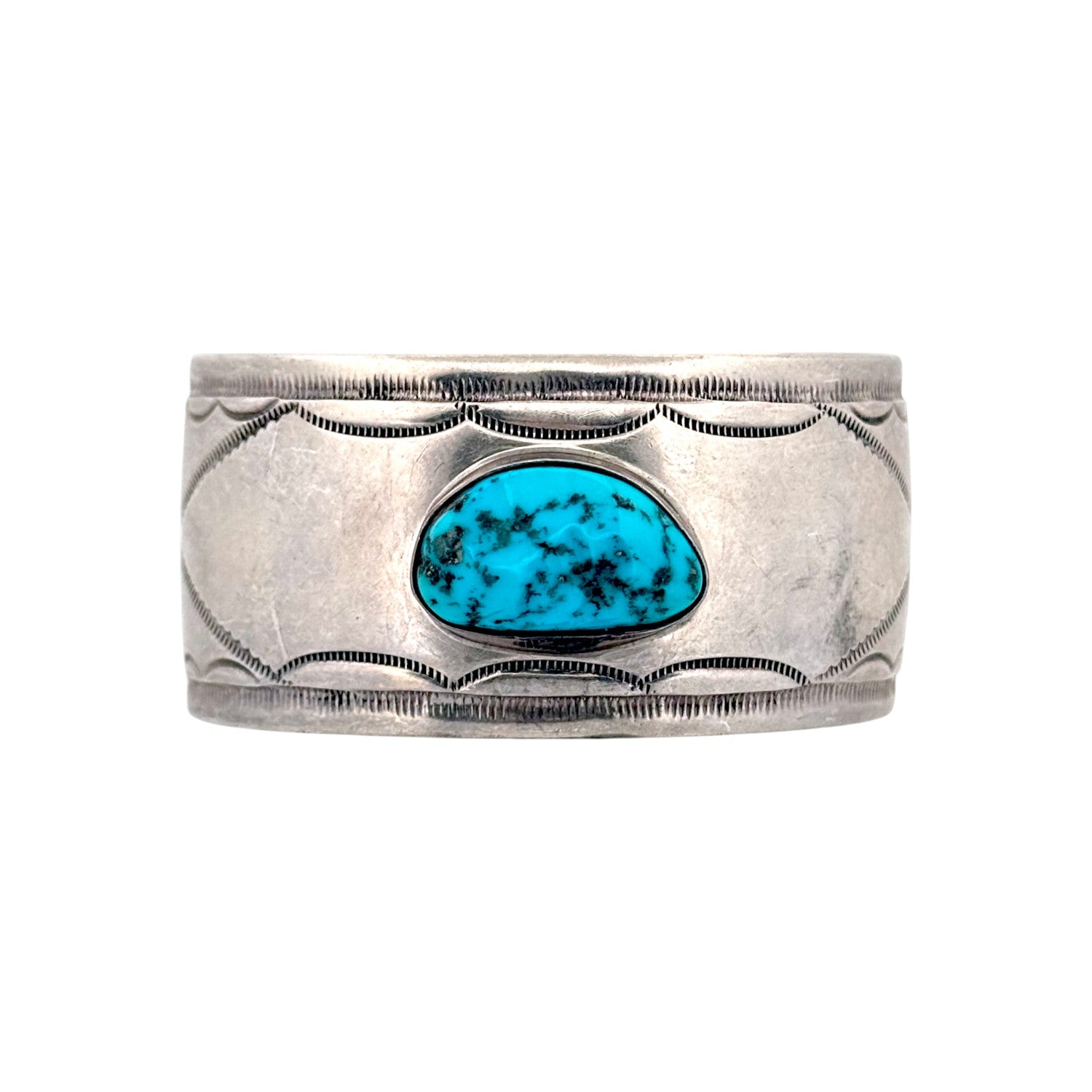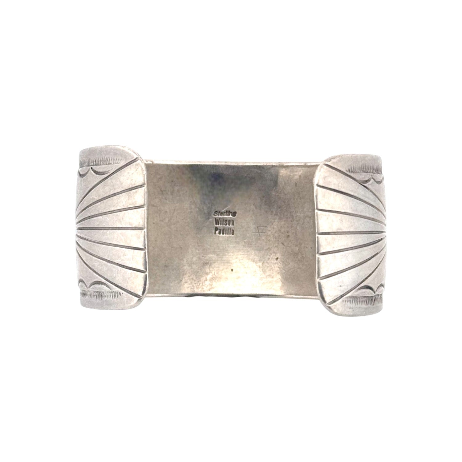 This vintage Navajo bracelet by Wilson Padilla, crafted in the 1990’s, showcases the understated beauty of Kingman Turquoise. The wide sterling silver cuff is adorned with a single turquoise stone, rich in blue hues with striking black matrix, set in a smooth bezel that emphasizes its natural character. Subtle stamp work borders the cuff, adding symmetry and depth without overwhelming the bold simplicity of the design. The wide band gives the bracelet a strong, confident presence while maintaining a timeless elegance. Its natural patina enhances its vintage appeal, reflecting years of authenticity and history. Wilson Padilla’s craftsmanship is evident in the balance between silverwork and stone, creating a piece that is both wearable and collectible.