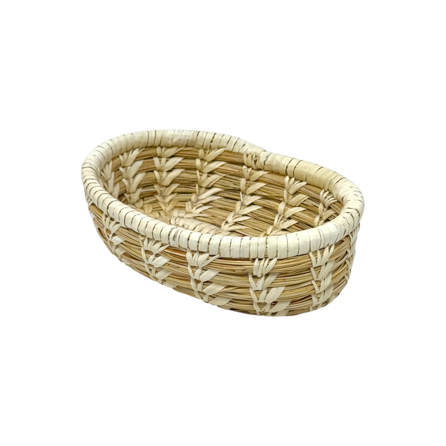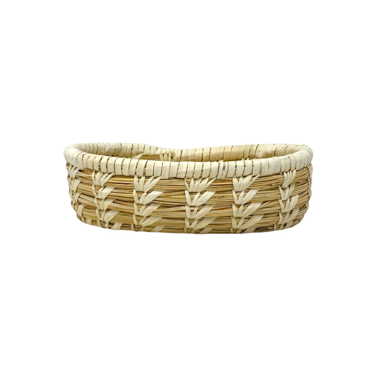This vintage Papago handwoven basket bowl is a beautiful example of traditional Tohono O’odham craftsmanship. Meticulously woven from natural desert materials, its warm, earthy tones are accented by intricate, repeating patterns that showcase the skill and artistry passed down through generations. The oval-shaped form is both functional and decorative, making it perfect for display or light storage. Each fiber is tightly woven for durability, while the subtle variations in color reflect the natural beauty of the materials. Papago baskets are highly valued for their cultural significance, often used for gathering and ceremonial purposes.