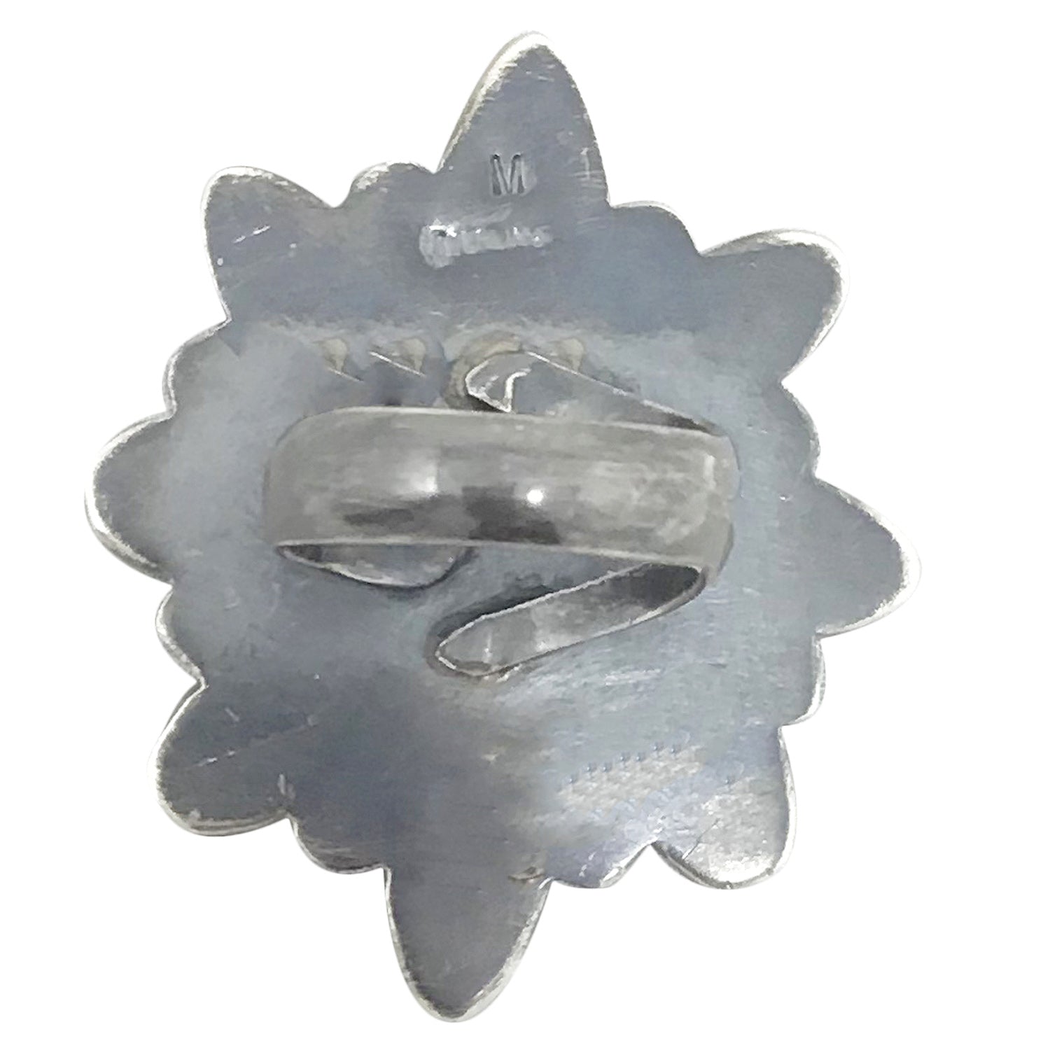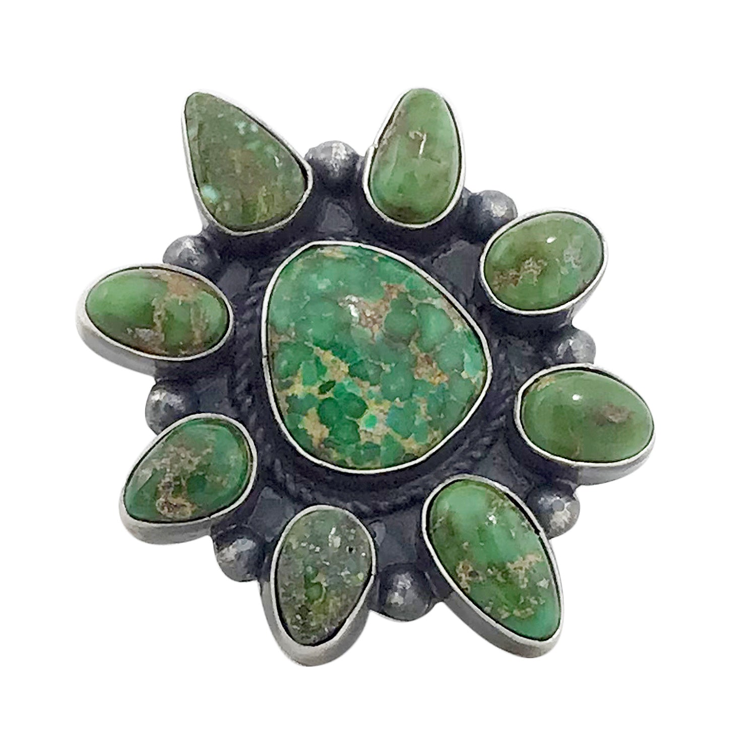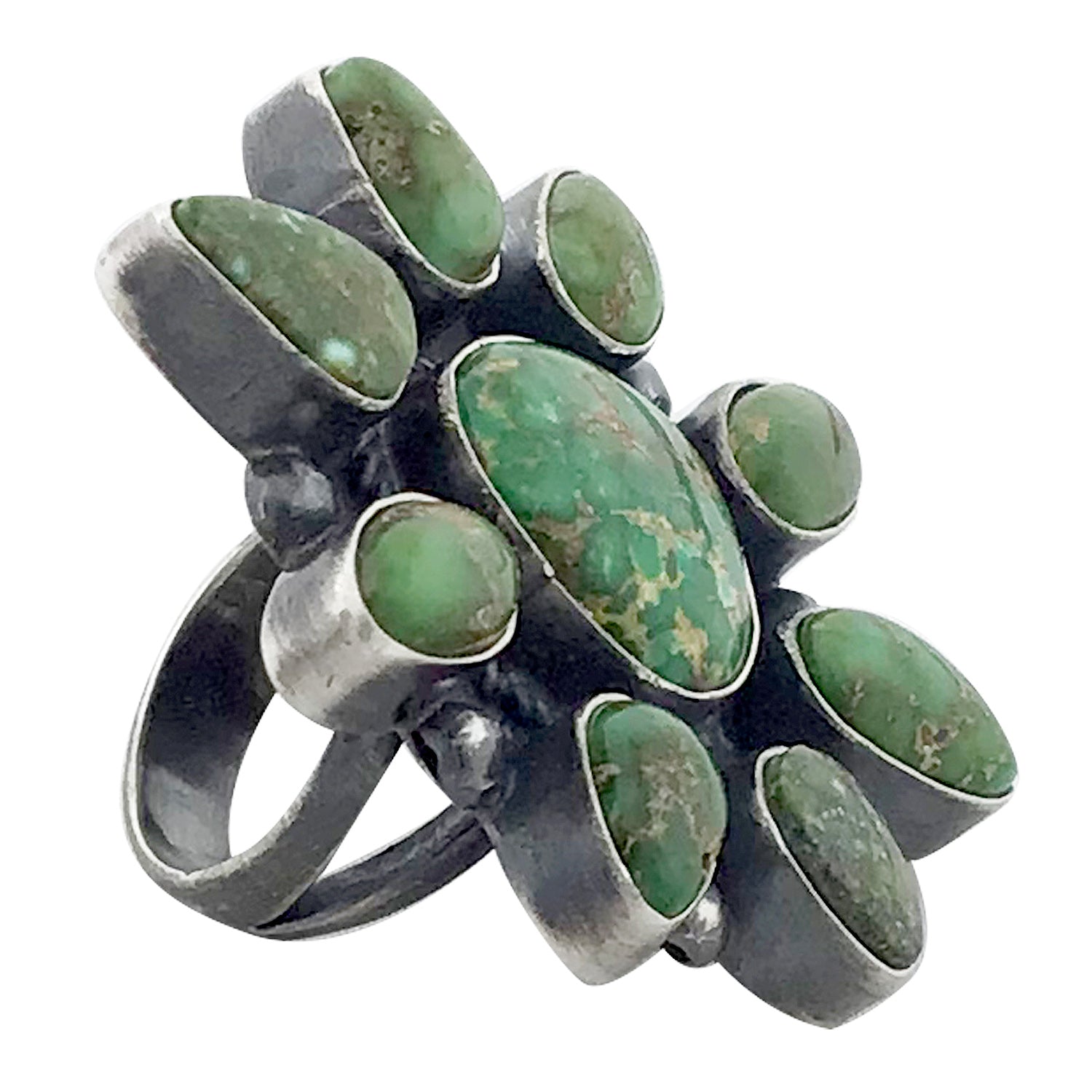 One of the unique things about First American art is all the different colors of stone you find set in the handmade silver. Navajo silversmith Mildred Parkhurst has used a a collection of stunning Sonoran Gold Turquoise to fill this cluster ring. You will love the rich green colors of the stone with the light brown matrix. Mildred uses an adjustable band and a rustic brush finish to complete the piece.