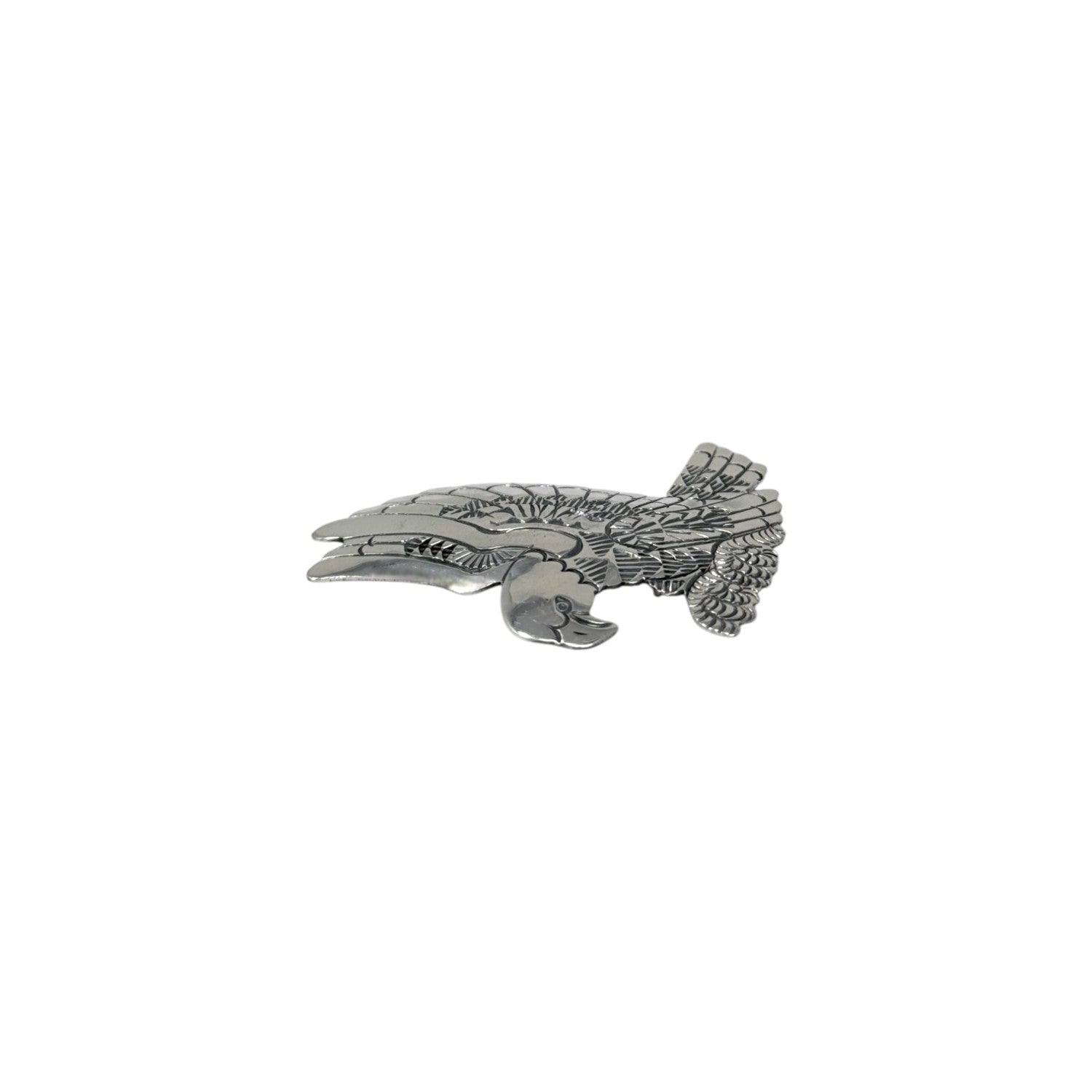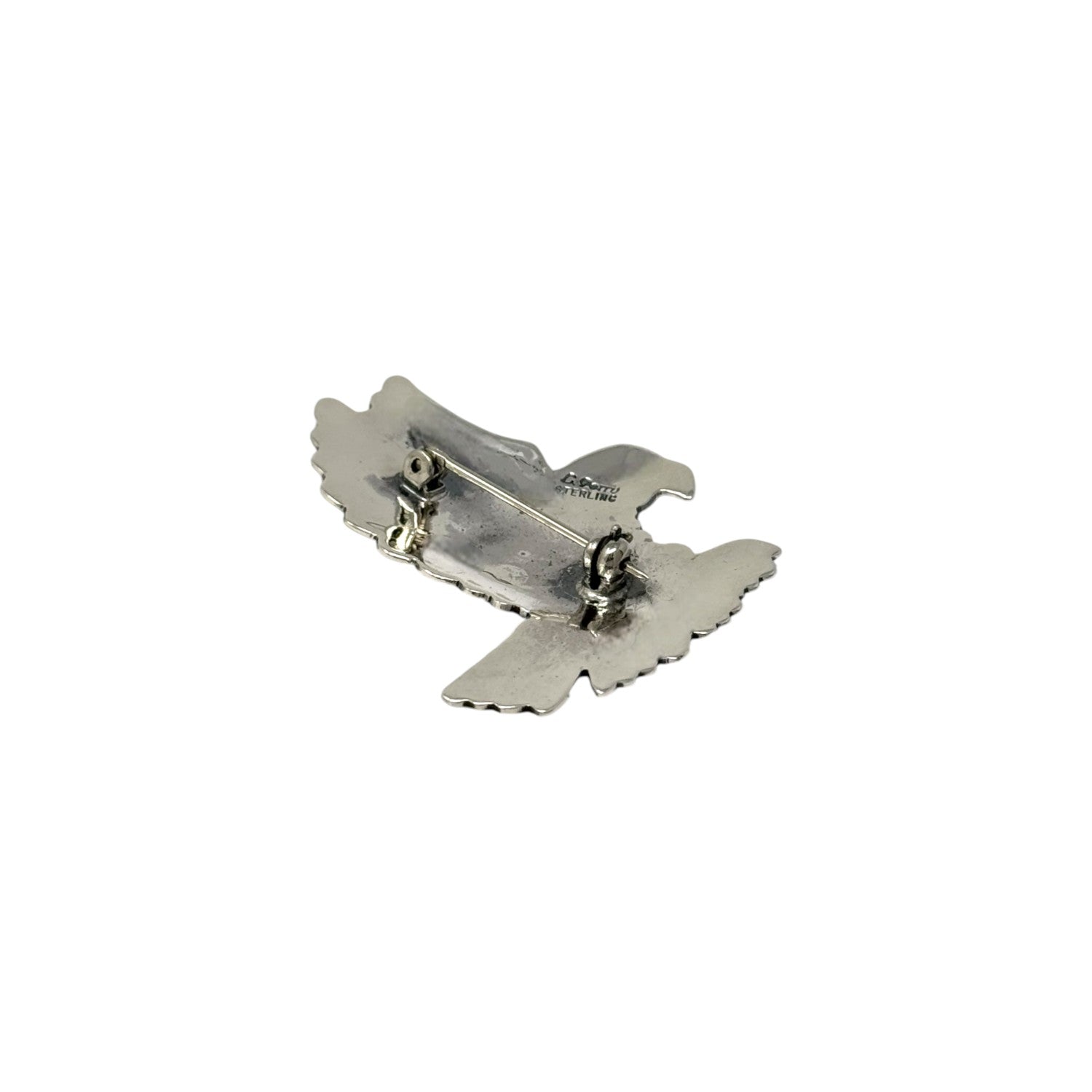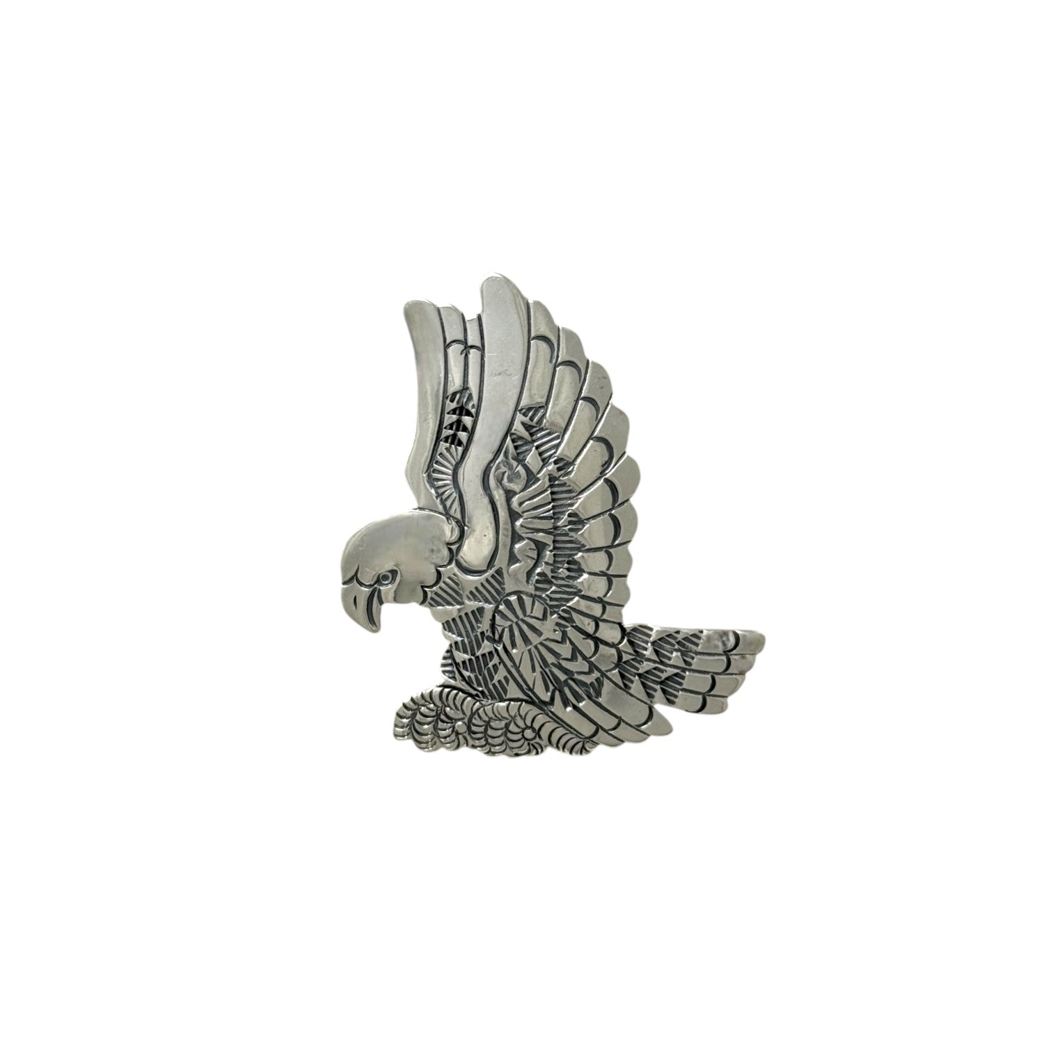 This striking sterling silver pin by Navajo artist Limbert Perry captures the majesty of an eagle in mid-descent, wings poised in dramatic motion. Meticulously hand-stamped and sculpted, the feathers are defined with precision, showcasing Perry’s signature style and attention to detail. The eagle’s powerful posture and focused expression embody strength, vision, and spiritual protection, qualities deeply revered in Native American culture. Each engraved line and texture brings depth and dimension, creating a lifelike sense of movement. The high polished finish enhances the bold, symbolic design while honoring traditional Navajo silversmithing techniques.