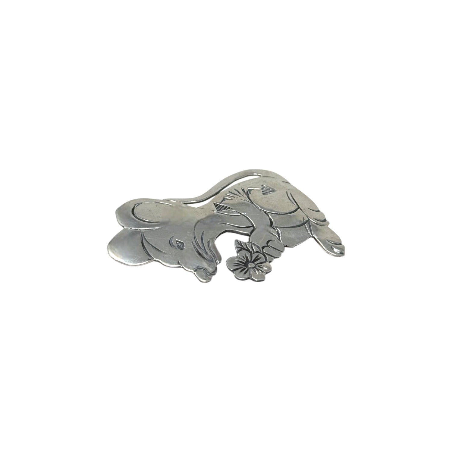 This delightful sterling silver pin by Navajo artist Limbert Perry captures the playful charm of a mouse delicately holding a flower. Expertly handcrafted, the piece showcases Perry’s hallmark stamp work and attention to whimsical detail, from the mouse’s expressive features to the etched fur lines and layered garment. The polished silver radiates warmth and character, making it a lighthearted yet finely made collectible. At once artistic and endearing, it’s a unique example of how traditional silversmithing can embrace storytelling and personality. Whether worn as a pin or displayed in a collection, this piece evokes joy and craftsmanship in equal measure.