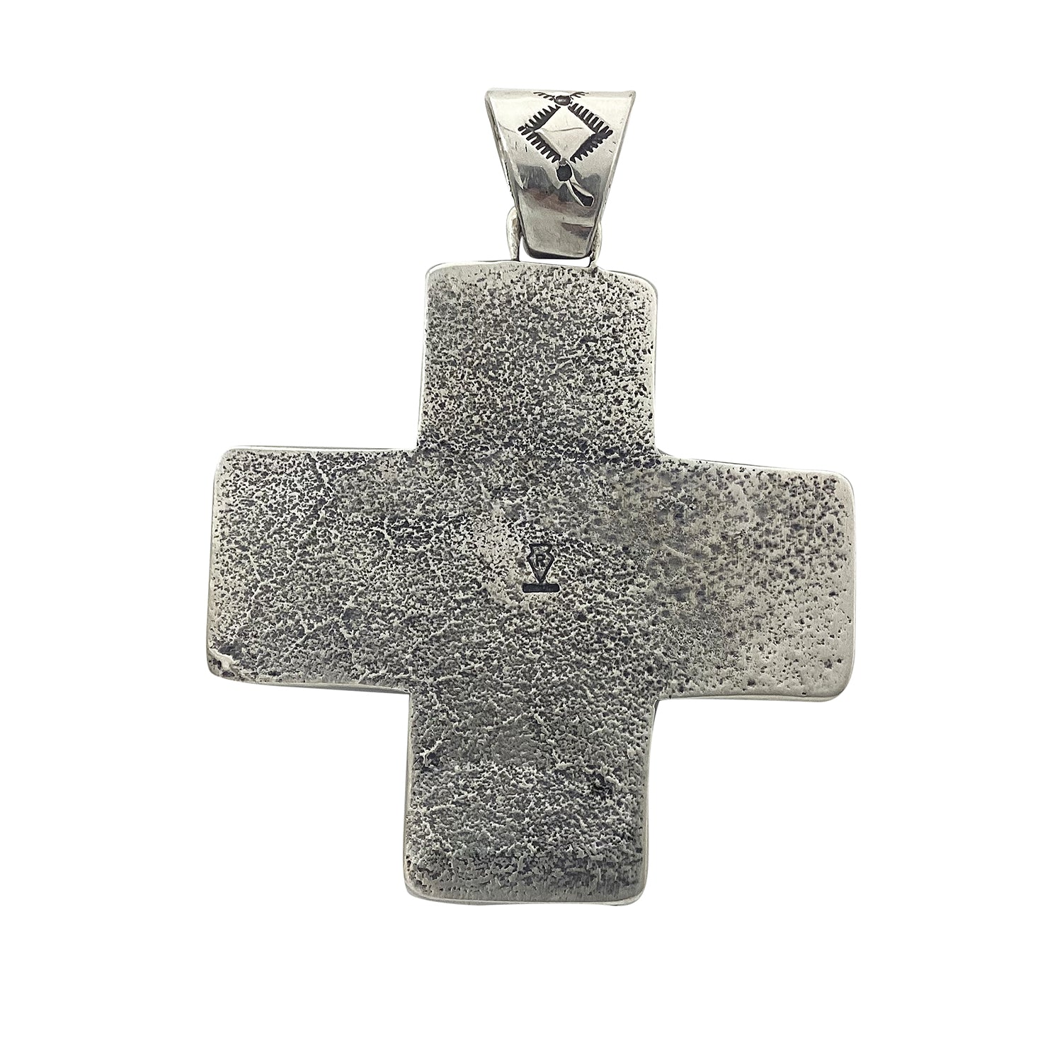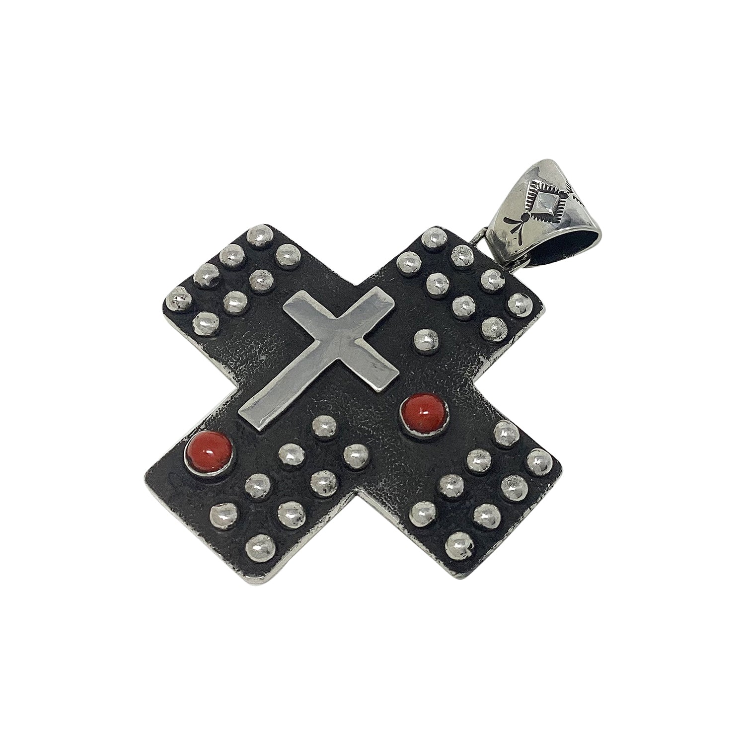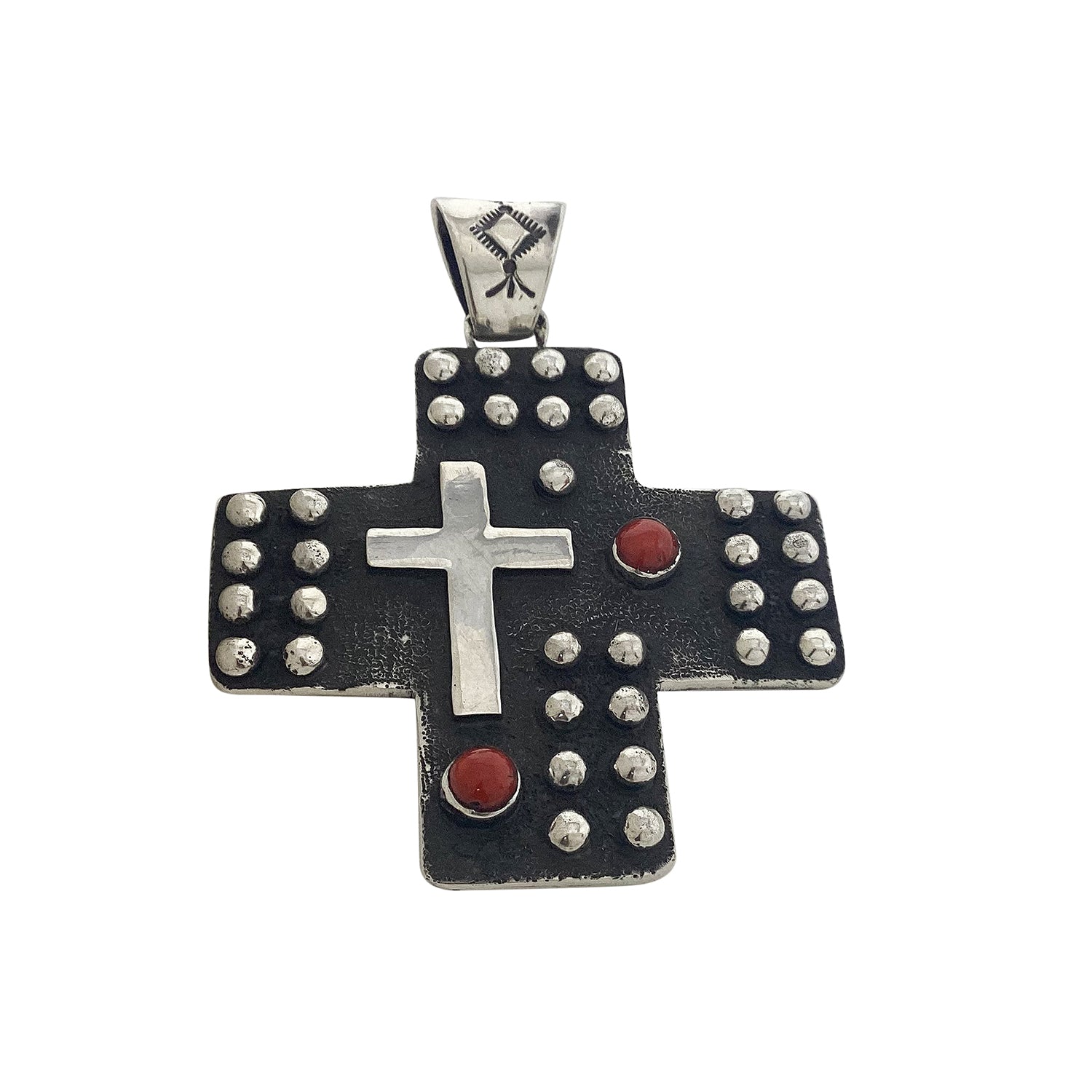 Navajo artist Ernest Rangel makes a cross pendant. The 2 1/2" length should tell you this is a good size creation. This pendant is filled with silver drops and another silver cross giving it a realistic look. He creates a cross using sand casting techniques and has two round coral stones. Ernest gives the silver a rustic brushed finish that gives you that wonderful Southwest style. Check out the online Trading Post for more of his work.