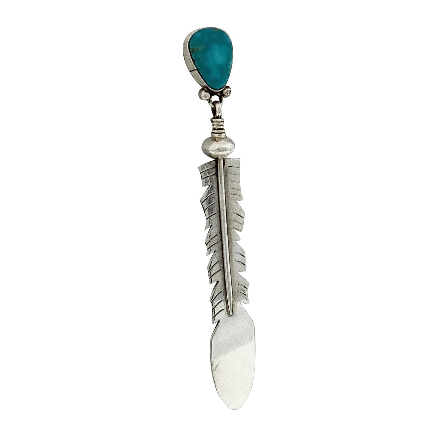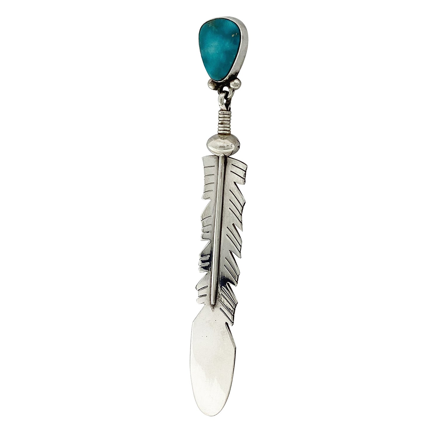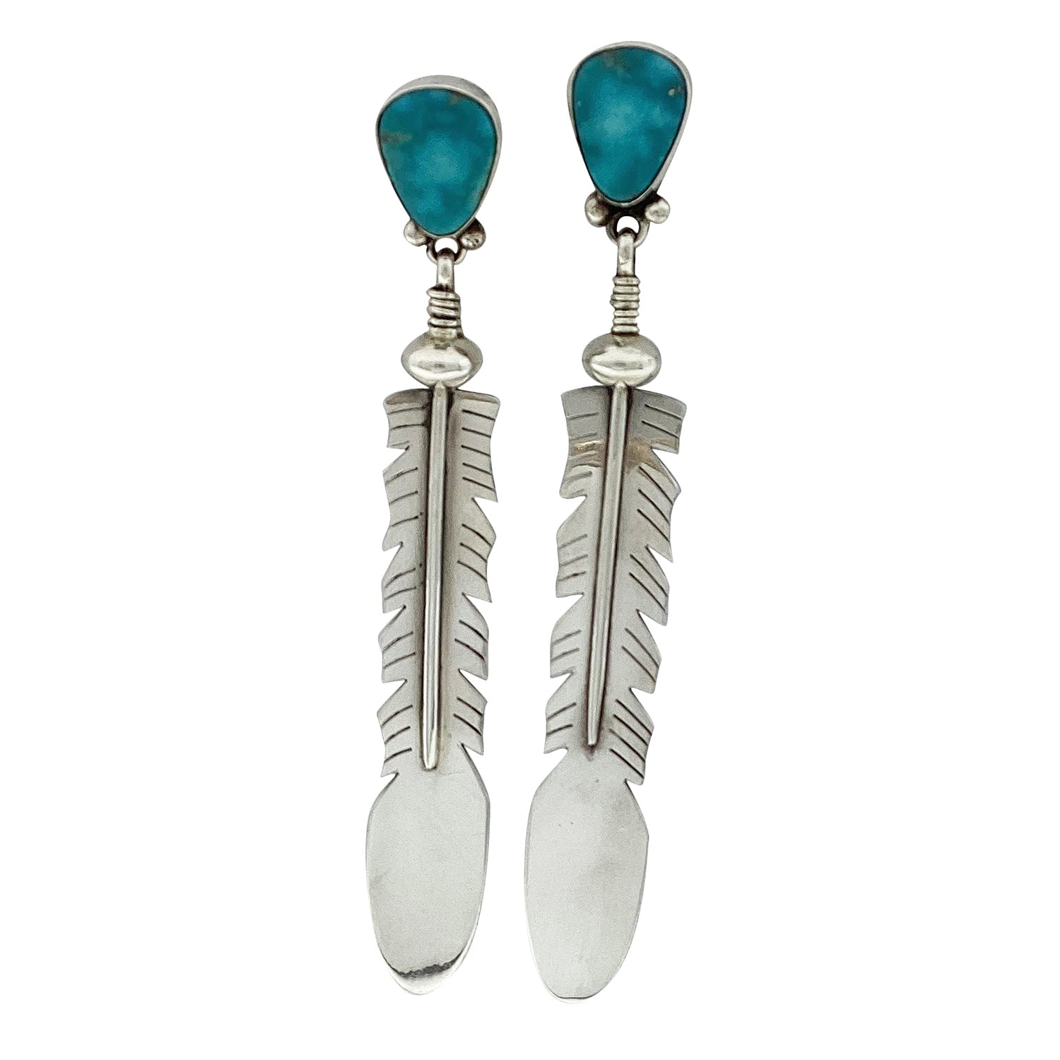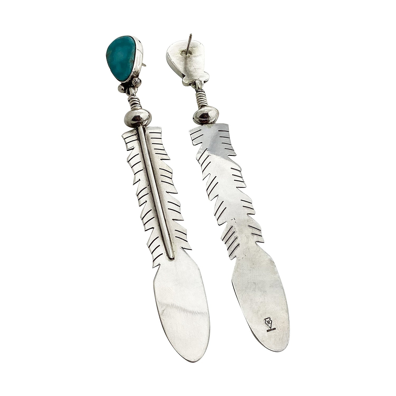 Navajo artist Ernest Rangel makes some beautiful pieces of wearable art. This pair of dangle earrings capture the beauty of the Southwest perfectly. He creates a pair of eagle feathers using long cuts of sterling silver that he has shaped the silver to give the feathers a realistic look. A Sonoran Rose Turquoise cabochon fills the top of the earring and gives the you a wonderful cut of the sacred stone. You are going to love the length and style of this unique earring. Check out the online Trading Post for more of his amazing work.