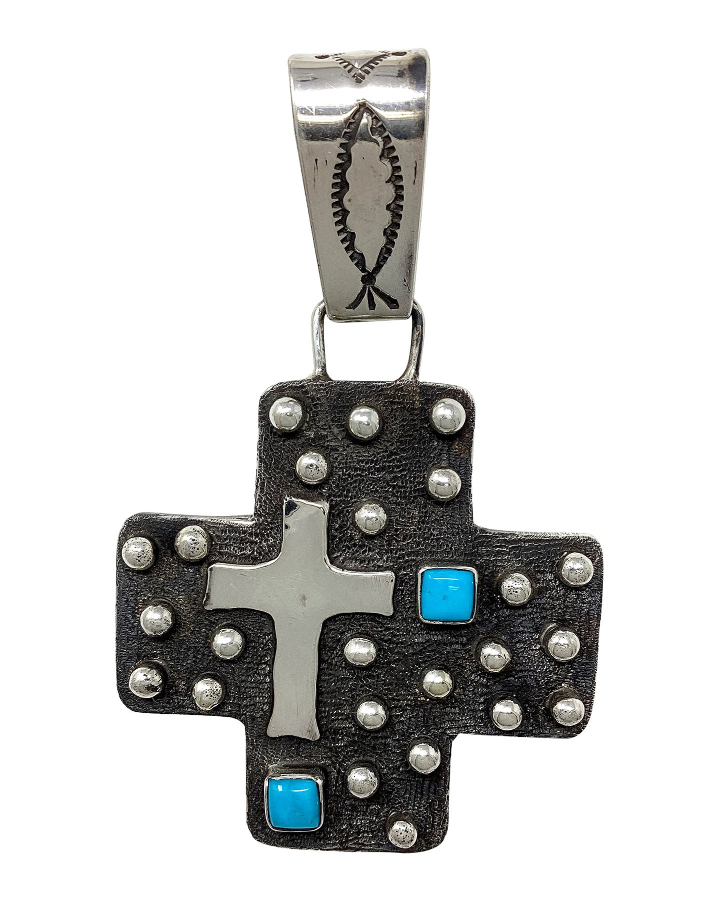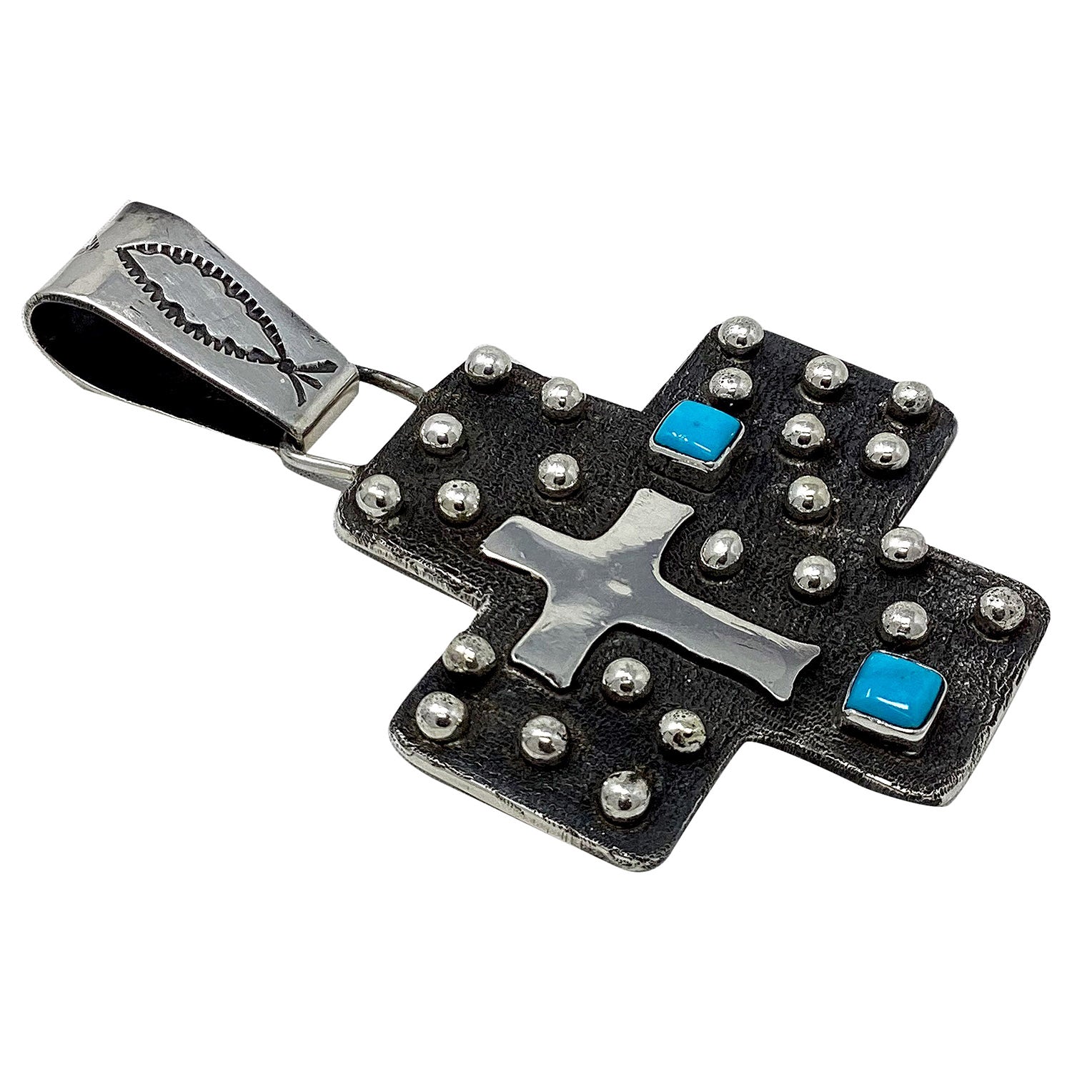 Navajo artist Ernest Rangel makes a cross pendant. The 2 3/4" length should tell you this is a good size creation. This pendant is filled with silver drops and another silver cross giving it a realistic look. He creates a cross using sand casting techniques and has two square Turquoise stones. Ernest gives the silver a rustic brushed finish that gives you that wonderful Southwest style. Check out the online Trading Post for more of his work.