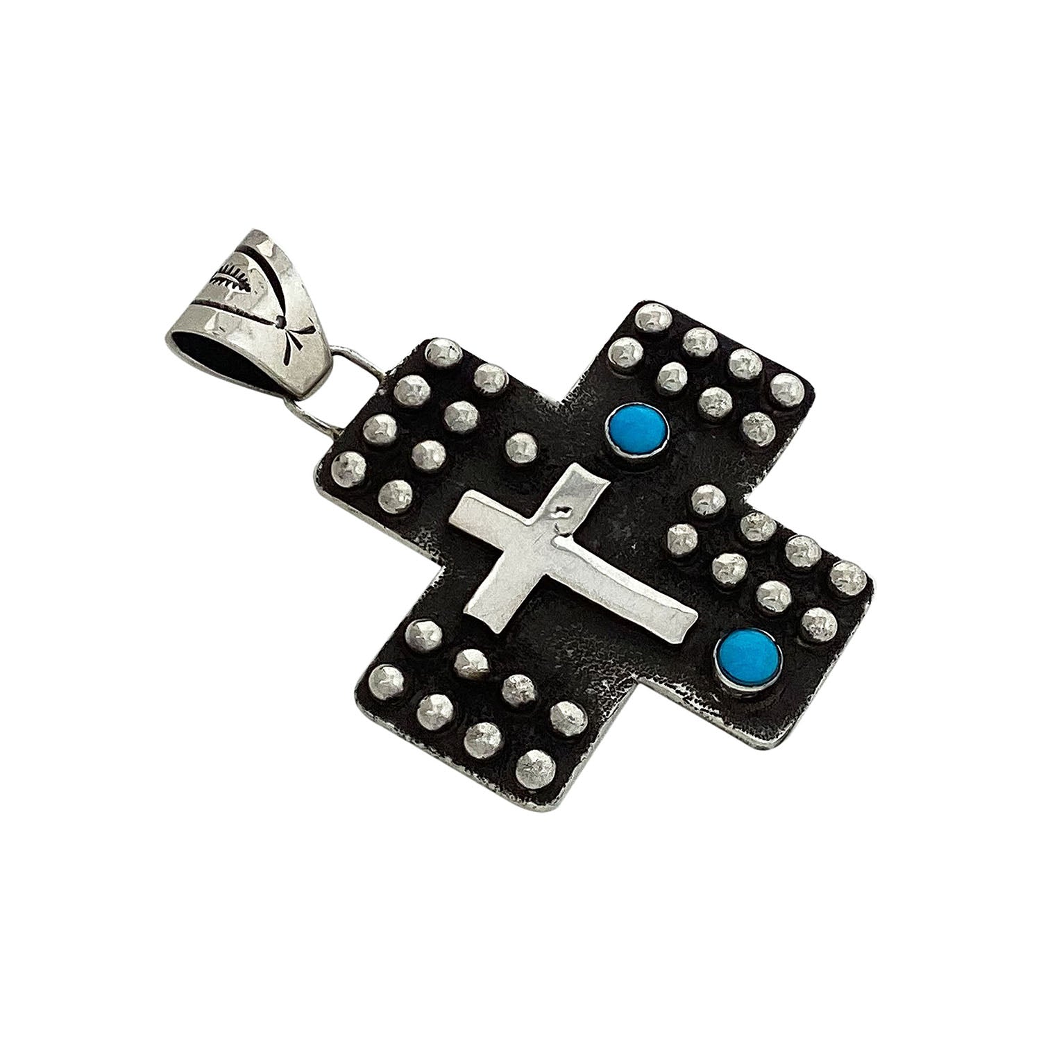 Navajo artist Ernest Rangel makes a cross pendant. The 2 1/2" length should tell you this is a good size creation. This pendant is filled with silver drops and another silver cross giving it a realistic look. He creates a cross using sand casting techniques and has two round kingman stones. Ernest gives the silver a rustic brushed finish that gives you that wonderful Southwest style. Check out the online Trading Post for more of his work.