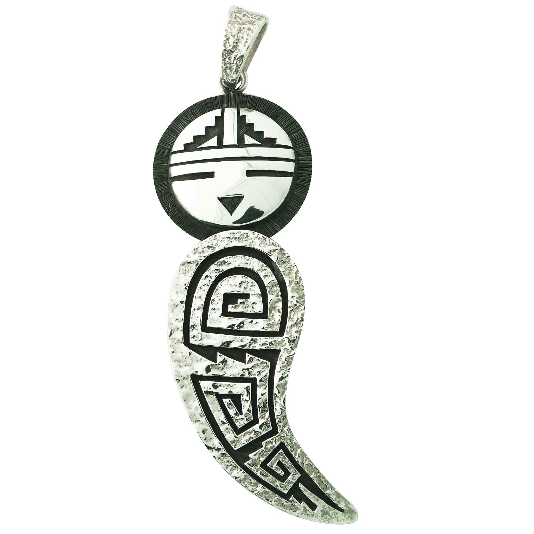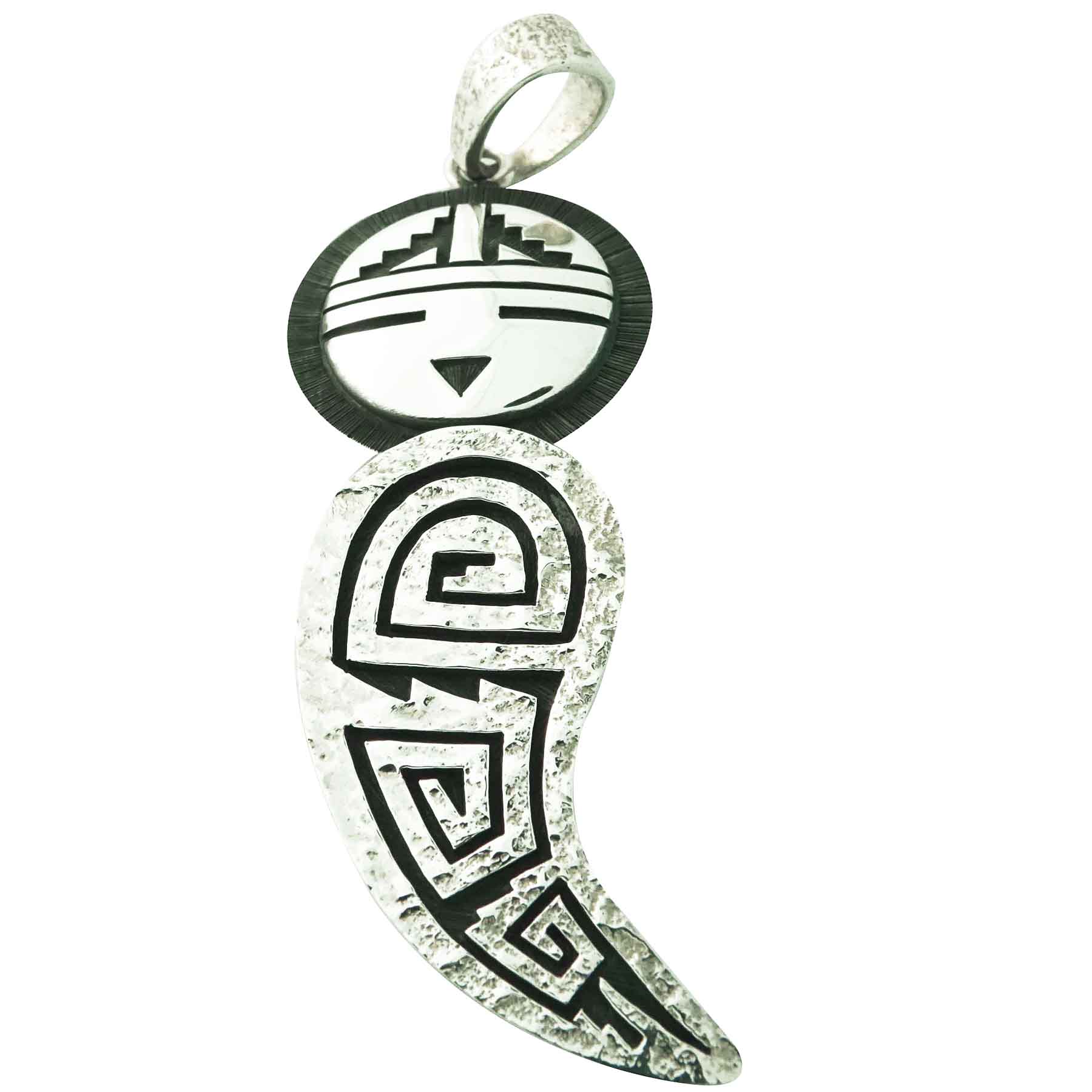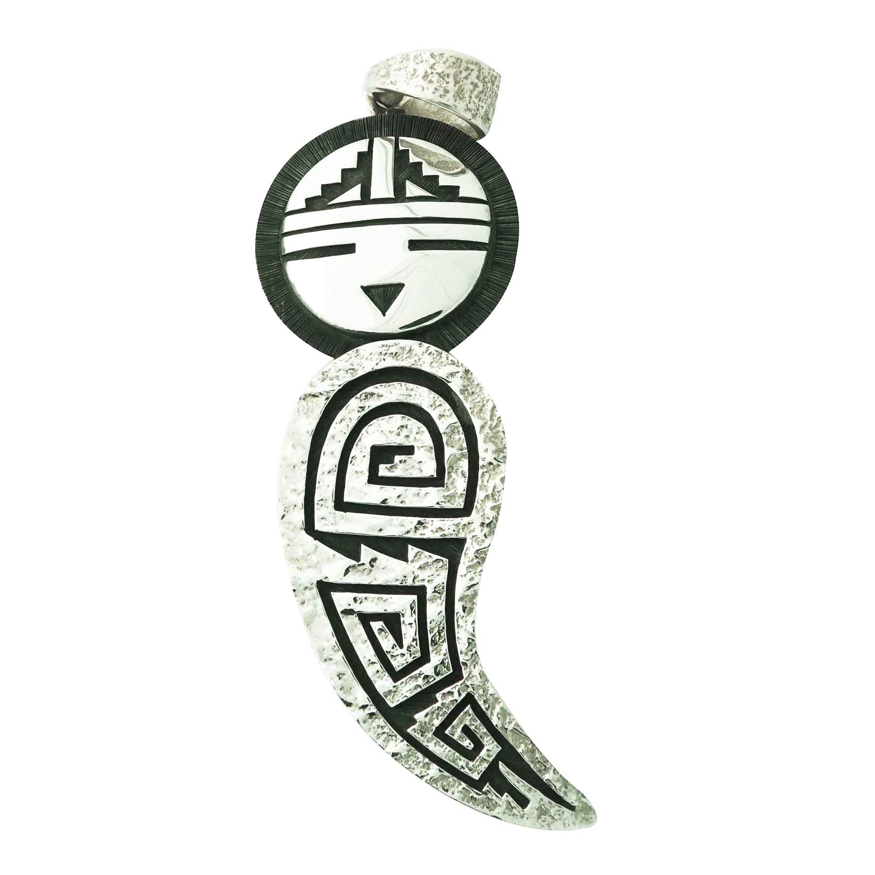 The overlay technique has been perfected by the Hopi over the last 90 years, and it is recognized as the Hopi style by many collectors. Hopi silversmith Ruben Saufkie does his overlay a little different. Instead of using two smooth piece of sterling silver plate. He will many times incorporate a tufa cast layer that gives his work an eye-catching texture. Much of his work will incorporate symbols of water that essential for life. This long and beautiful pendant represents an eagle wing with the surface. We have a handful of his pieces and have made a collection for you. You can pick between some fascinating cuffs and pendants. Each piece beautifully made with that incredible Ruben Saufkie style.