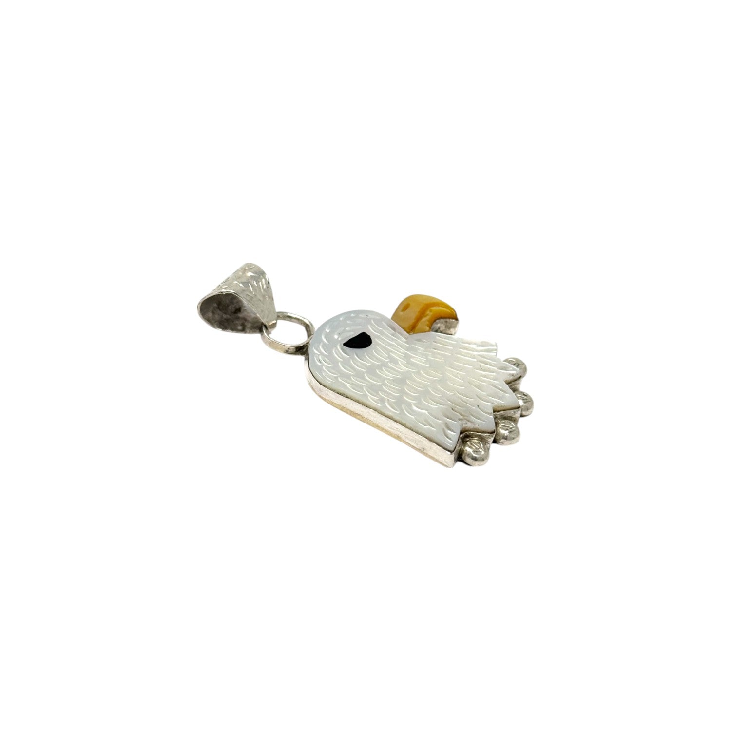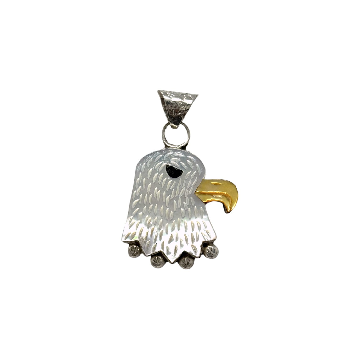 This striking pendant by renowned Zuni artist Darrell Shebola captures the spirit of the eagle, a powerful symbol of strength, vision, and protection. Handcrafted from sterling silver, the pendant showcases a bald eagle head design, intricately textured with hand stamped feather details that shimmer with depth. The beak is accented with a warm golden hue, adding contrast and enhancing the noble presence of the bird. Shebola incorporates a combination of stones to bring the design to life, including black jet for the piercing eye. The bottom of the pendant is adorned with round silver accents resembling talons, grounding the piece with traditional Zuni metalwork.