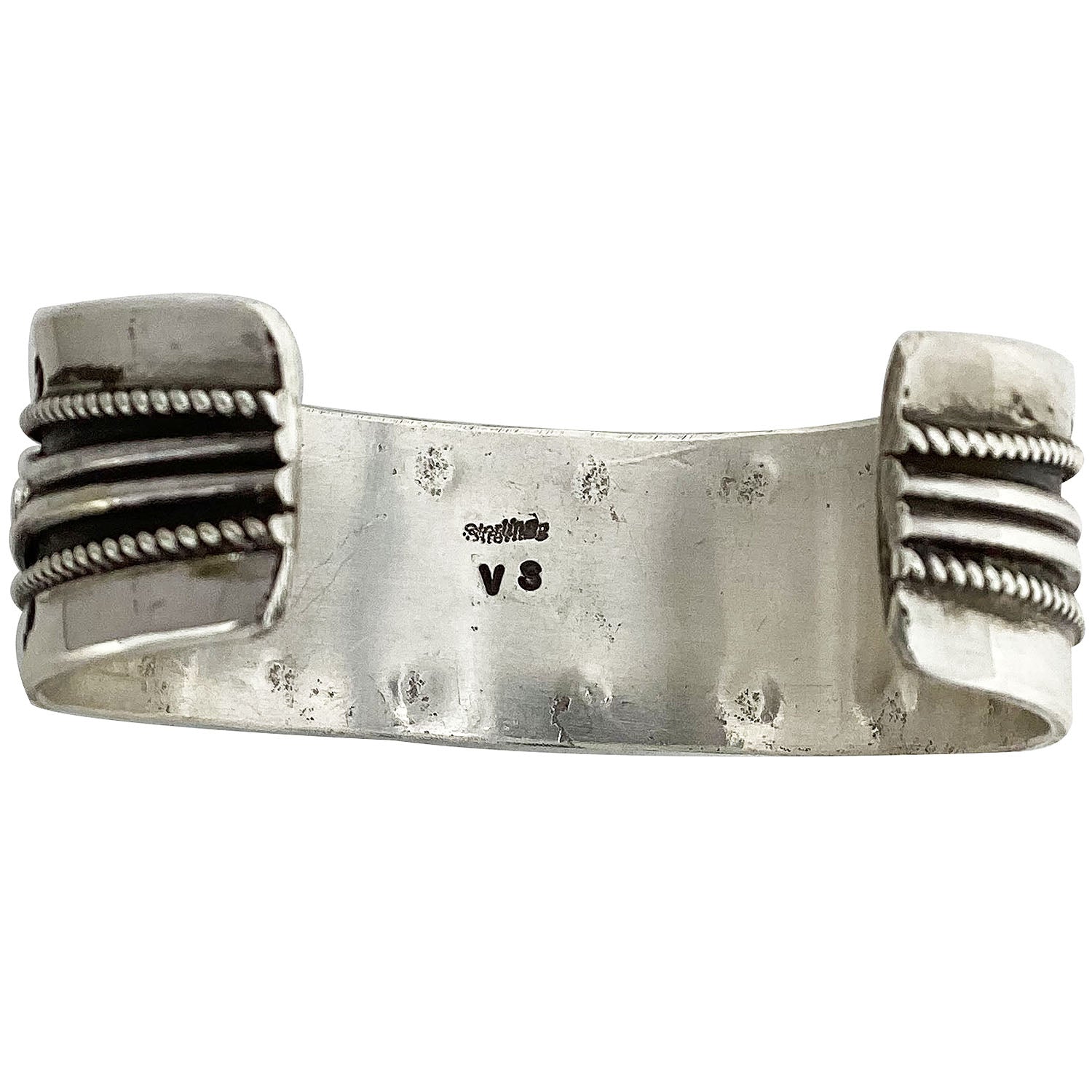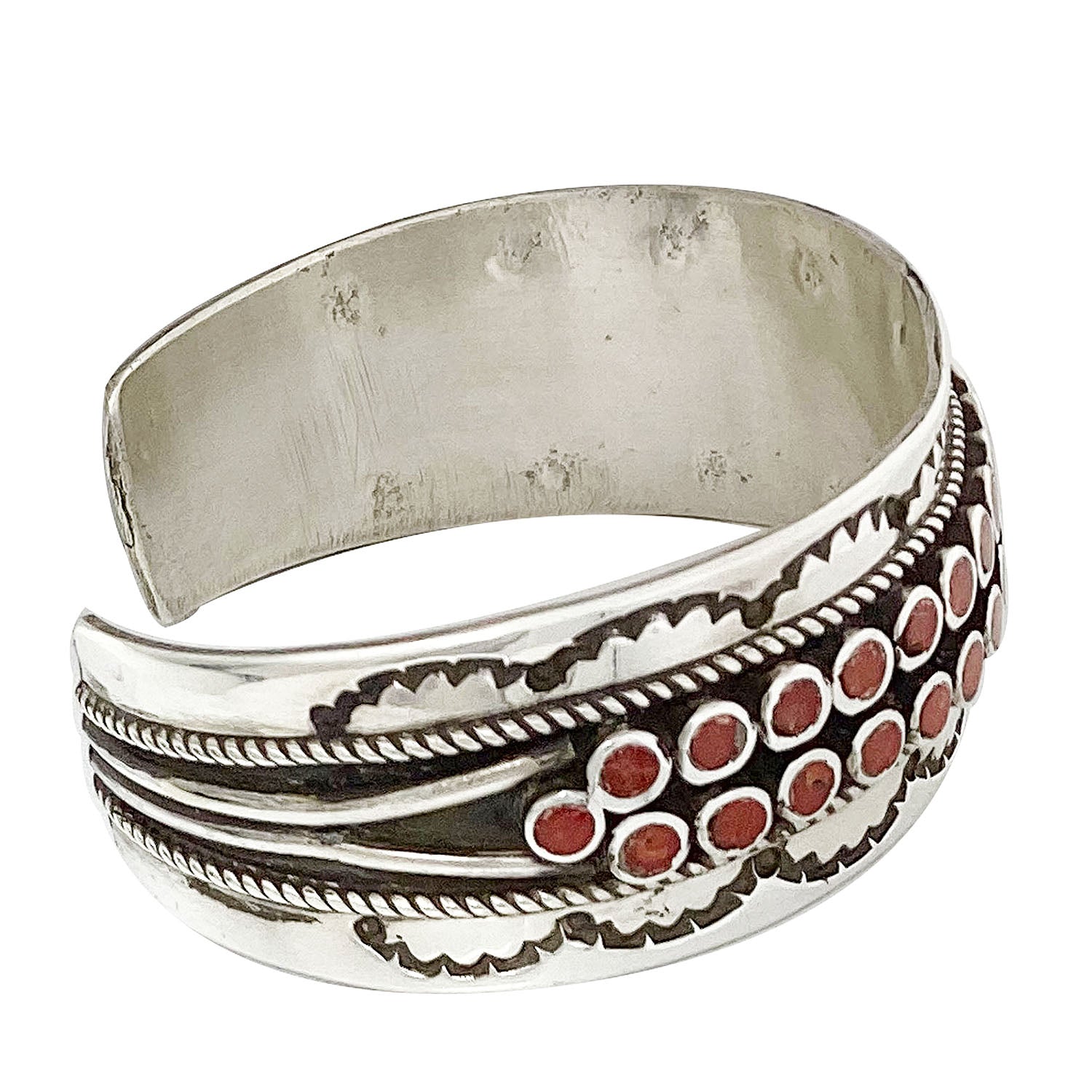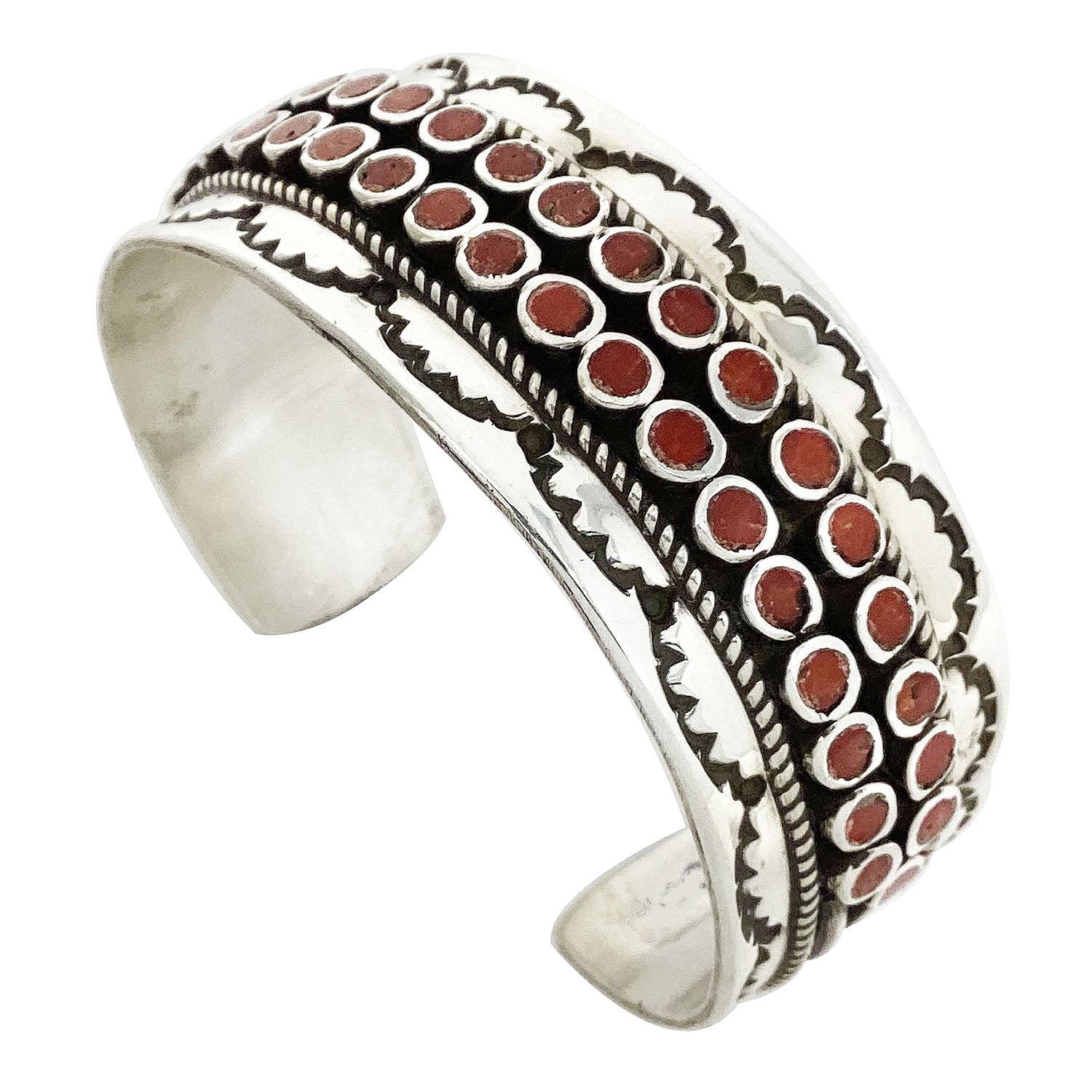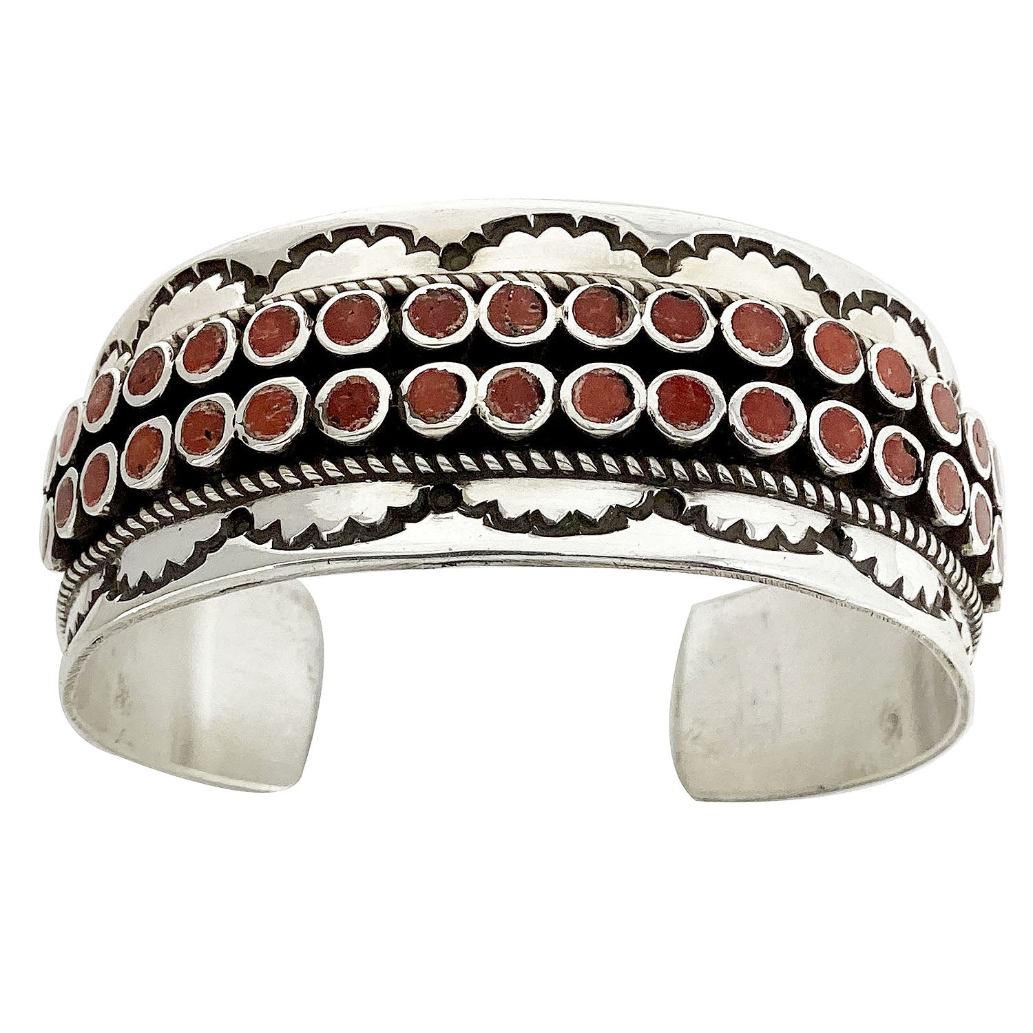 Navajo artist Vincent Shirley isn't afraid to fill his work with lots of stones. He takes a collection of Mediterranean Coral stones and inlays them into small round settings. A total of 38 coral pieces fills this bracelet. You will notice that the two-row bracelet takes on a contrast in silver color that combines a mirror shine along with a dark oxidized background. You really notice the red vibrant stones against that shine. Vincent uses a stamped border to complete the cuff. We have other pieces by Vincent on the online Trading Post, each with its own unique look.