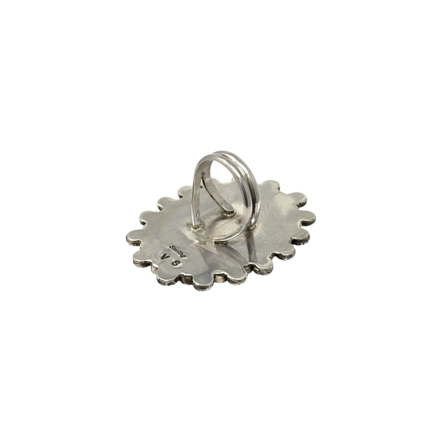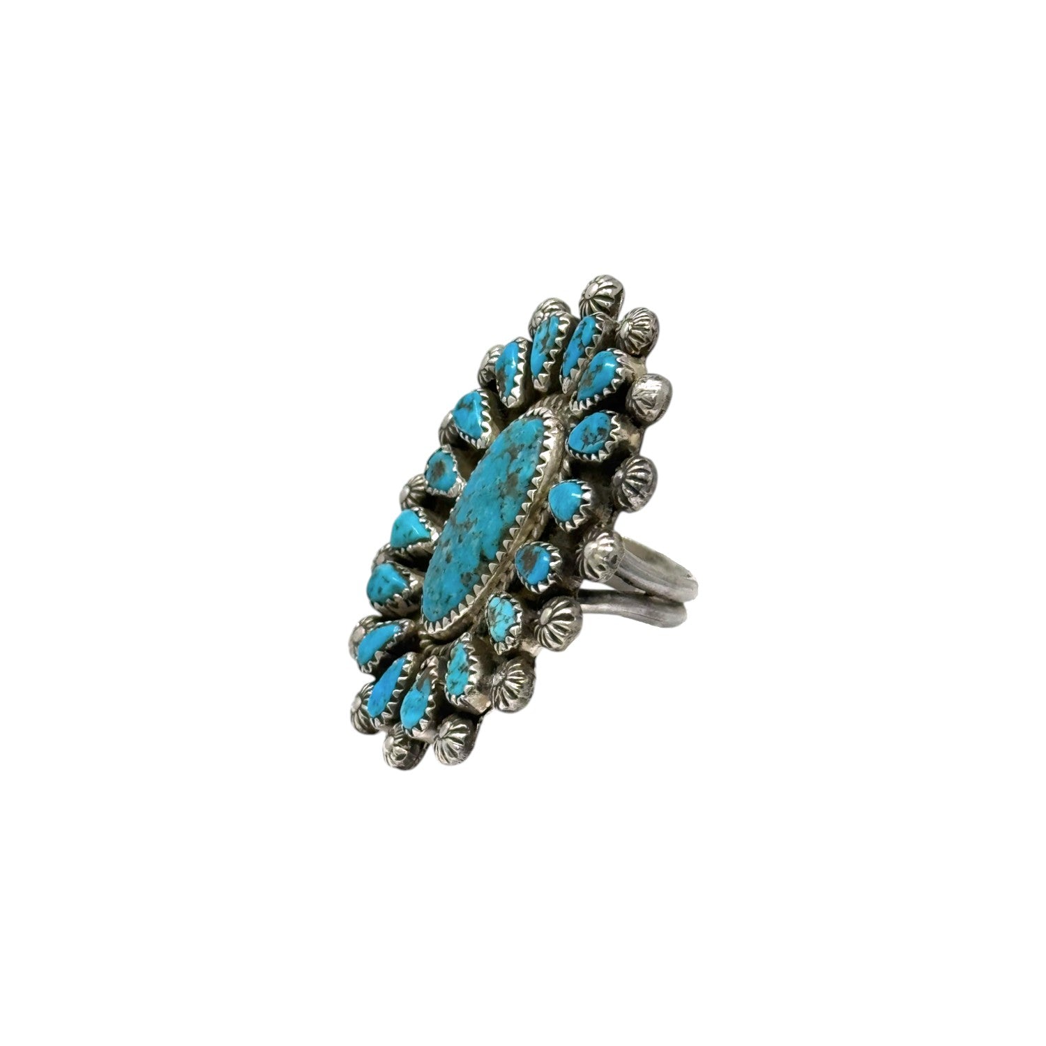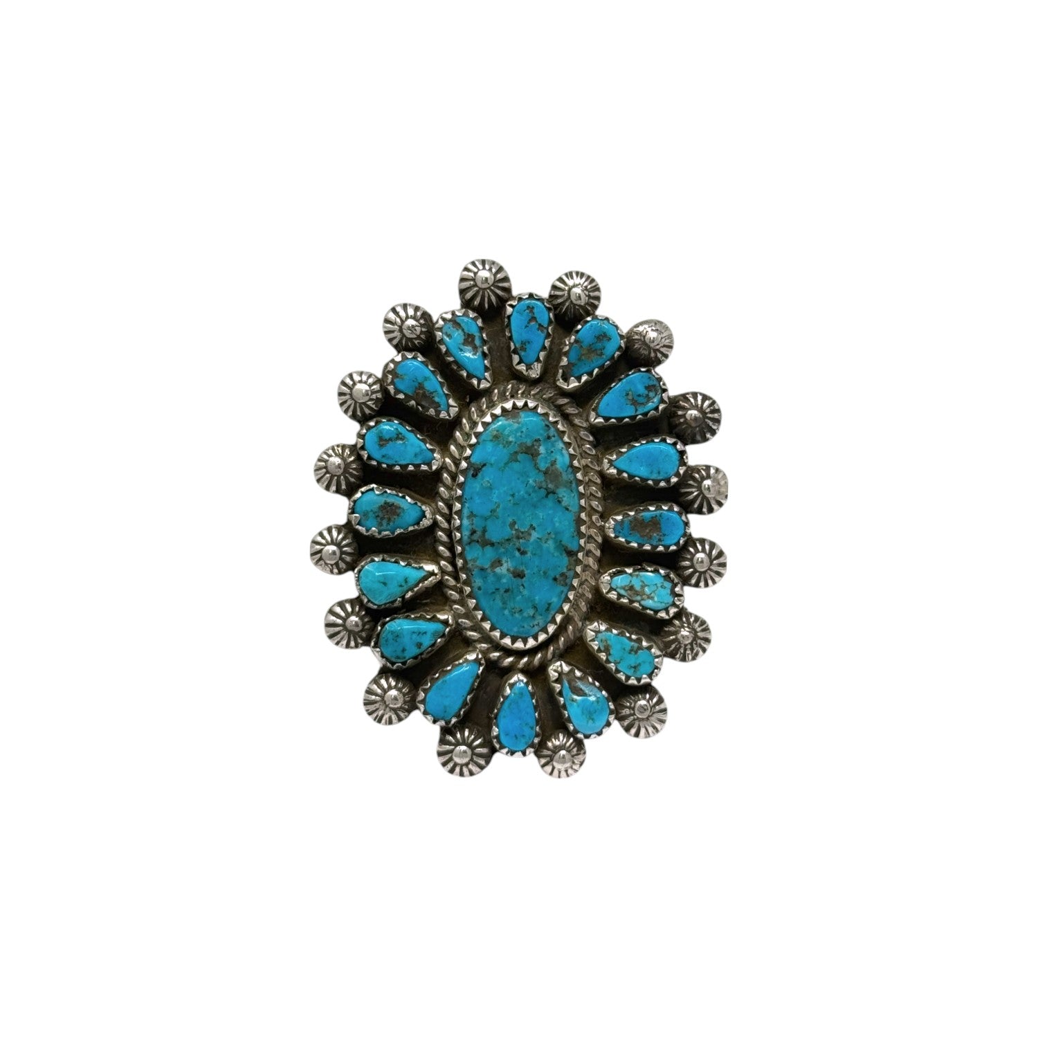 This exquisite ring by Navajo artists Vincent & Genevieve Shirley showcases the timeless beauty of Kingman turquoise in a radiant sunburst design. At its heart lies a bold oval cabochon, surrounded by meticulously hand cut teardrop stones, each set in hand twisted sterling silver bezels. The silverwork is further accented with hand stamped sun rays, bringing dimensional elegance and cultural symbolism to the piece. Masterfully handcrafted, this ring reflects the Shirleys’ exceptional skill in cluster work, a celebrated Navajo jewelry tradition.