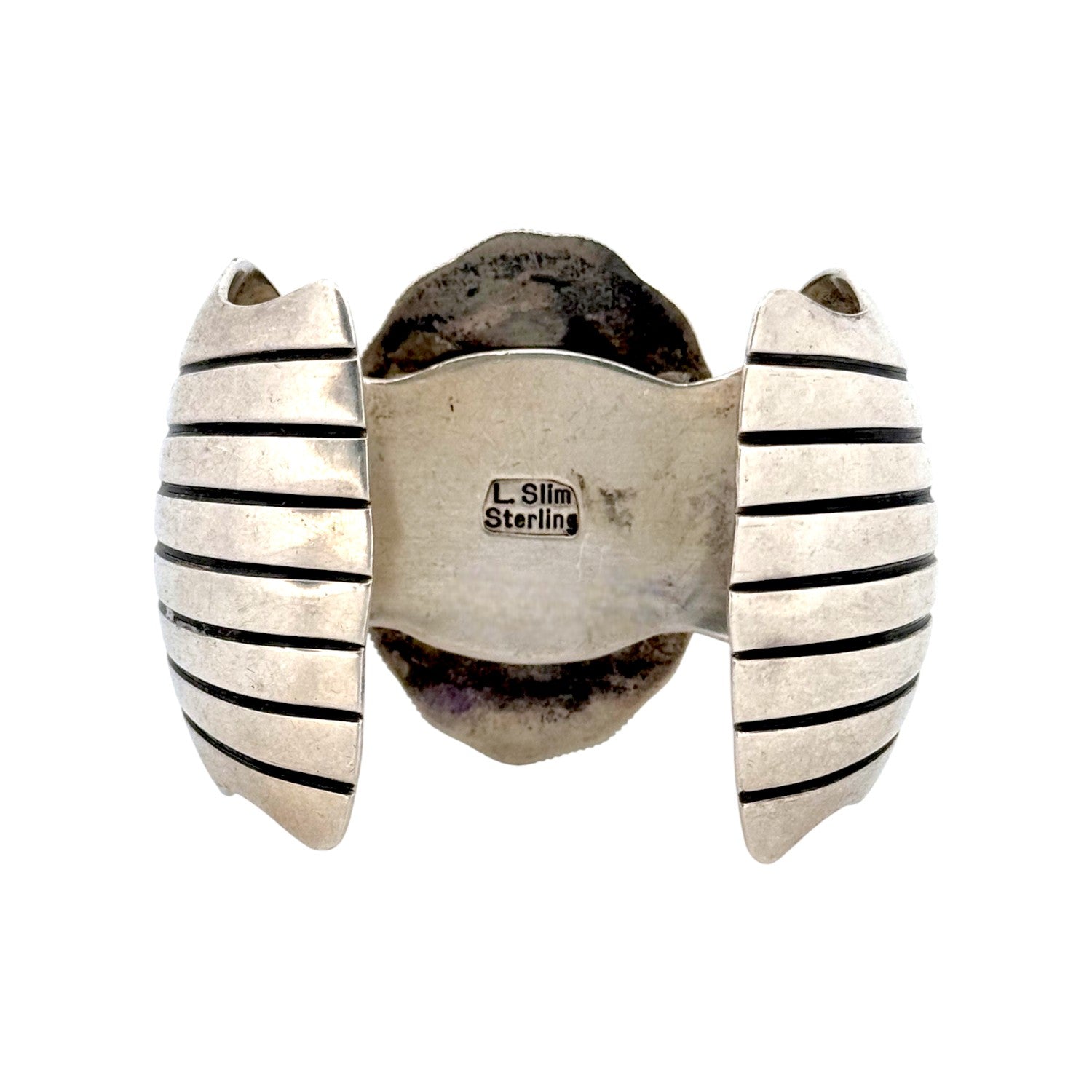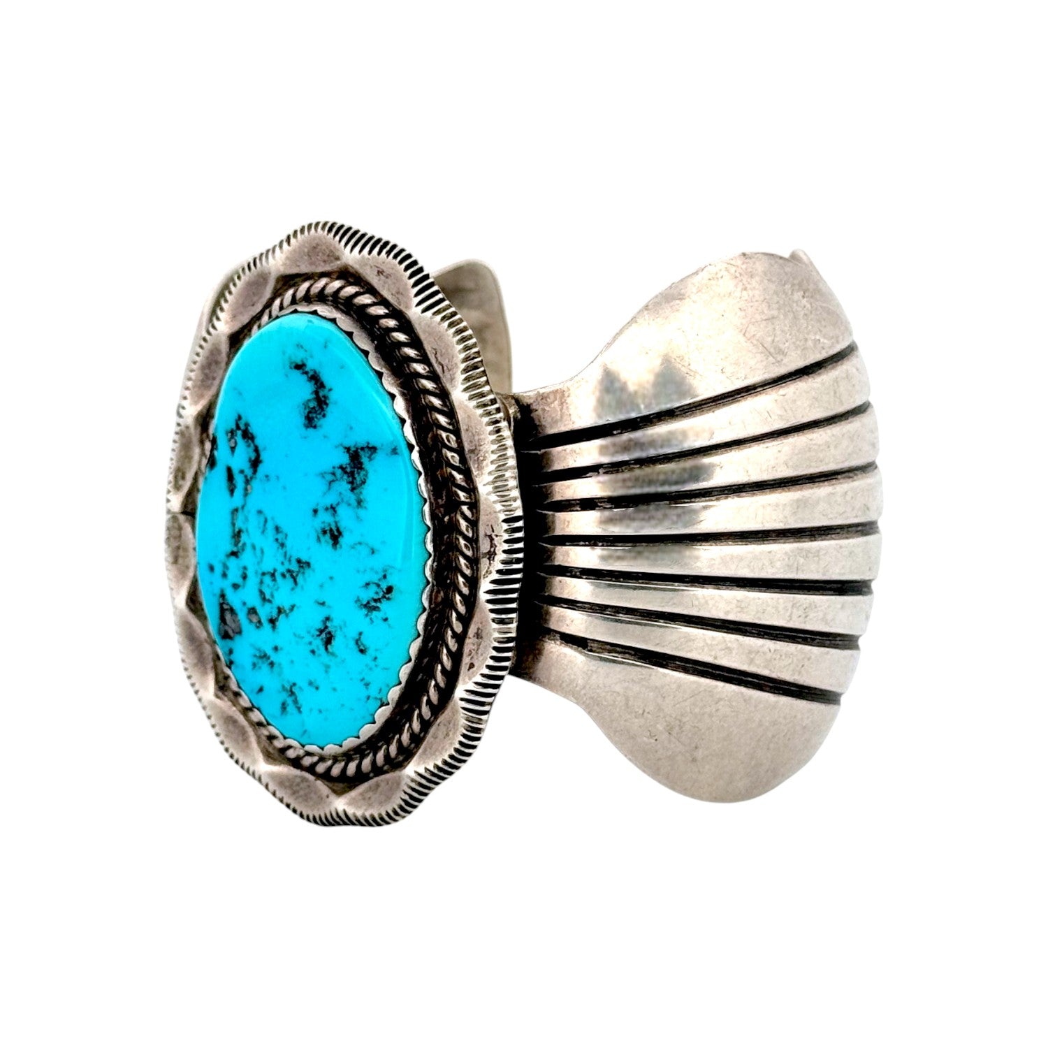 This vintage Navajo bracelet by Stan Slim, circa 1990s, is a remarkable showcase of traditional silversmithing and natural beauty. Handcrafted in sterling silver, the cuff features a large oval Lone Mountain Turquoise stone, prized for its vibrant blue color and distinctive matrix. The stone is framed in a bold, hand-stamped bezel with twisted rope and scalloped detailing, adding depth and texture to the design. Strong silverwork radiates outward with clean, linear stamp patterns along the cuff, highlighting the balance of strength and elegance. The weight and craftsmanship reflect Stan Slim’s signature style, blending classic Navajo tradition with striking presence. As a vintage piece, it carries both historical and cultural significance, representing decades of artistry.