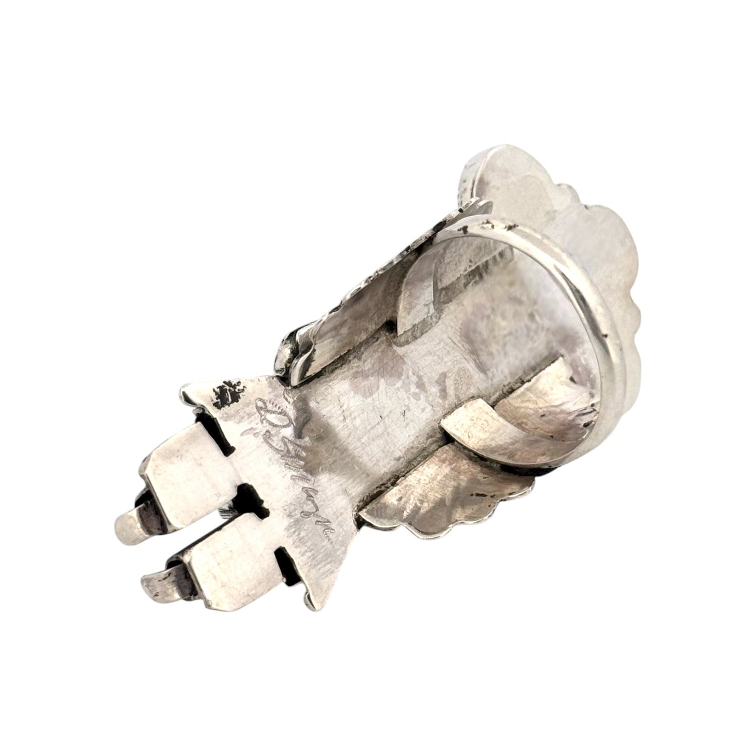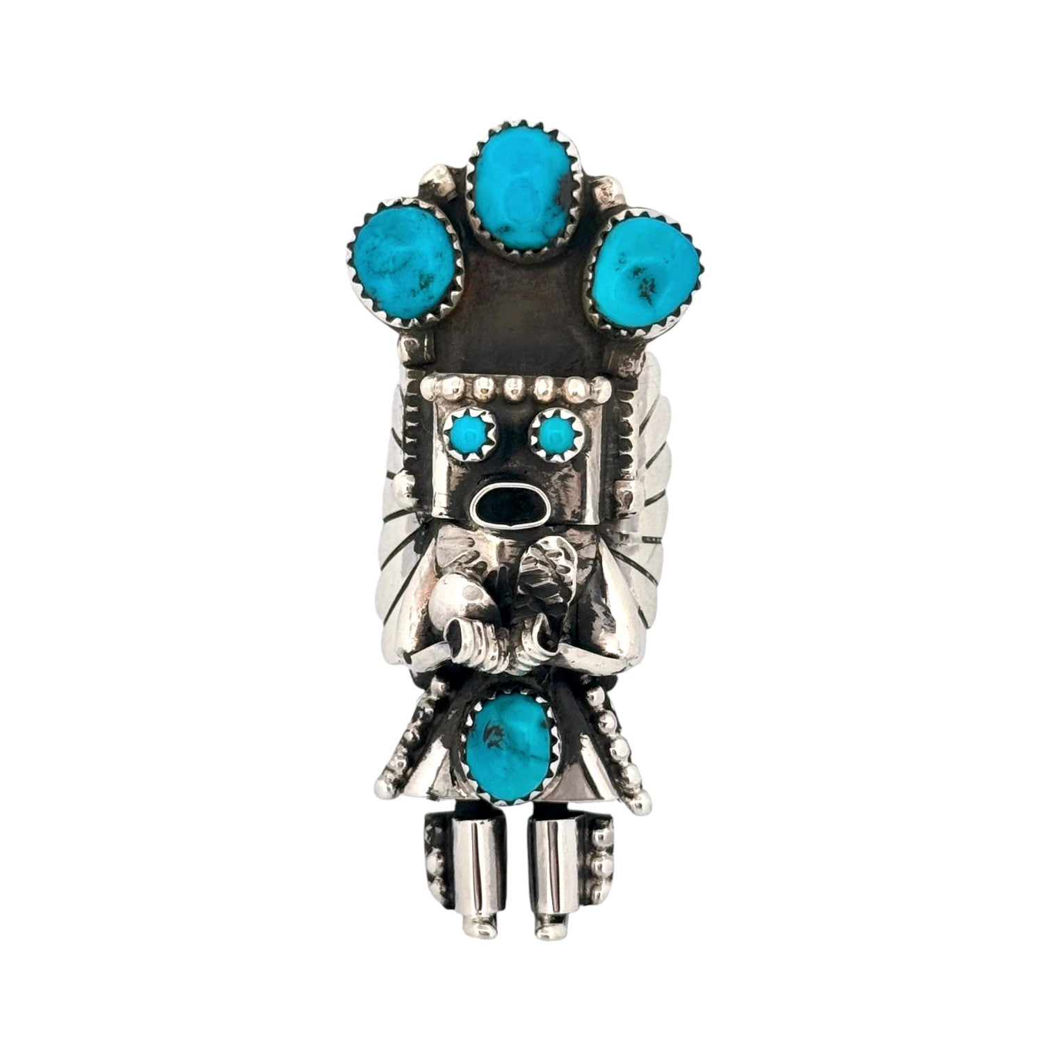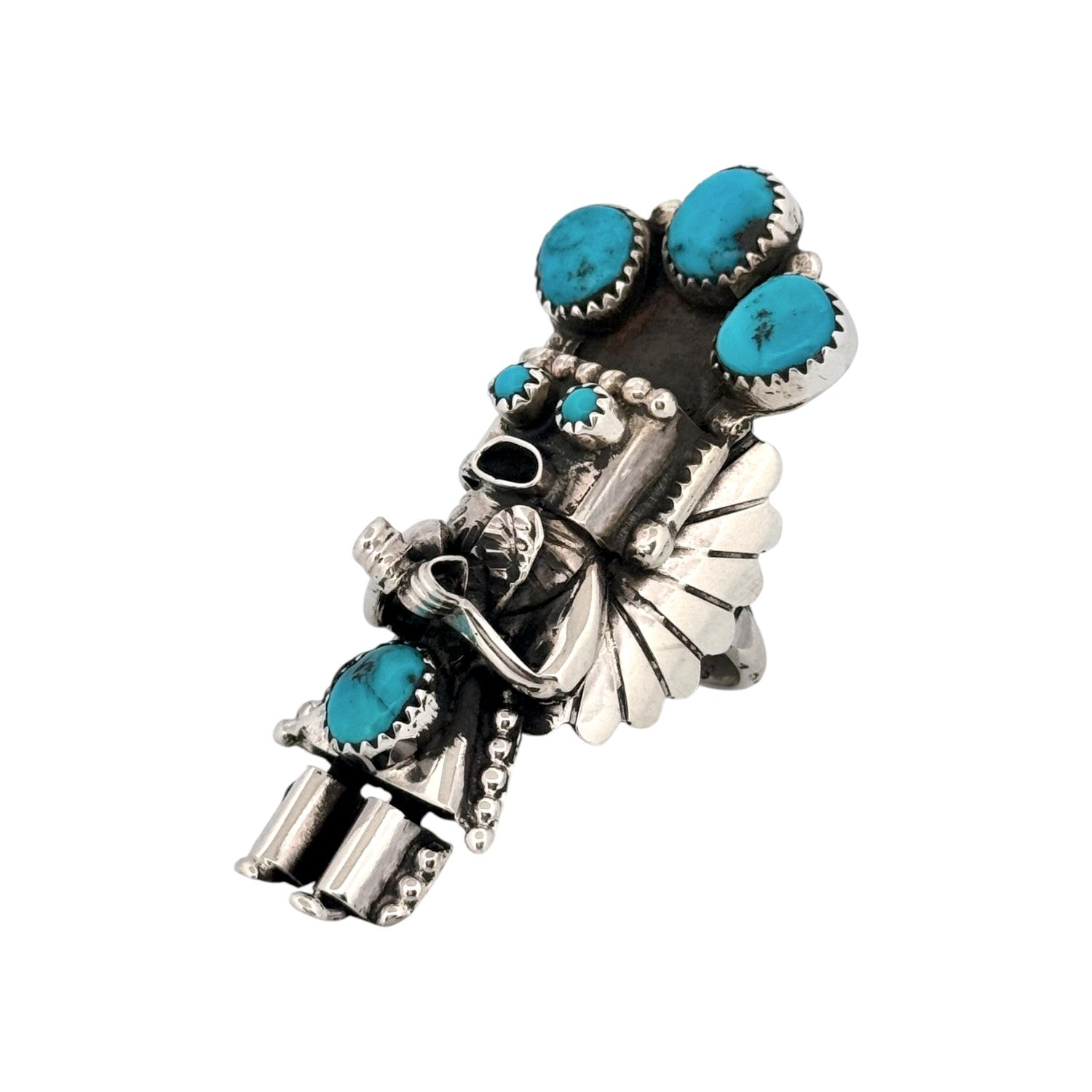 Expertly handcrafted by Navajo artist Doris Small Canyon, this Nevada Blue Turquoise ring is a remarkable fusion of artistry, tradition, and cultural symbolism. The ring showcases a dynamic Kachina inspired design, adorned with brilliant Nevada Blue Turquoise cabochons that shimmer with natural matrix and sky-blue brilliance. Each stone is hand-set in polished sterling silver, surrounded by intricate detailing that brings this spiritual figure to life. The design honors the sacred relationship between nature, spirit, and artistry that defines Navajo silversmithing. Every element from the delicate silverwork to the expressive form reflects Small-Canyon’s deep reverence for her heritage and creative mastery.