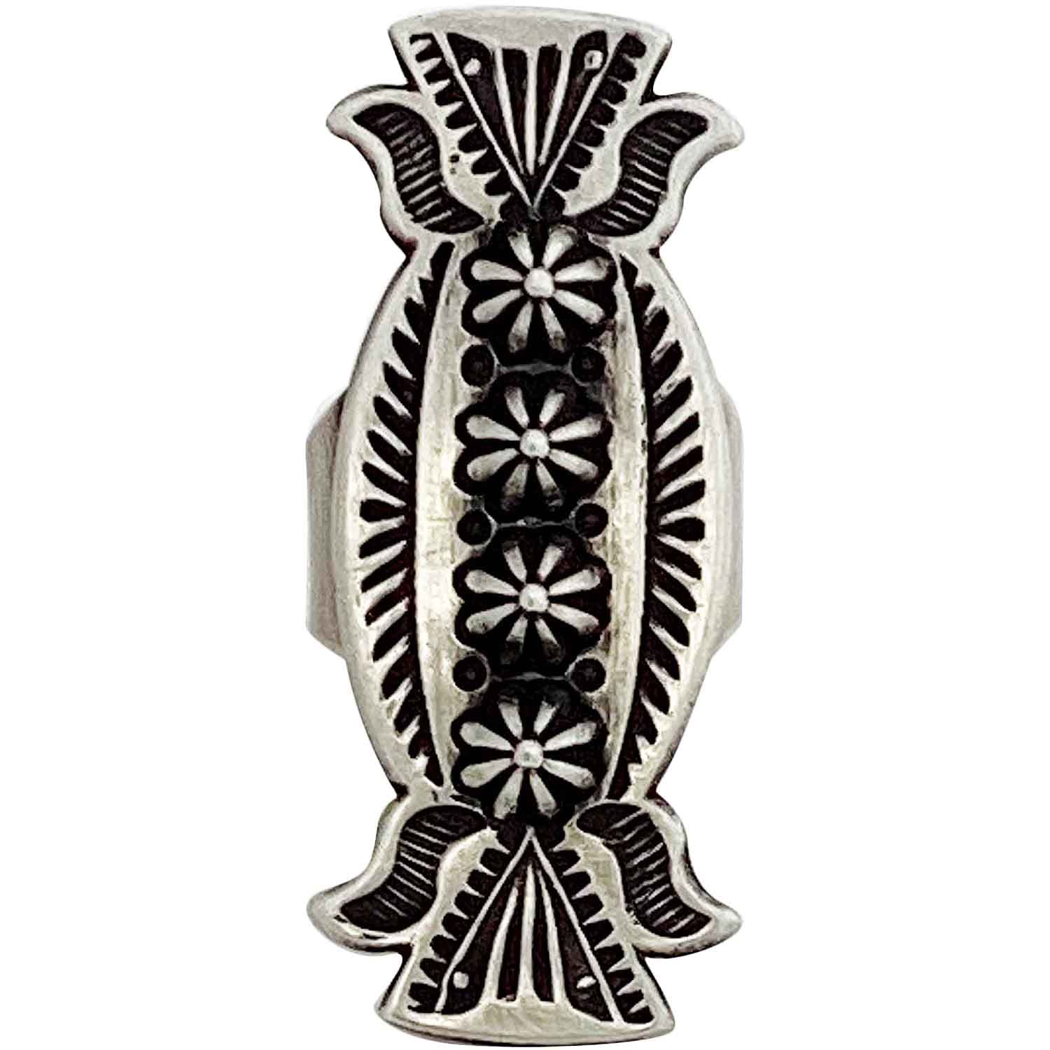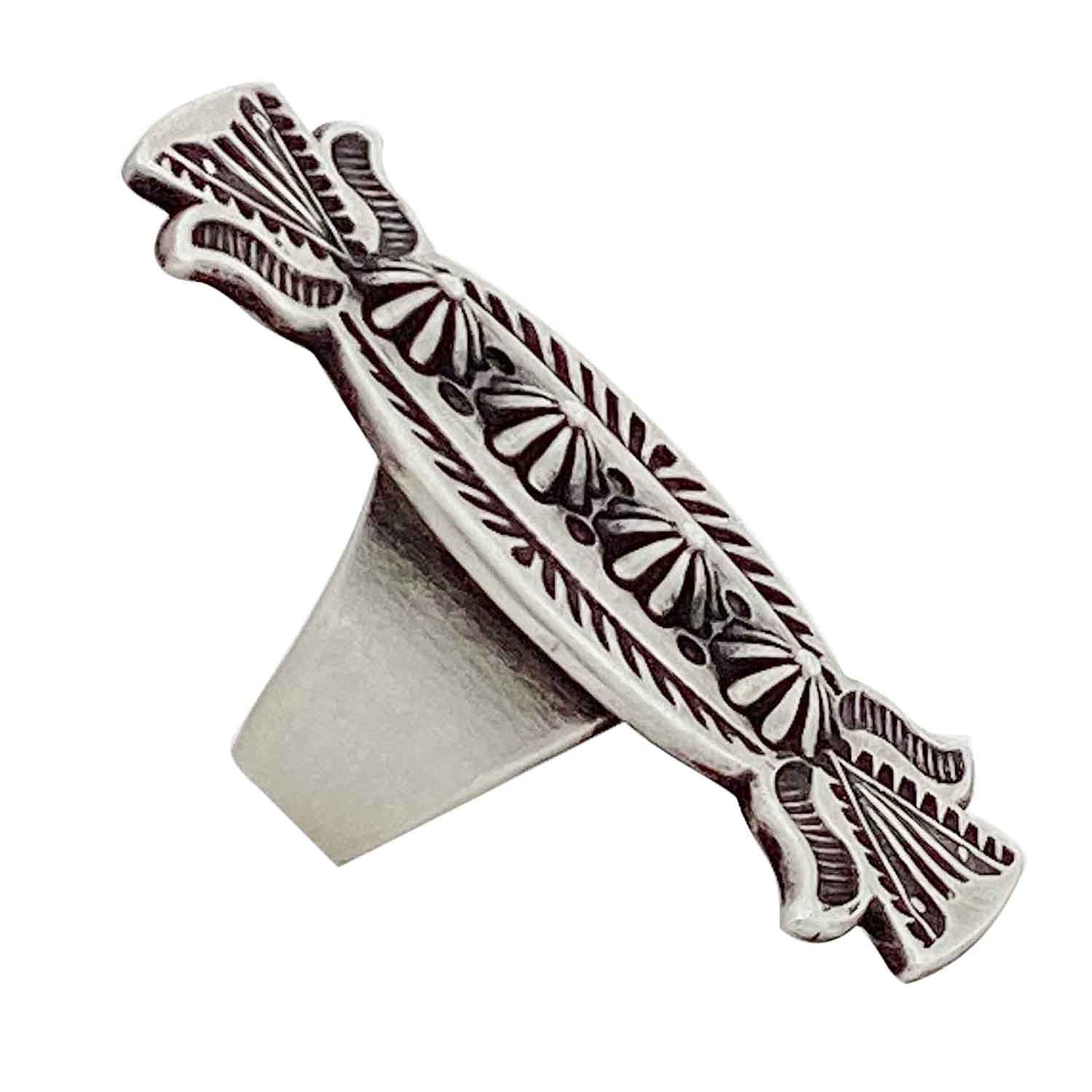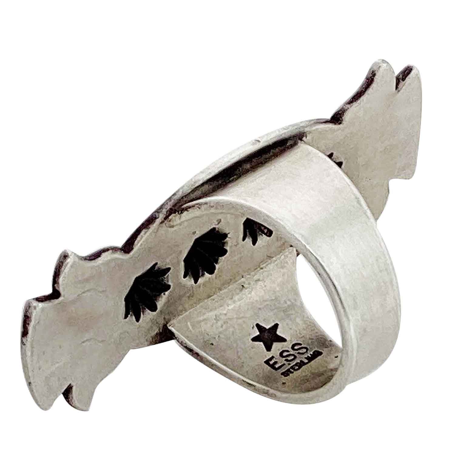 This bug inspired ring is a stunning piece of silver. Navajo artist Edison Sandy Smith made this spectacular revival style ring. Edison usually brings the Trading Post band style rings with bumpouts along the narrow design. This ring is completely different and filled with incredible character. I don't know if he was trying to create a bug, but the silver has taken on a grasshopper look. Edison uses a row of bumpouts and surrounds them with his legendary stamp work. The band is an easy wearing tapered design. If you are looking for something different then you have found it.