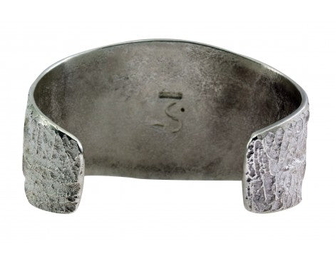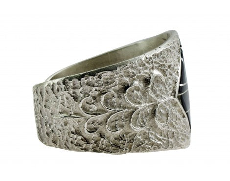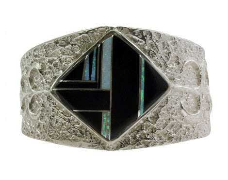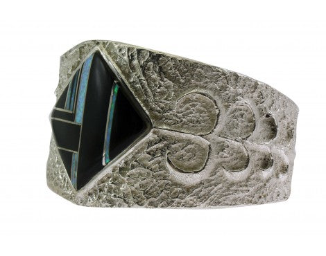 Navajo artist Stewart Billie is showcasing two talents on this beautiful cuff. The center of the bracelet is filled with a black jet and synthetic opal combination that has been done with a channel inlay technique. Stewart has done the inlay design and a eye catching diamond shape. The bracelet is a tufa stone textured finish that has been given a mirror shine. You will enjoy the combination of traditional tufa and contemporary inlay. We have other pieces by Stewart on the online Trading Post.