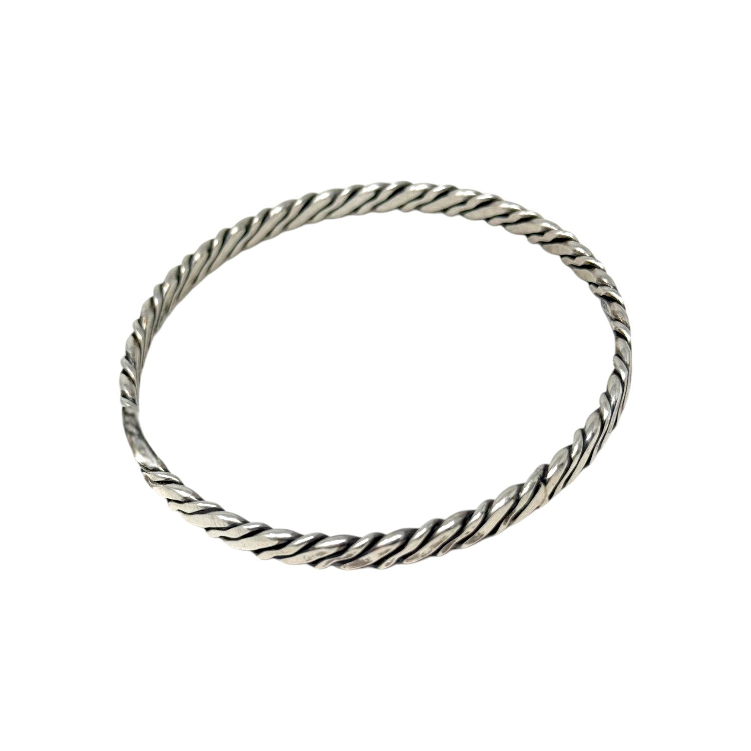 This sterling silver bracelet by Verna Tahe is a stunning example of Navajo artistry and tradition. Handcrafted with precision, the bracelet features a beautifully twisted rope design that symbolizes strength, unity, and interconnectedness. The high-polished silver catches the light, giving it a timeless elegance that can be worn for both everyday style and special occasions. Each curve of the braid reflects the skill and care that goes into Navajo silversmithing, carrying on a legacy of craftsmanship passed down through generations. Lightweight yet durable, this piece offers both comfort and sophistication. Its minimalist design makes it a versatile accessory that pairs well with other jewelry or stands strong on its own.