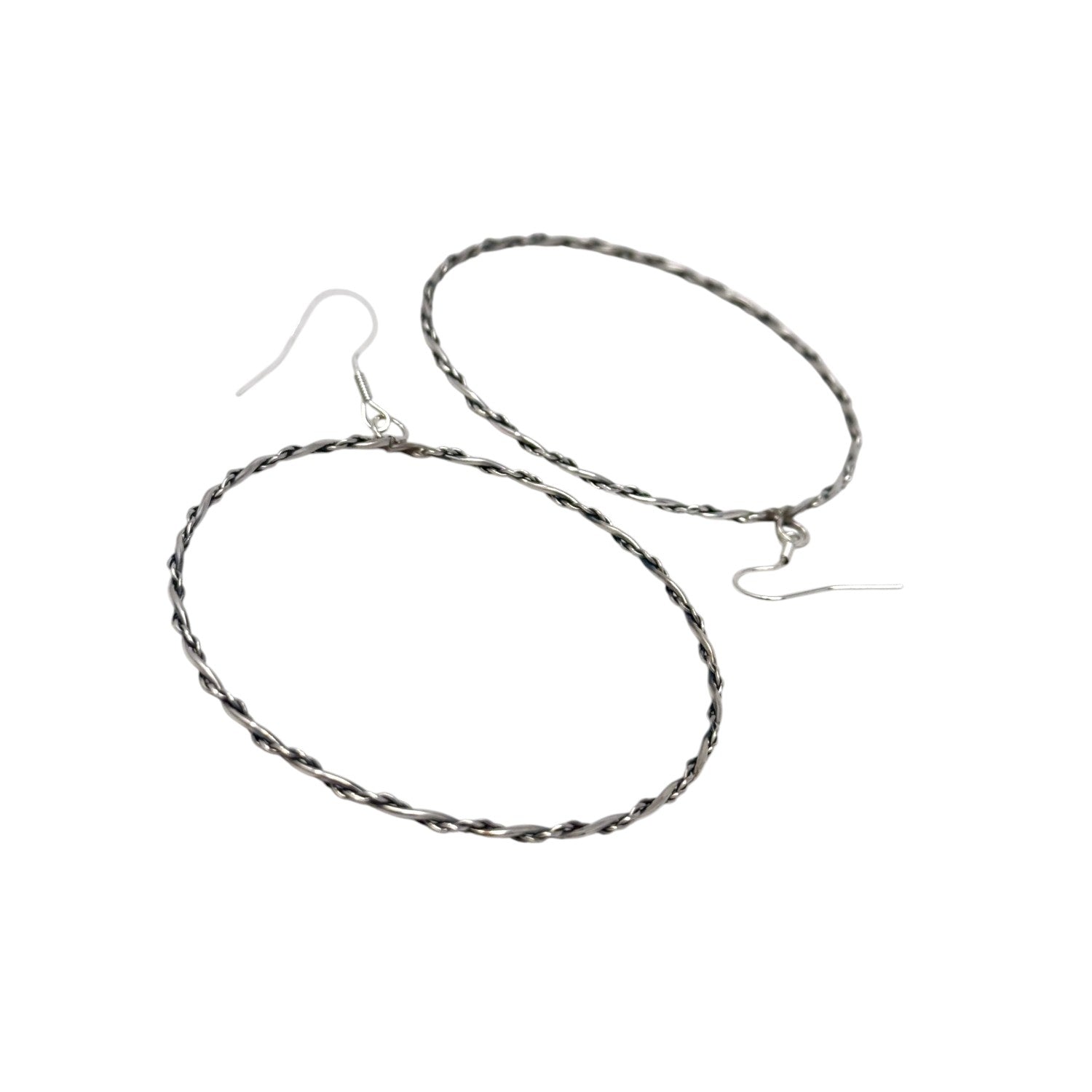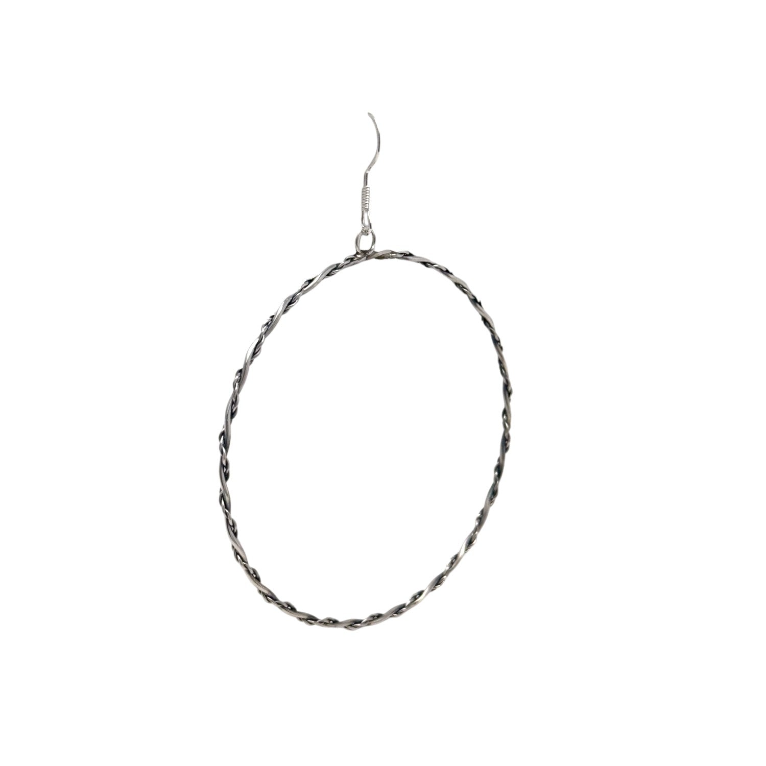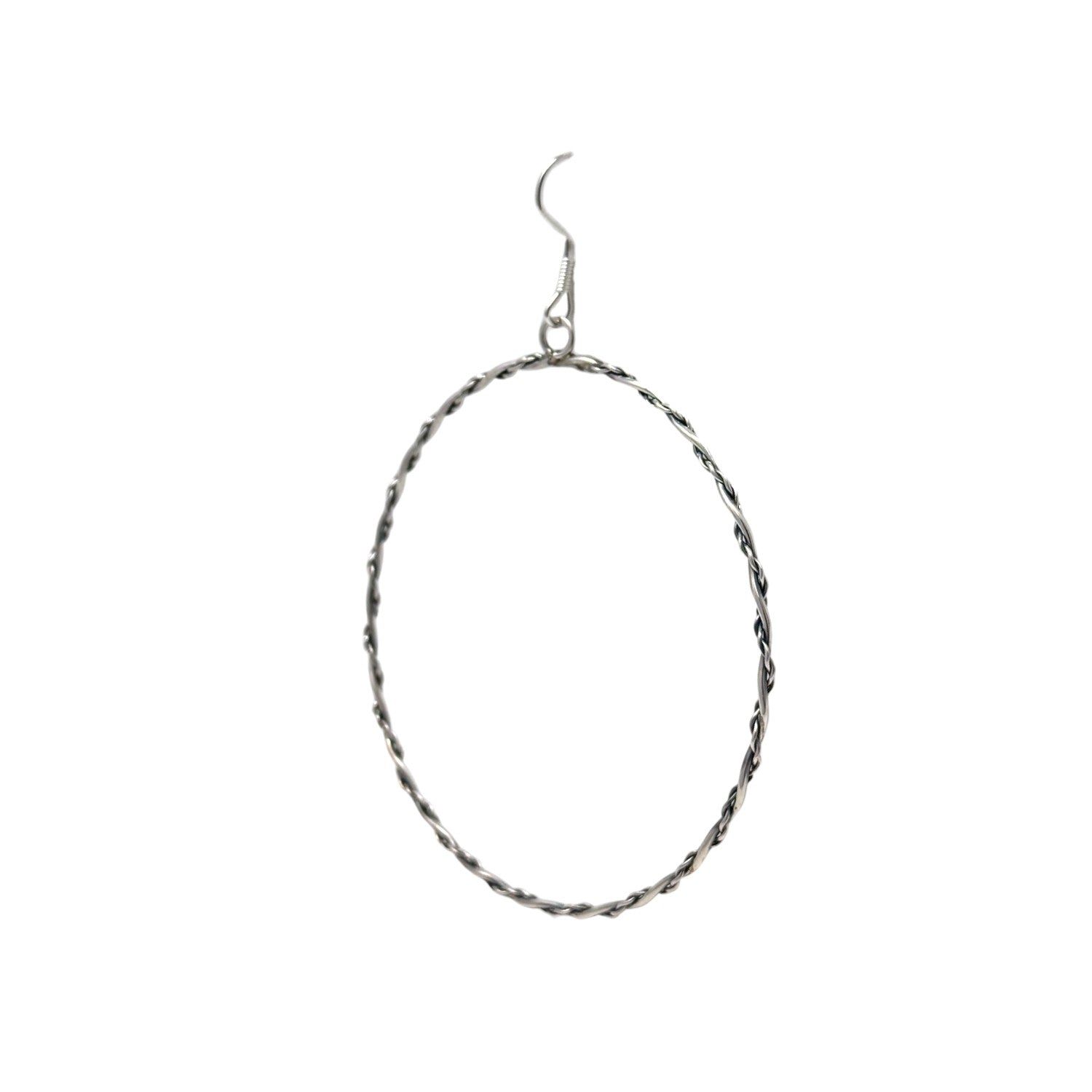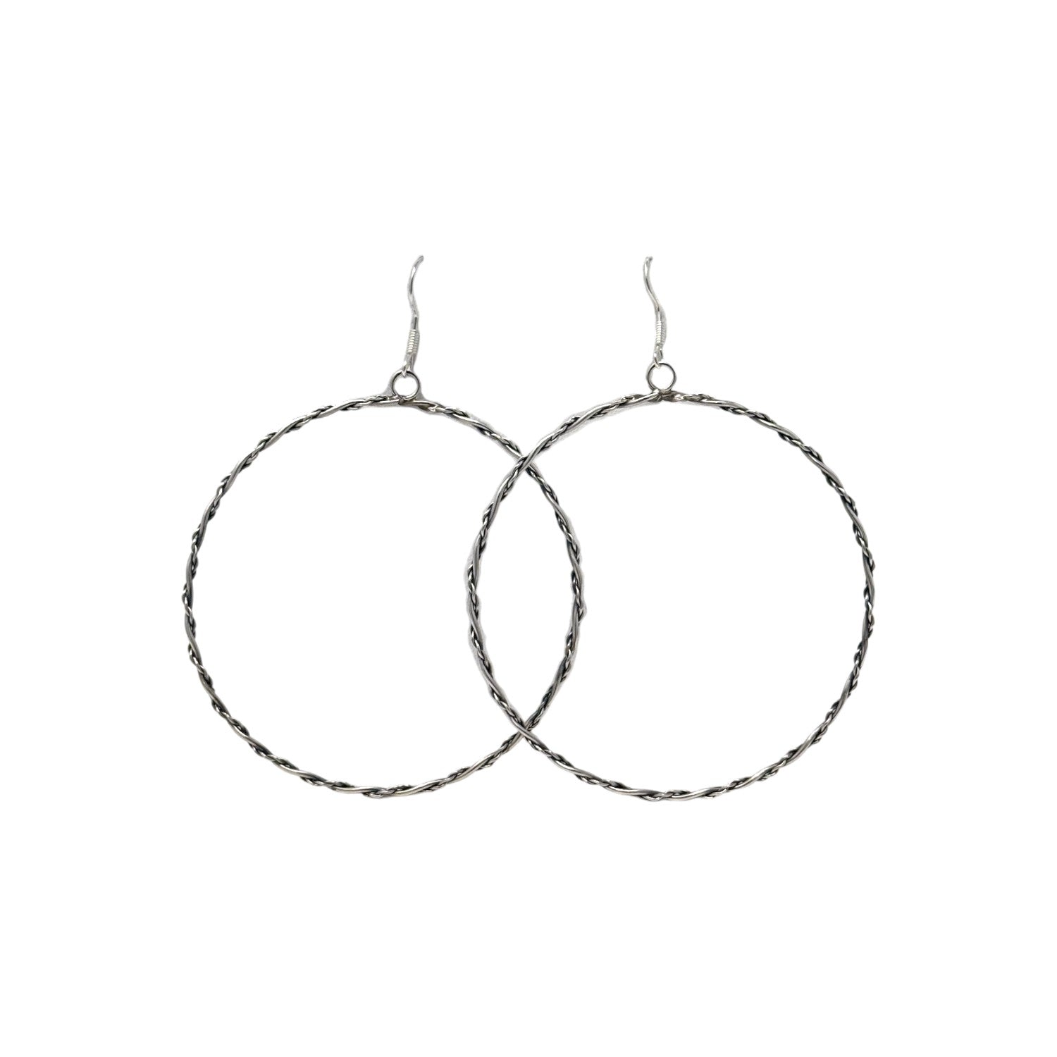 These sterling silver earrings by Navajo silversmith Caroline Tsosie are a timeless expression of elegance and tradition. Designed in a classic hoop form, each earring is crafted from twisted silver, creating a subtle texture that catches the light with every movement. Lightweight and versatile, they are comfortable for everyday wear while still offering a refined presence for special occasions. The circular design carries deep cultural symbolism, often representing unity, harmony, and the cycles of life in Native tradition. Handmade with precision, these earrings reflect the artistry and skill passed down through generations of Navajo silversmiths.