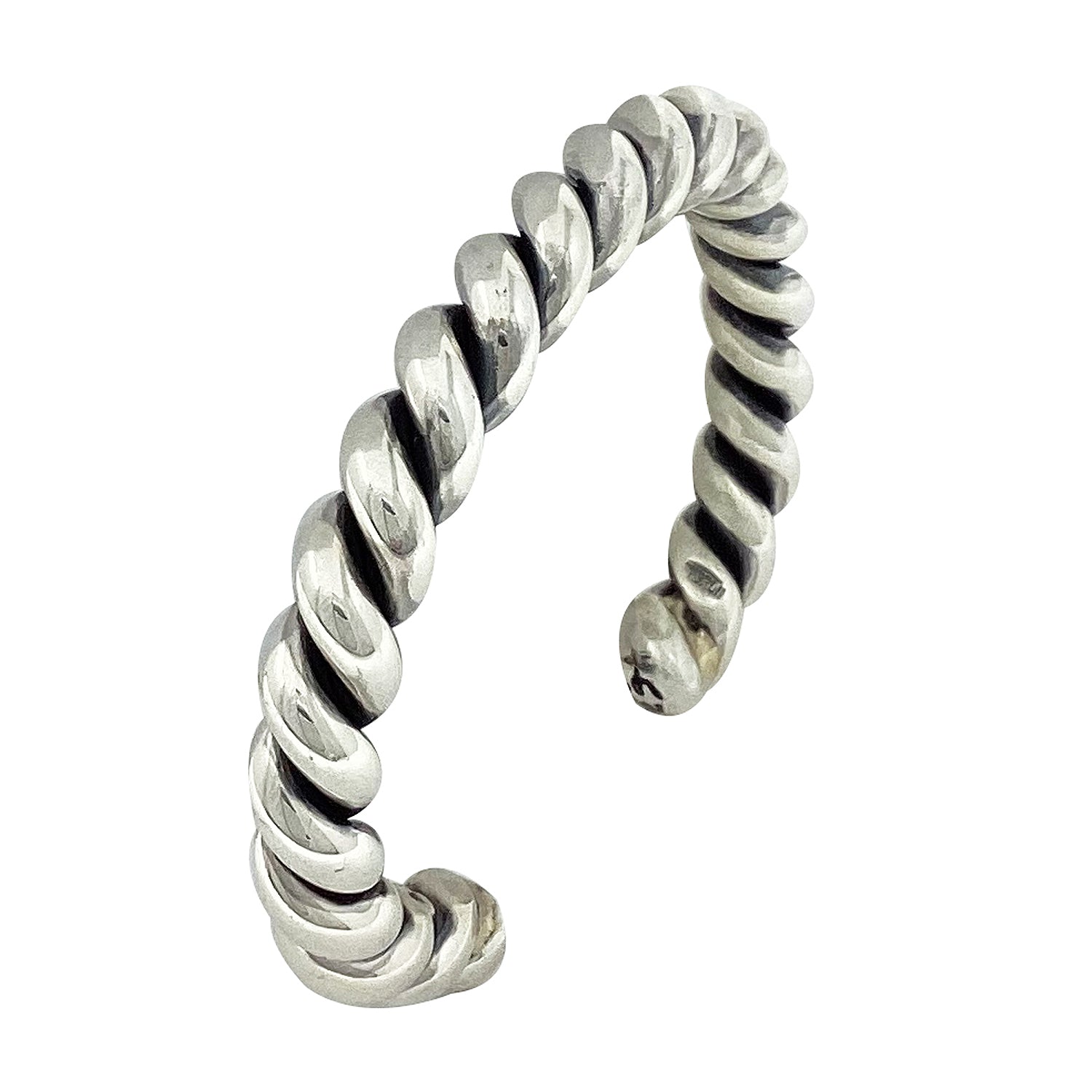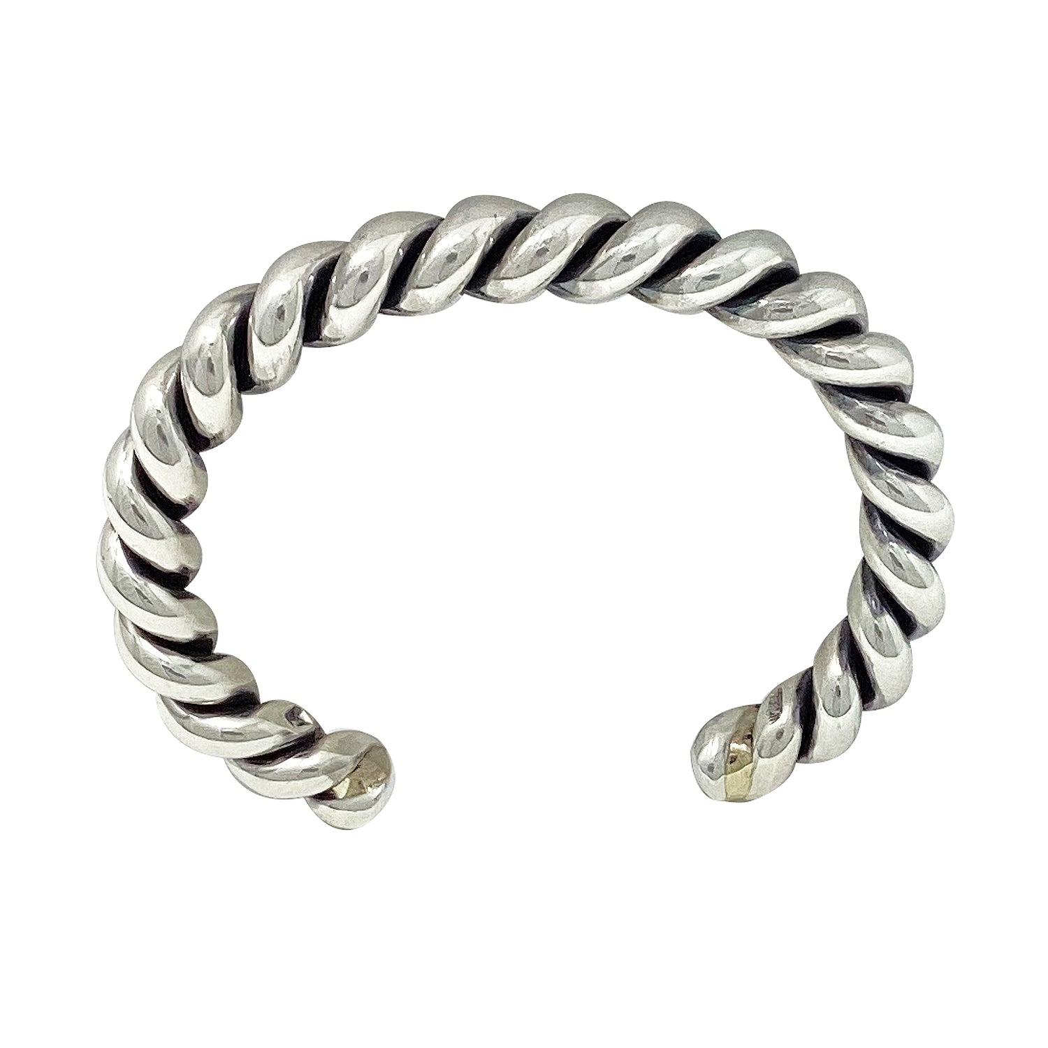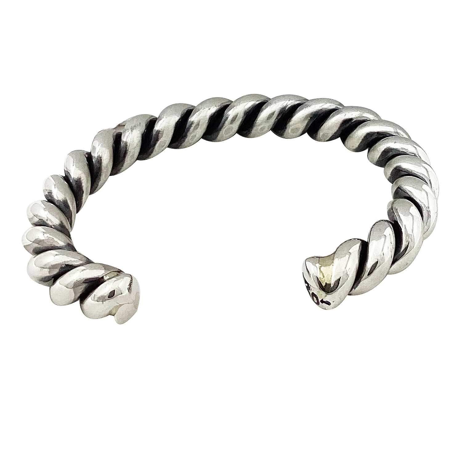 Many times, the best pieces of silver are the simple ones. Navajo silversmith Caroline Tsosie has taken two very thick pieces of sterling silver round wire and twisted them. She then gives the heavy sterling silver a mirror shined finish, that's it. This beauty will be an everyday piece, and just in case you want more of these great cuffs we have more.