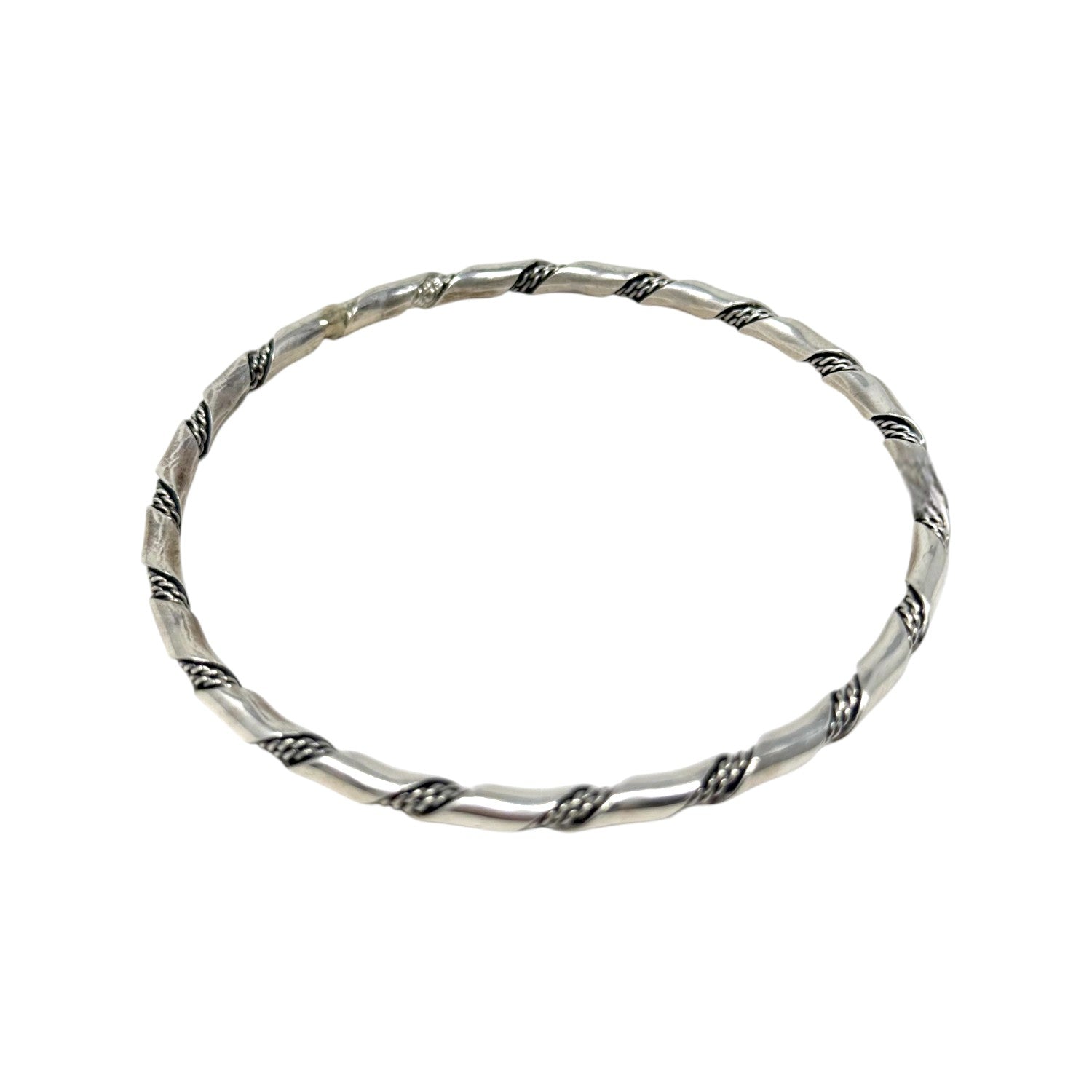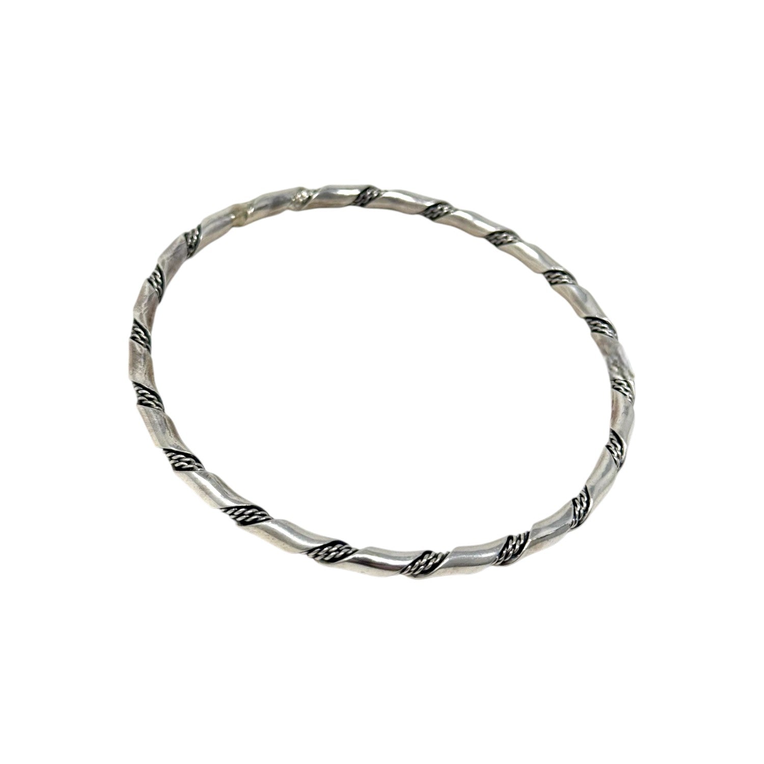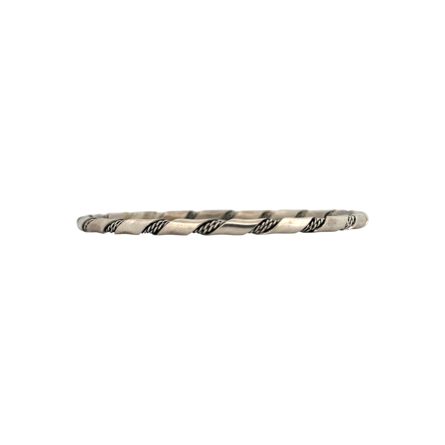 This sterling silver bracelet by Caroline Tsosie beautifully highlights the artistry of Navajo silversmithing. The piece features a distinctive twisted design, blending smooth silver with fine, rope-like details that add depth and texture. The alternating patterns create a sense of rhythm and movement, reflecting the harmony and balance often found in Native design traditions. Each bracelet is carefully handmade, ensuring that no two are exactly alike and each carries its own character. The oxidized accents bring out the contrast in the twisted elements, giving the piece a bold yet refined appearance. Lightweight and versatile, it is perfect for daily wear or as a statement piece layered with other jewelry.