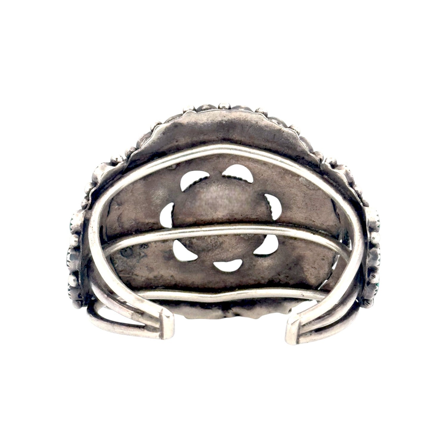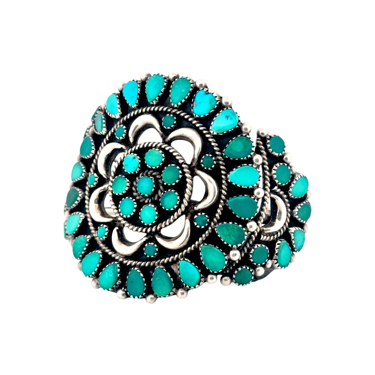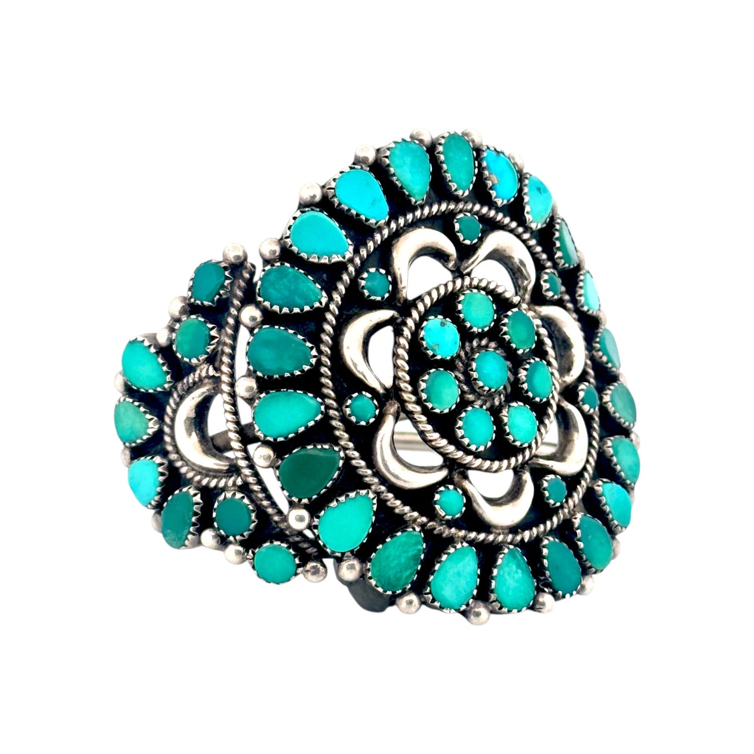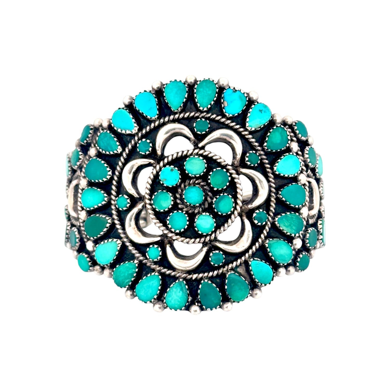 This vintage Zuni bracelet from the 1980’s showcases exquisite cluster work with radiant Kingman Turquoise. Designed in a bold circular motif, the bracelet features dozens of hand-cut turquoise stones arranged in concentric floral patterns. Each stone is set in fine sterling silver bezels, framed by twisted wire and accented with silver drops, creating depth and texture. The turquoise displays vibrant blue-green hues, adding contrast against the darkened silver background. The wide cuff design makes this bracelet a true statement piece while reflecting the artistry and precision of traditional Zuni craftsmanship. Its symmetrical layout and intricate details highlight both cultural tradition and refined skill.