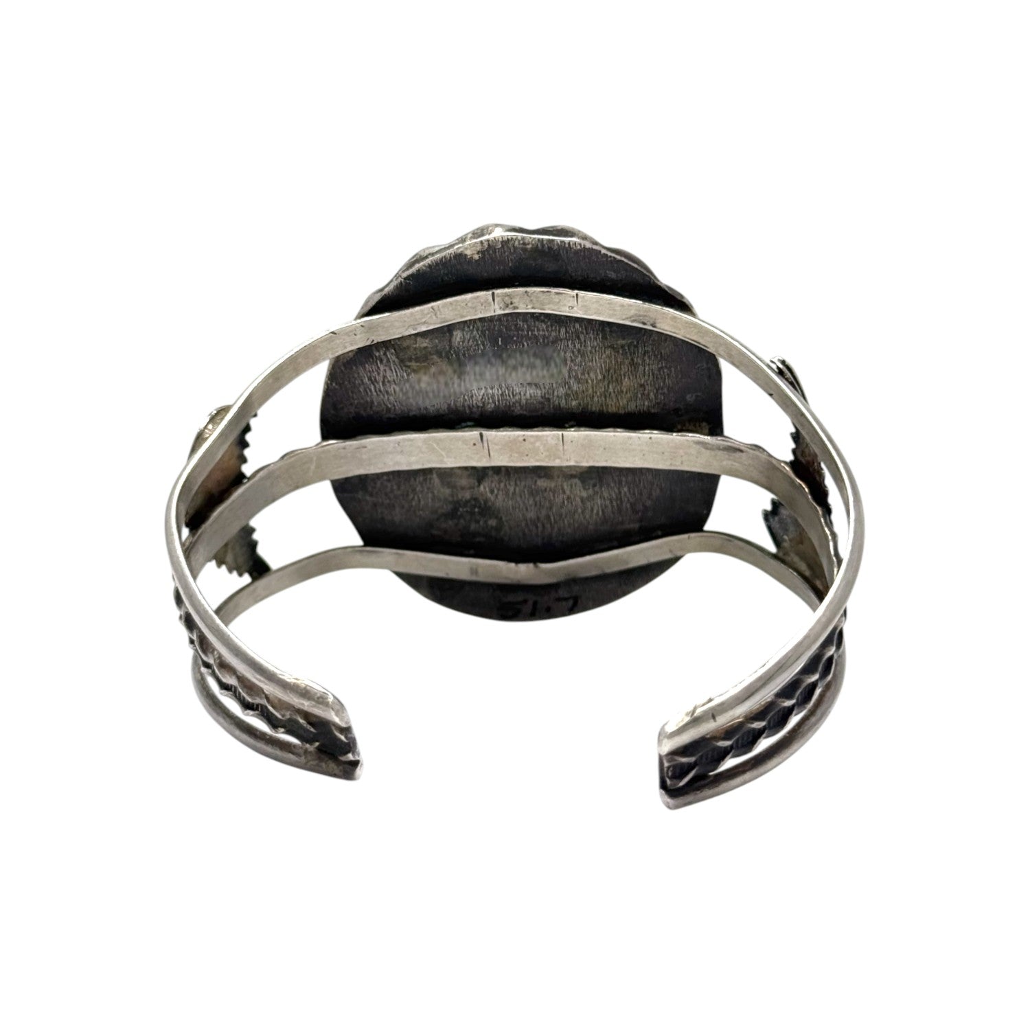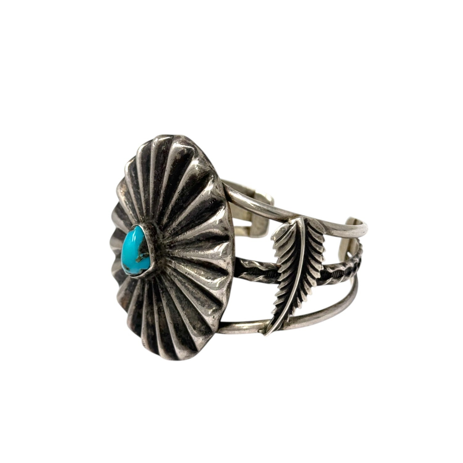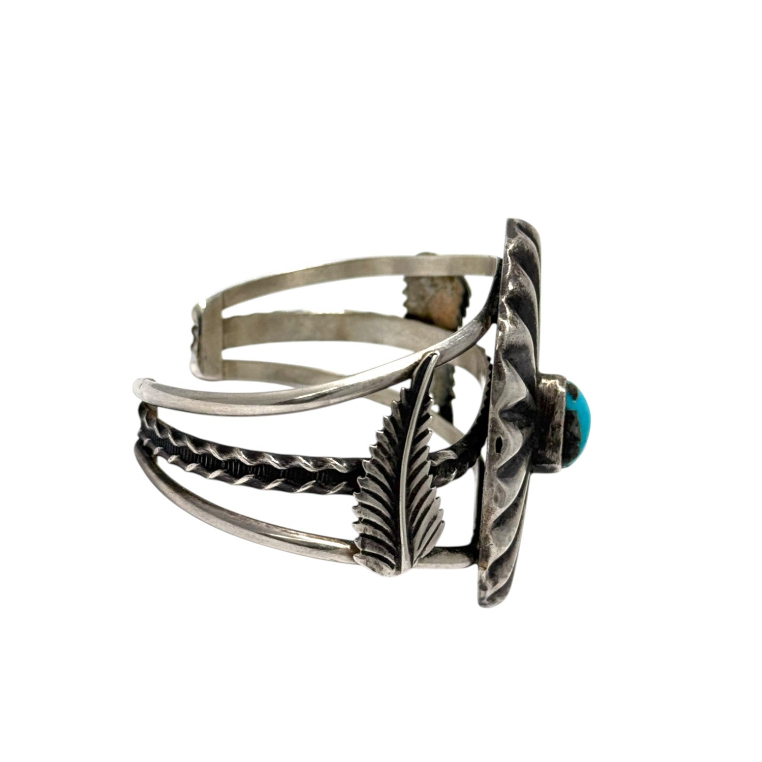 This vintage Navajo bracelet from the 1980s is a bold and radiant expression of classic Southwestern design. At its heart lies a striking piece of natural Nevada turquoise, set within a domed repousse sunburst medallion that radiates dimension and light. The hand-stamped sterling silver cuff features deeply sculpted lines that give the piece a dramatic sense of movement and depth. Flanked by scalloped silverwork and flared terminal accents, the design draws inspiration from both nature and tradition. The turquoise stone, with its vivid sky-blue hue and organic matrix, offers a beautiful contrast to the darkened silver patina.