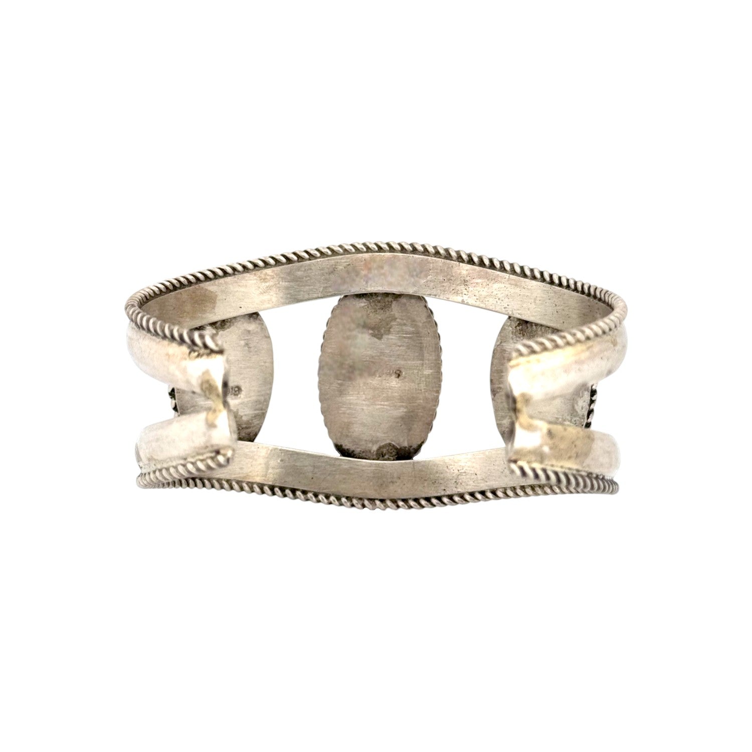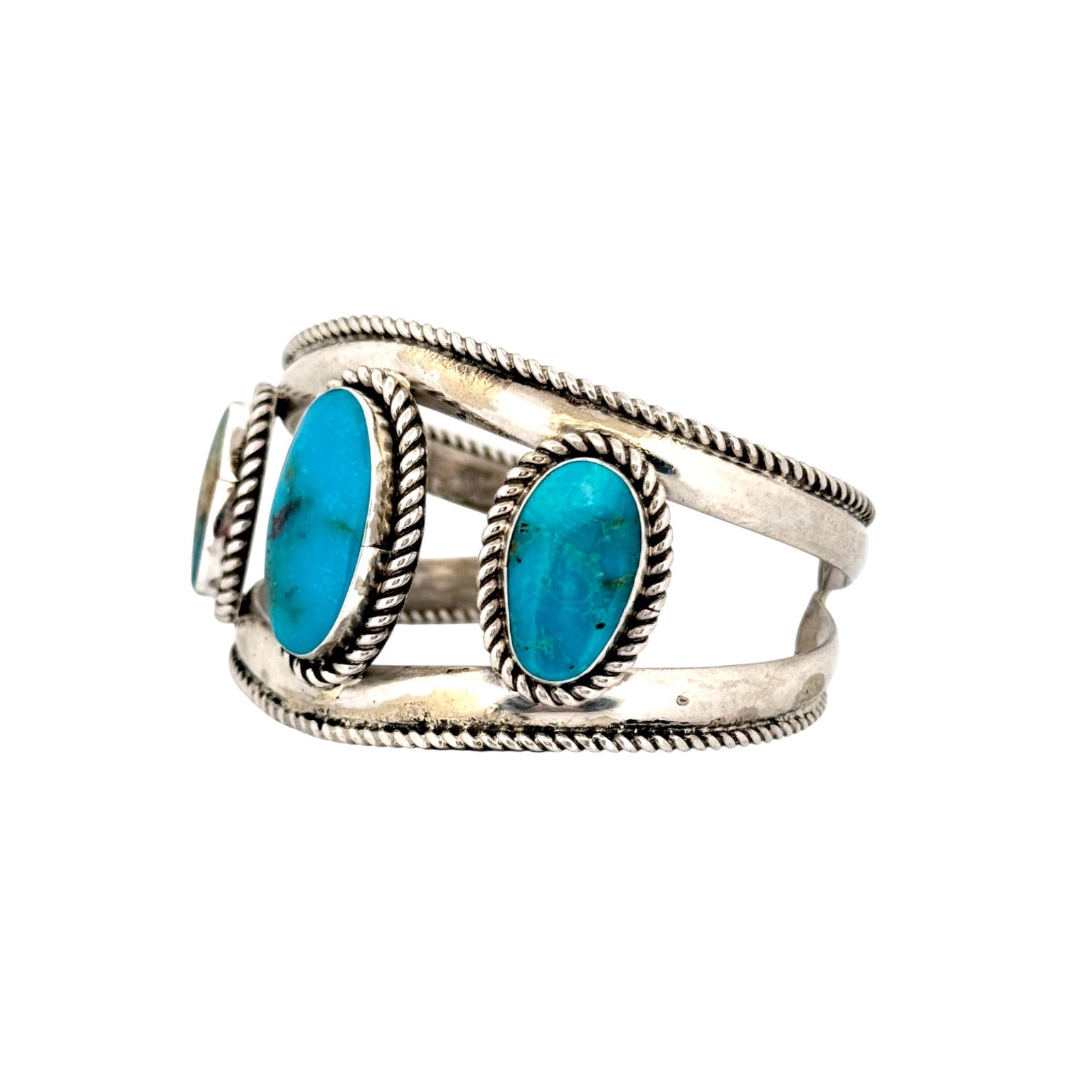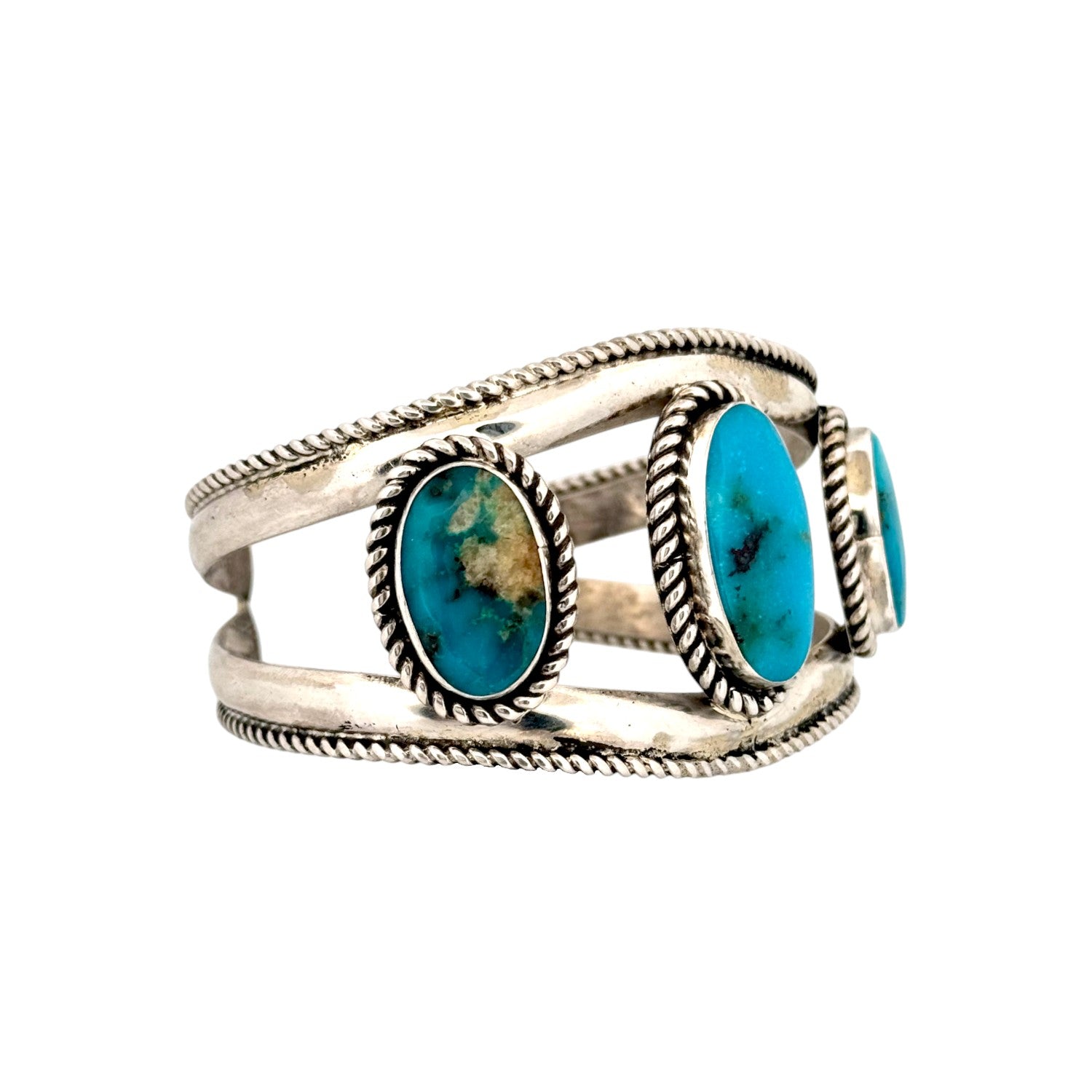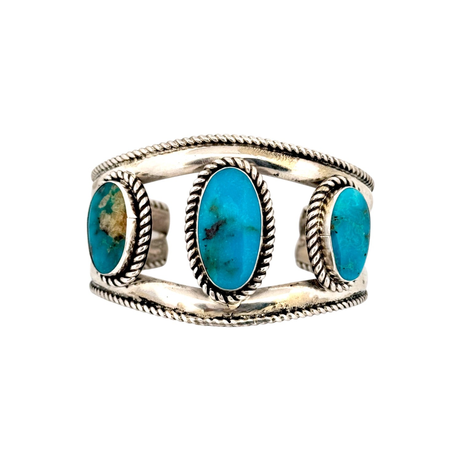 This vintage Navajo bracelet, circa 2000s, showcases the timeless beauty of Turquoise Mountain Turquoise set in sterling silver. The cuff features three oval cabochons, each with vibrant blue tones accented by earthy brown and golden matrix, a hallmark of this celebrated Arizona mine. The stones are set in classic sawtooth bezels and framed with twisted rope detailing, adding depth and dimension. The split-shank design provides balance and comfort while highlighting the turquoise centerpiece. Subtle silver oxidation enhances the natural contrast, giving the piece both character and bold presence. Entirely handmade, the bracelet reflects traditional Navajo silversmithing, blending strength with elegance.